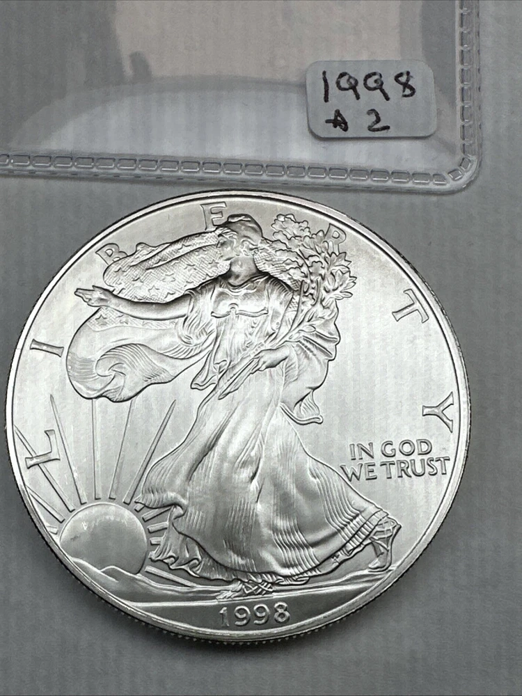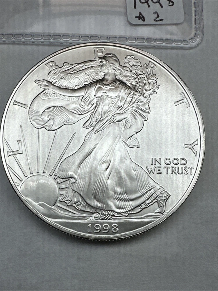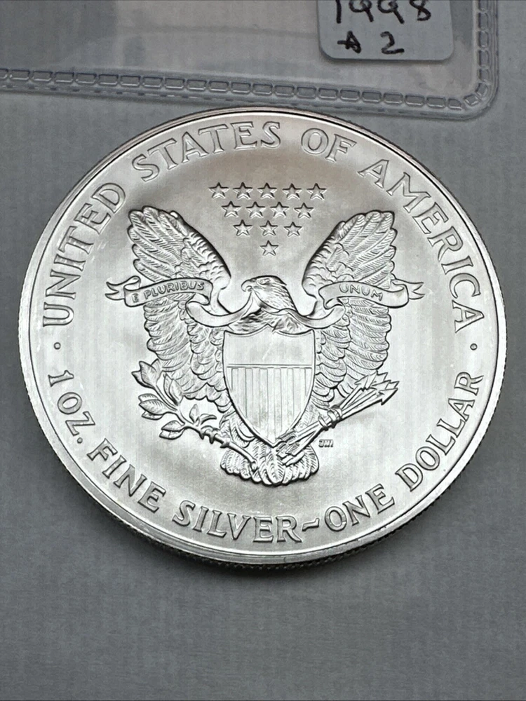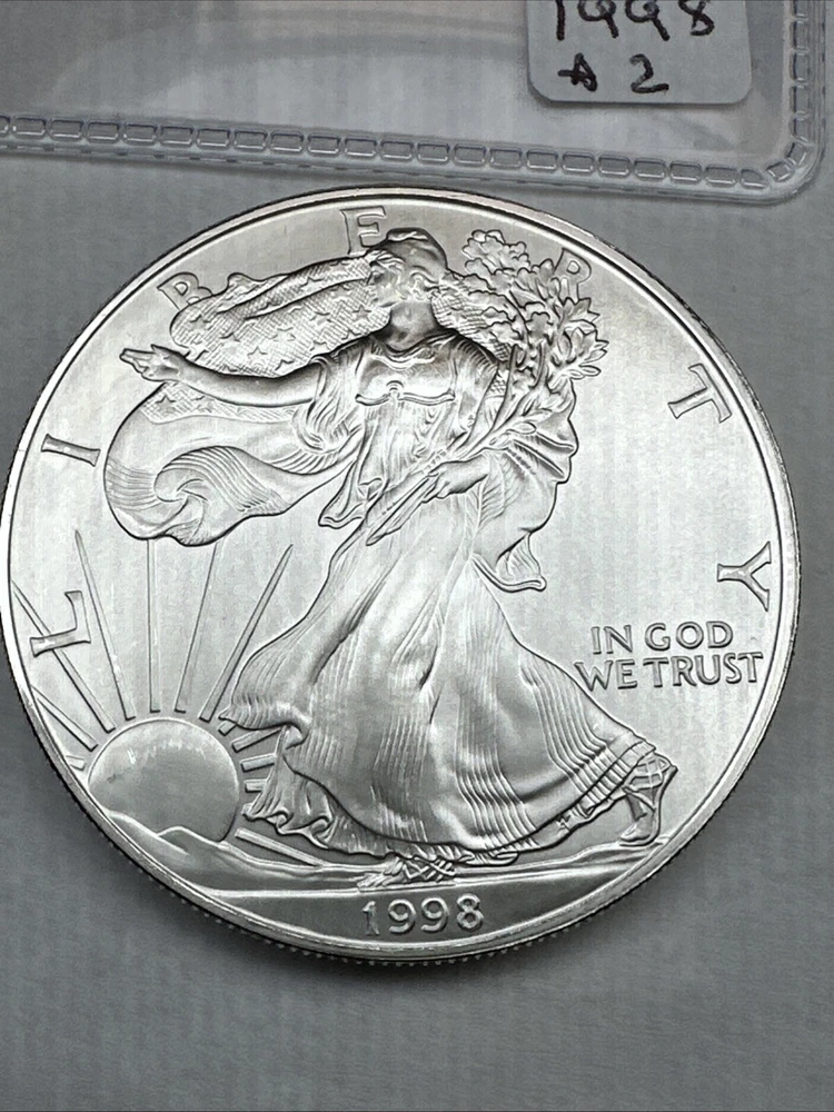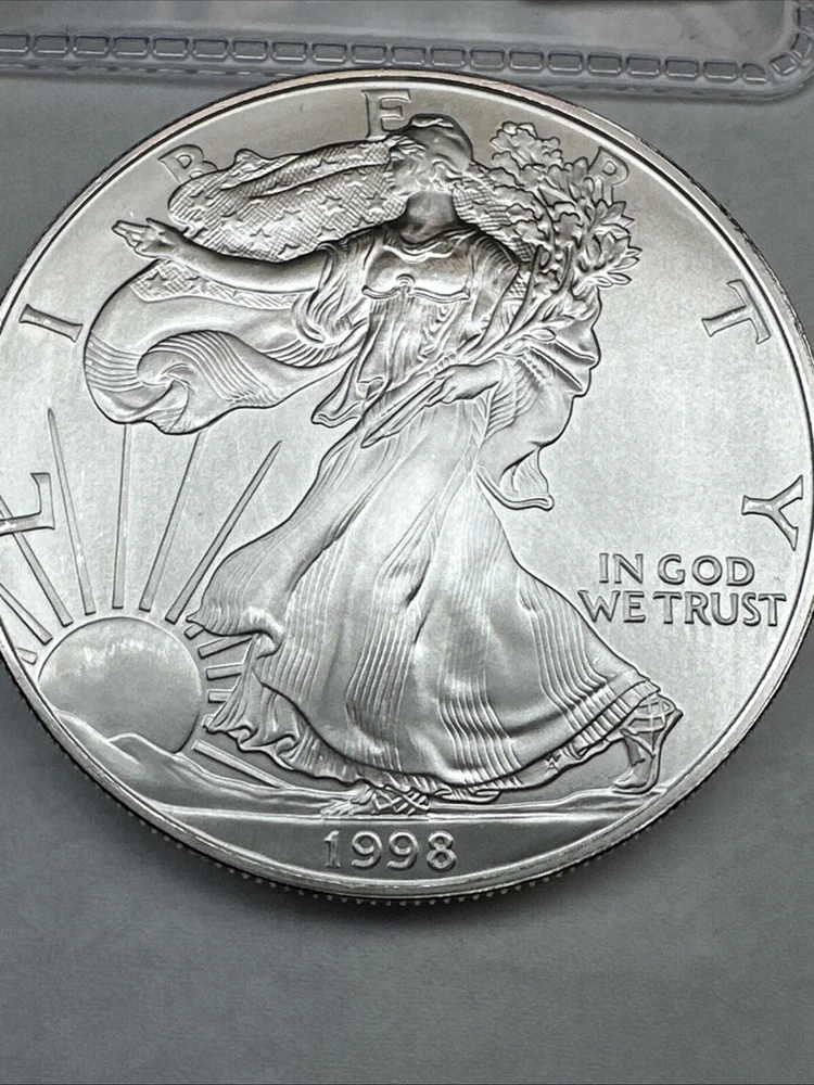 Certification: Uncertified Fineness: 0.999 Precious Metal Content per Unit: 1 oz Composition: Silver Denomination: $1 Coin: American Eagle Strike Type: Business Mint Location: Philadelphia Total Precious Metal Content: 1oz Country/Region of Manufacture: United States Year: 1998 Grade: Ungraded Brand/Mint: U.S. Mint Circulated/Uncirculated: Uncirculated