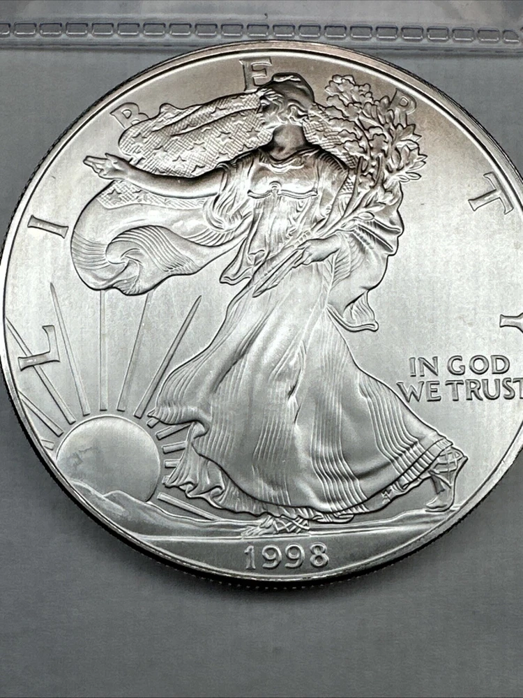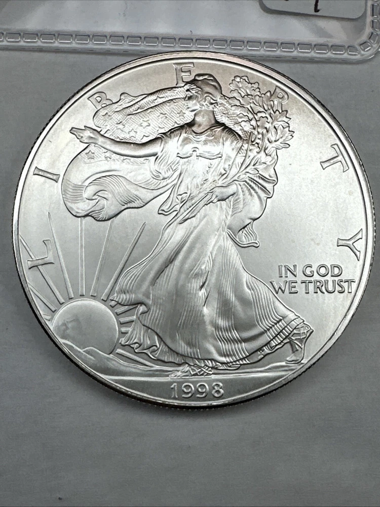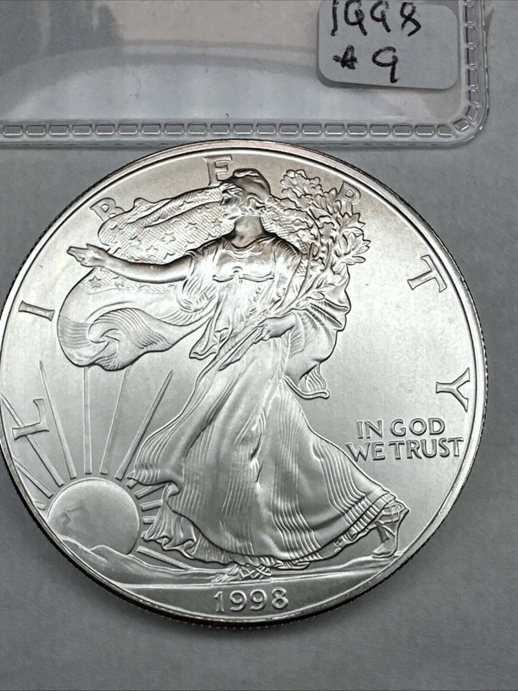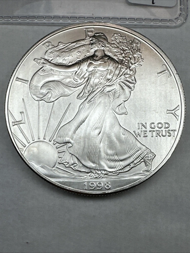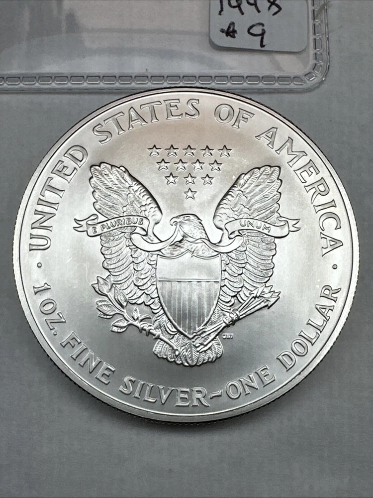 This is a 1998 American Silver Eagle coin minted by the U.S. Mint in Philadelphia. It contains 1 troy ounce of .999 fine silver. The coin features a striking business strike type and is in uncirculated condition. It has a denomination of $1 and is part of the American Eagle series. This coin is a better date variant and is uncertified.