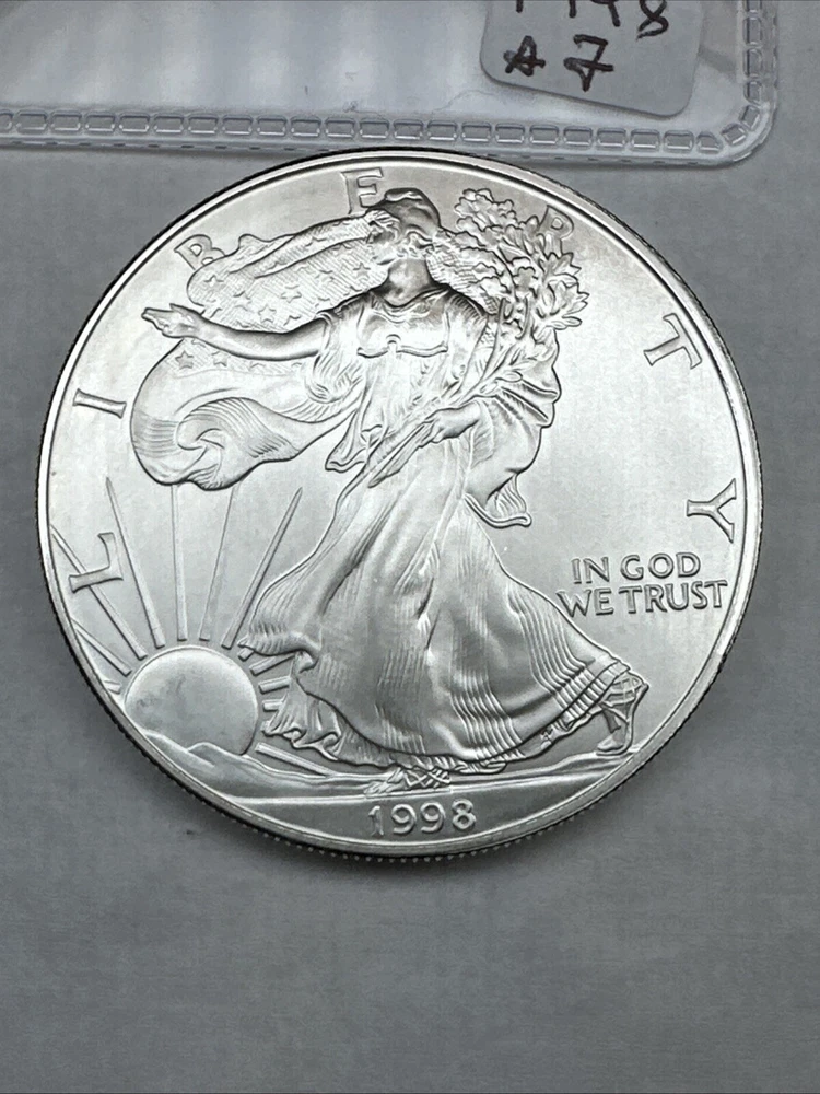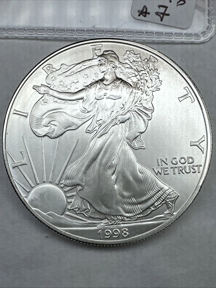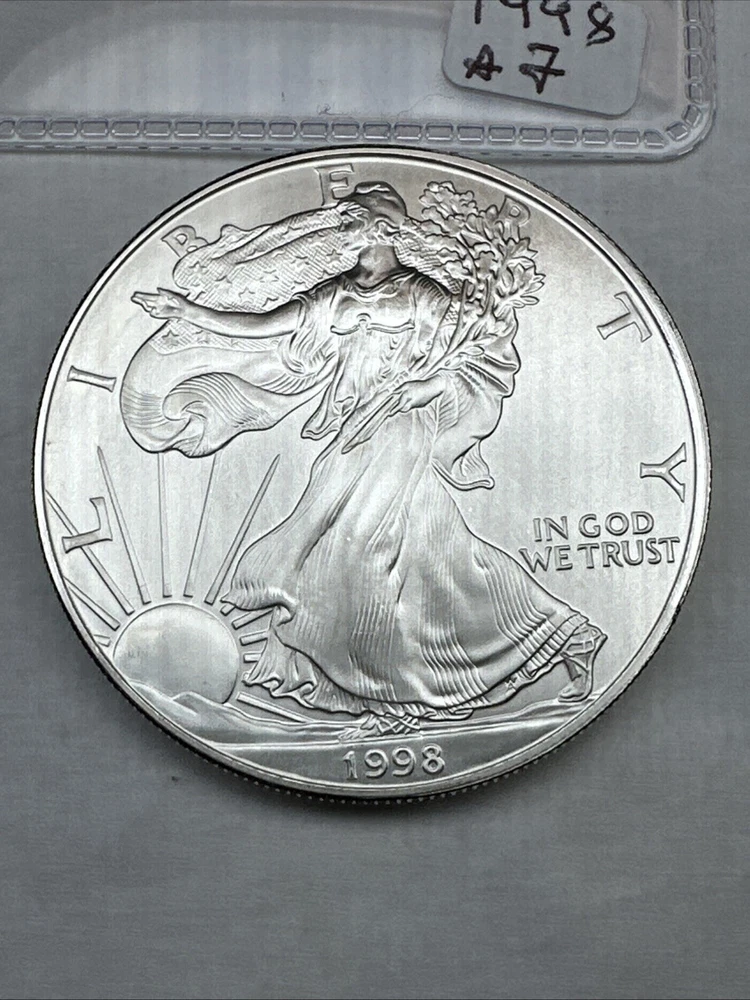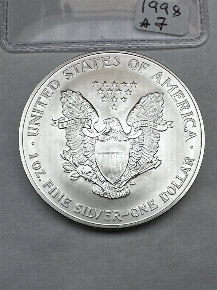 This is a 1998 American Silver Eagle coin minted by the U.S. Mint in Philadelphia. It contains 1 troy ounce of .999 fine silver. The coin features a striking business strike type and is in uncirculated condition. It has a denomination of $1 and is part of the American Eagle series. This coin is a better date variant and is uncertified.