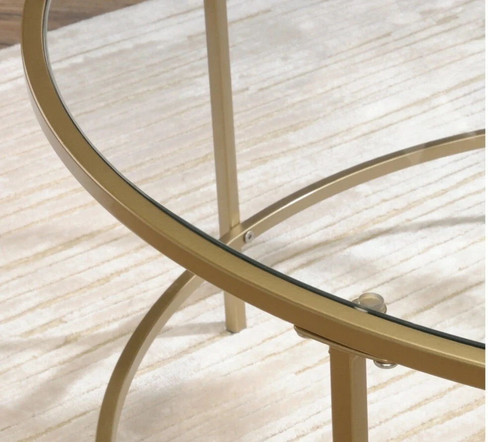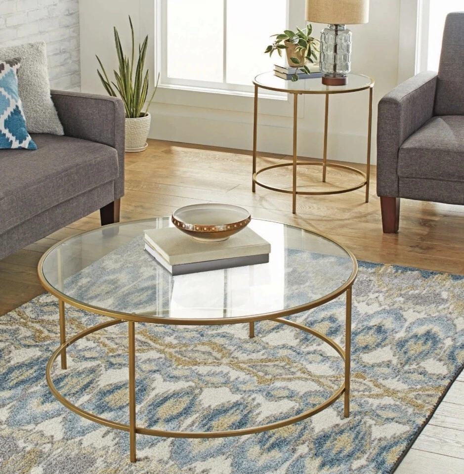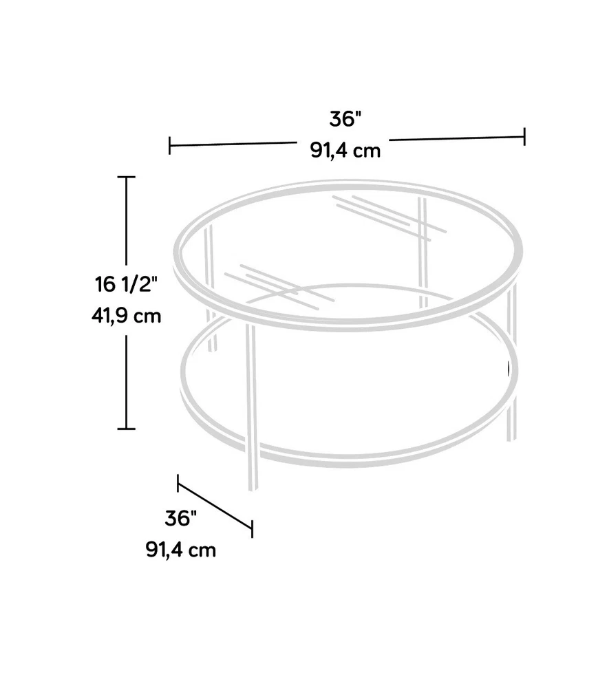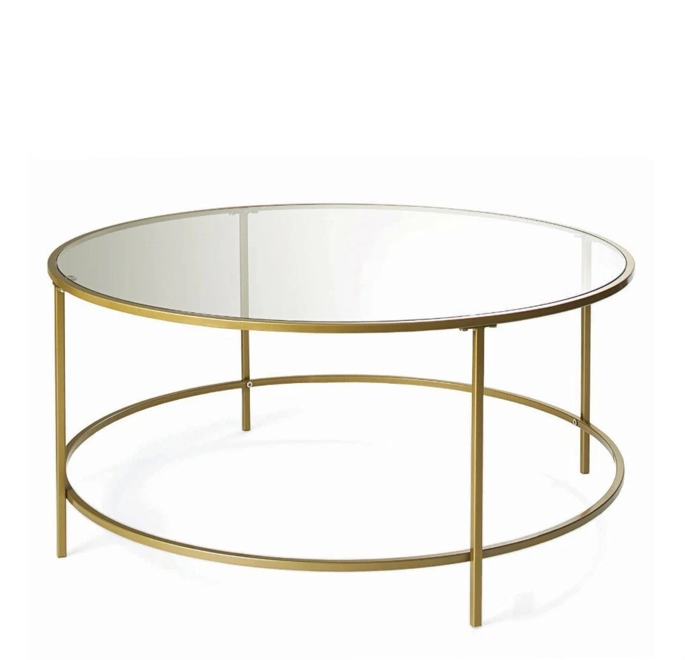 The Better Homes & Gardens Nola Coffee Table features a chic gold-tone metal frame with a modern, minimalist design. Its sleek surface adds a touch of elegance, making it a stylish addition to any contemporary living space. The table is ideal for pairing with various décor styles. See picture for size.