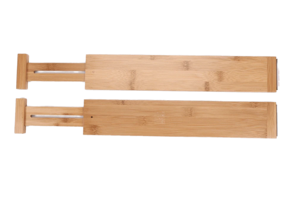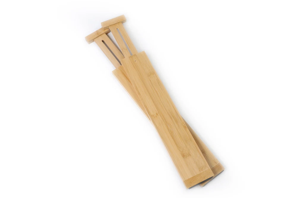 Forget bulky bins or — worse — jumbled messes. These user-friendly dividers will give you an organized, neat home. Adjustable dividers for all kinds of drawers We won’t judge if you fold your laundry hastily. But even if they’re not ruler-straight, you can still smile when you open your beautifully organized drawers. Increase efficiency and organize your mind by keeping your office drawers tip-top neat. As bulky and differently sized as supplies are, they can look great when properly organized with dividers. Natural wooden dividers look custom-made in your cosmetics drawer. Spread them as far or as close together as you need to make eye-pleasing order of the loose items in your drawer. Divide your drawers your own way With these bamboo drawer dividers, you can choose the layout that will work best in your drawer. Space them as far apart or as close together as you'd like, that's the beauty of our non-stationary drawer organizers. ADJUSTABLE LENGTH: If your drawer is anywhere between 17.5" to 22.8", this set of expandable drawer dividers will work perfectly. That’s extra convenient for large drawers, where it gets messy quickly. STRONG SPRING: The drawer separators really bring organization into your home, because they don’t wobble or move out of place. With the spring mechanism and Non-slip mat, the wood dividers stay firmly in place. EASY TO USE: Nothing is complicated. It takes a second to swipe the utensil drawer organizer into your kitchen, bedroom, office or bathroom drawer. And then you have much more organized storage. It's also easy to remove or reposition. STURDY BAMBOO: The bamboo drawer organizer looks gorgeous in your drawer. It’ll actually look like your drawer was custom made. The bamboo kitchen drawer dividers are sturdy and will hold up well with use. TALL DIVIDERS: At 3.1" tall, the bamboo drawer dividers do a great job at separating and organizing your deep drawers. If more height is needed, stack one on top of the other. Enjoy organized, good-looking drawers through your Bamboo adjustable bamboo drawer dividers. Curb the mess in your kitchen, bathroom, office or dresser drawers. They’re attractive, sturdy and stay in the place where you put them.