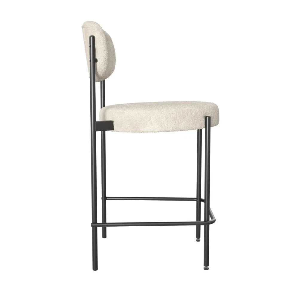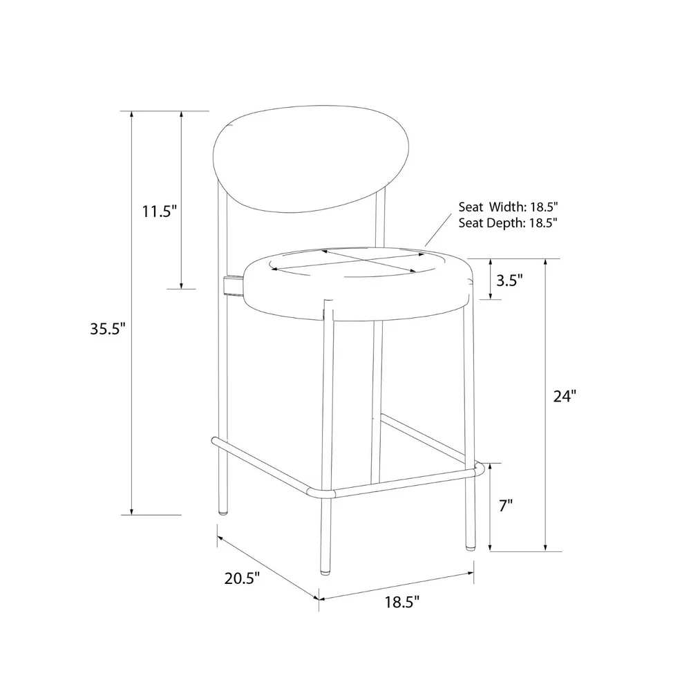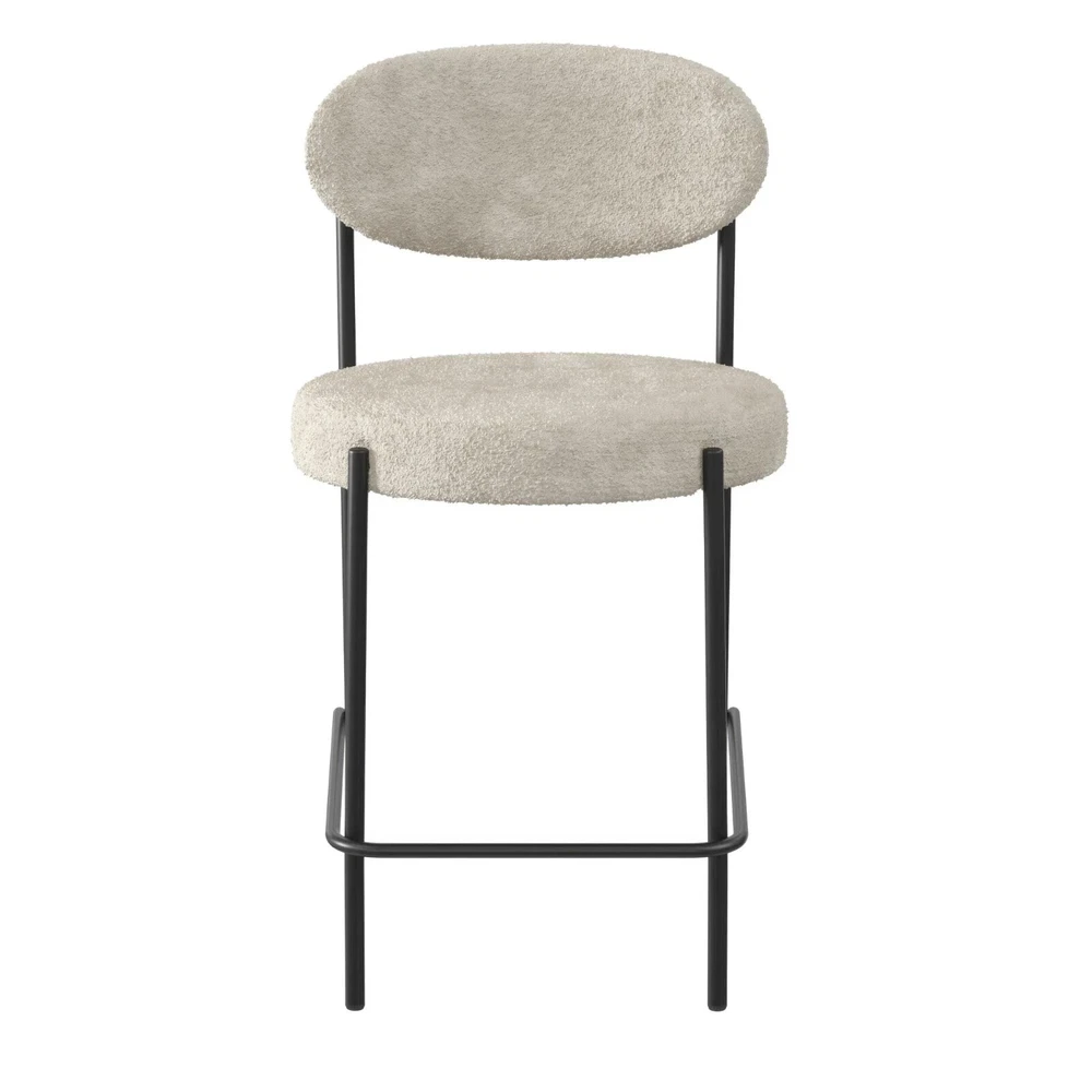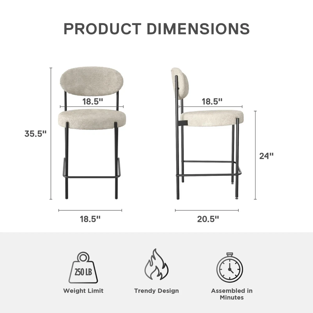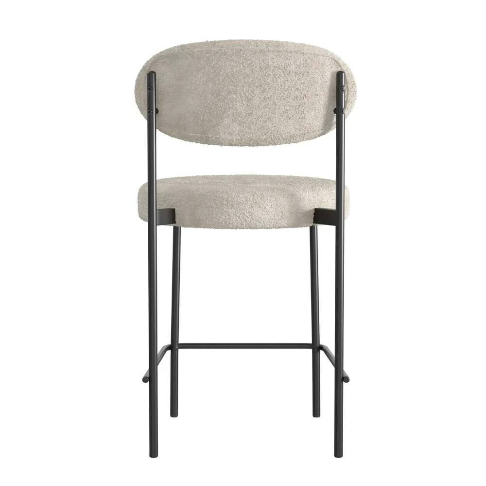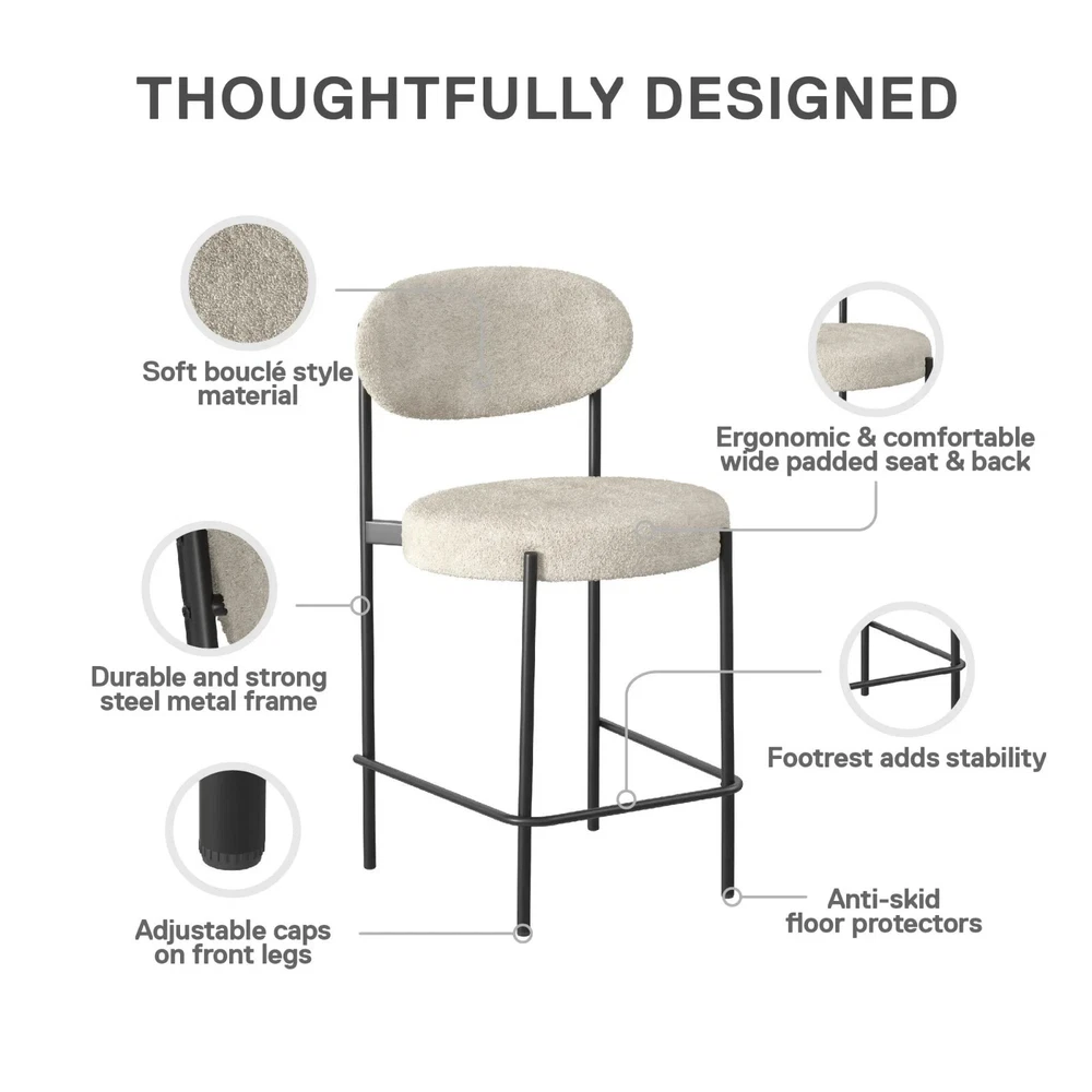 Let the Better Homes and Gardens 24-Inch Boucle Counter Height Stool reinvigorate your routine. Designed with a rounded seat and high curved back, this ergonomic barstool provides exceptional seating support for your counter-height dining room table, kitchen island, or entertainment room bar. The matte black finish on the strong steel frame adds a layer of timelessness, while the Sherpa soft boucle fabric upholstery made from durably resistant polyester brings a cozy element to your space. The 3.5-inch-thick seat, padded with high-density foam, ensures optimal relief for extended sitting. Not only does this counter stool boast midcentury style and modern comfort, but it also features back leg anti-skid caps to protect floors against scratches, front leg adjustable height gliders to prevent wobbling, and footrest bars to offer stability. With a quick 15-minute assembly time and all necessary tools provided, you will be ready to use the stool in no time flat. Sold individually. SHERPA SOFT: Our luxe boucle fabric upholstered and cushioned 24-inch counter-height stool sports ergonomic design featuring a high curved back for ideal support and wide 3.5-inch-thick seating to sink into for kitchen island or dining bar comfort MIDCENTURY MODE: The matte black steel metal frame with secure footrest bars at the bottom and high-density foam padded round seat backed by a strong wood base not only draw your eye to impeccable modern style but to the durable build of the barstool ADJUSTABLE GLIDERS: Back leg anti-skid plastic caps help your floors from getting scuffed or scratched when moving the stool while adjustable height gliders on the front legs keep your stool level on surfaces to prevent wobbliness and offer stability SPEEDY ASSEMBLY: Set aside only 15 minutes to put this item together. All parts, tools, and easy-to-follow instructions are included in box. Wipe polyester-based material clean with a damp cloth, but avoid excessive rubbing to maintain boucle texture SLEEK SIZE: Counter-height stool profile: 18.5"L x 20.5"W x 35.5"H. Seat dimensions: 18.5"W x 18.5"D x 24"H. Weight limit: 250 lbs. Net weight: 14 lbs. 1-year limited warranty. Sold individually. Matching dining chairs available (not included) Brand Better Homes & Gardens Assembled Product Weight 12.44 lb Color Cream Recommended Room Indoor Material Metal Assembled Product Dimensions (L x W x H) 20.90 x 18.70 x 35.40 Inches