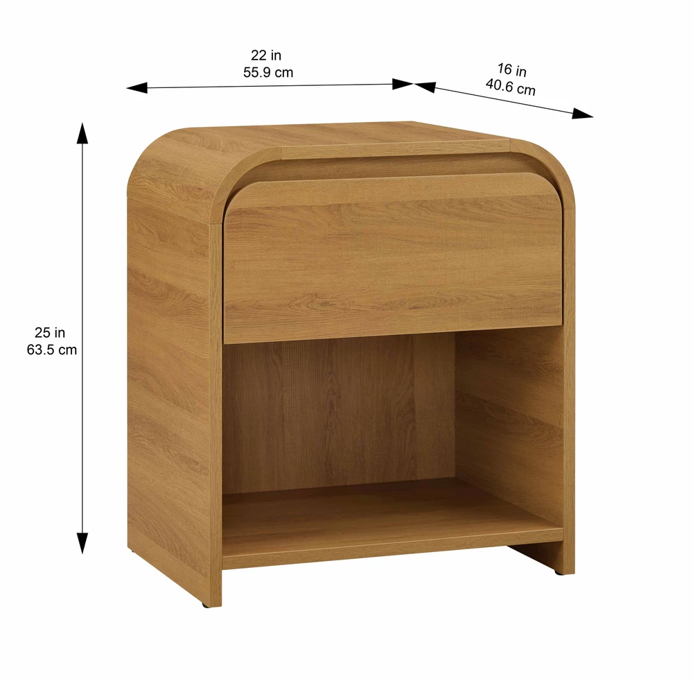 Add a modern touch to your bedroom with the Better Homes & Gardens Juliet Nightstand. It make you get the look and feel of real wood without the high price tag. Along with a great place to put a reading lamp or alarm clock, the Nightstand also features a drawer where you can store reading glasses, pens and paper, or your cell phone. The durable metal slide makes opening and closing the drawer easy and smooth. A small cubby at the bottom of the Nightstand is a handy space to keep your books and magazines. Finish your room with this Better Homes & Gardens Juliet Nightstand. This Nightstand ships flat to your door and requires assembly upon opening. Two adults are recommended for proper assembly. The top shelf and bottom cubby can hold up to 40 lbs. and the drawer can hold 15 lbs. Assembled dimensions are 22"H x 16"W x 25"D. Ample Storage Capacity - Make the most of your storage options with this unique Better Homes & Gardens Juliet Nightstand. Featuring 1 big drawers, this engineered wood nightstand provides the perfect solution for keeping shirts, socks, hats, diapers, toys and more neatly organized for all your storage needs. MULTIPURPOSE - An excellent addition to any bedroom, living room, hallway, entryway and office, this nightstand is versatile and adaptable. MODERN STYLE - This nightstand is the ultimate addition to any modern home decor. With its light honey color, this nightstand is sure to stand out in any room. EXCELLENT CRAFTSMANSHIP - This nightstand is made of 15mm MDF material with quality metal glides to ensure superior durability and smooth functionality. ASSEMBLY REQUIRED - With clear instructions and labeled parts included in the package, you can install this nightstand easily. On Feb 18, 2025 at 21:38:41 PST, seller added the following information: