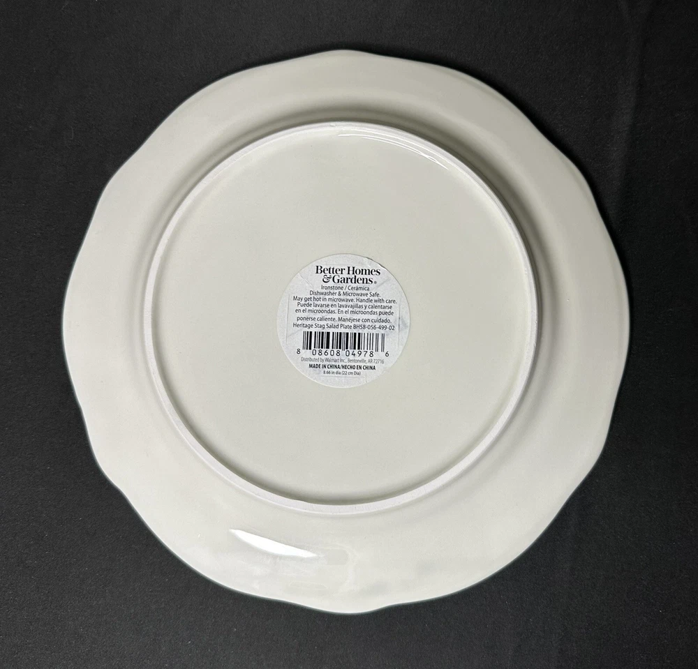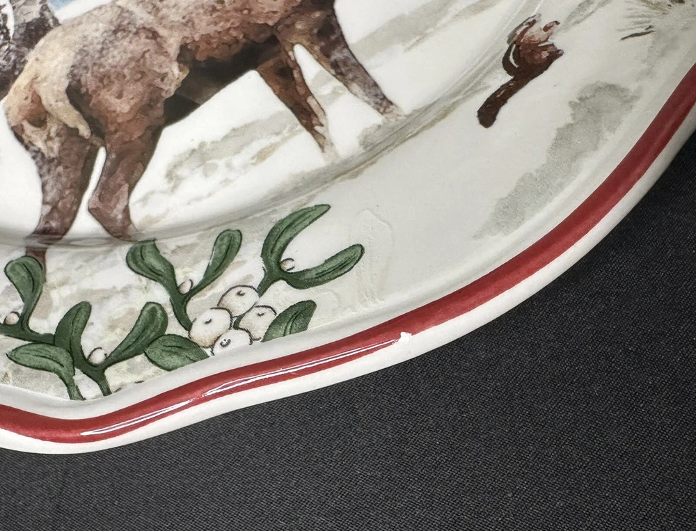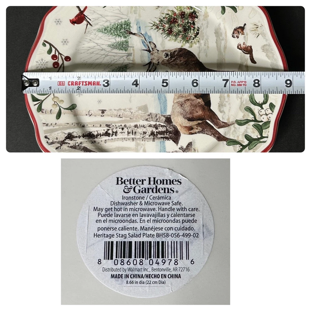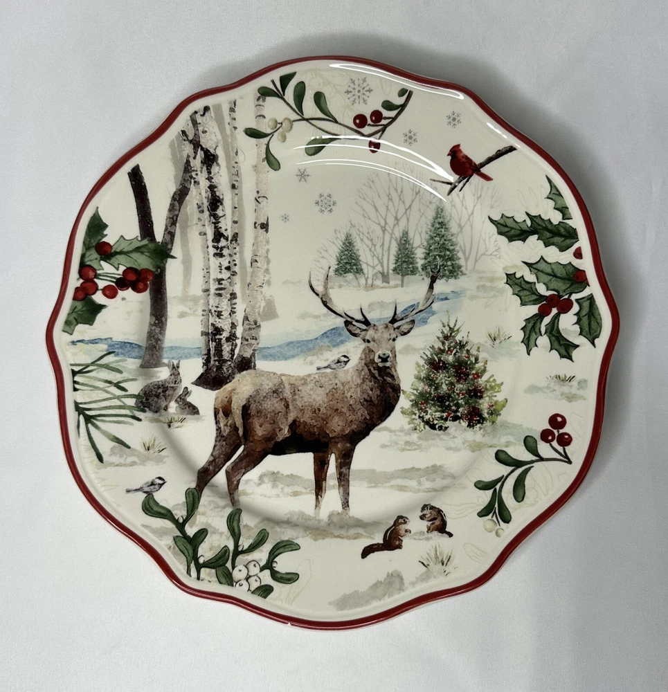 Better Homes & Gardens Winter Forest Buck Salad Plate. Approximately 8 7/8” wide. A CHIP is noticeable on the frontside red trim (no additional signs of use are noticeable). Please see photos for details.
