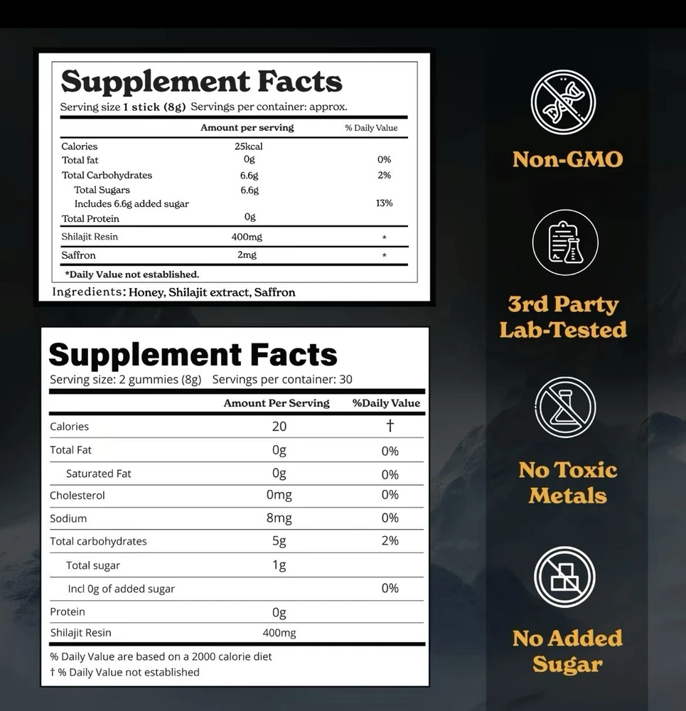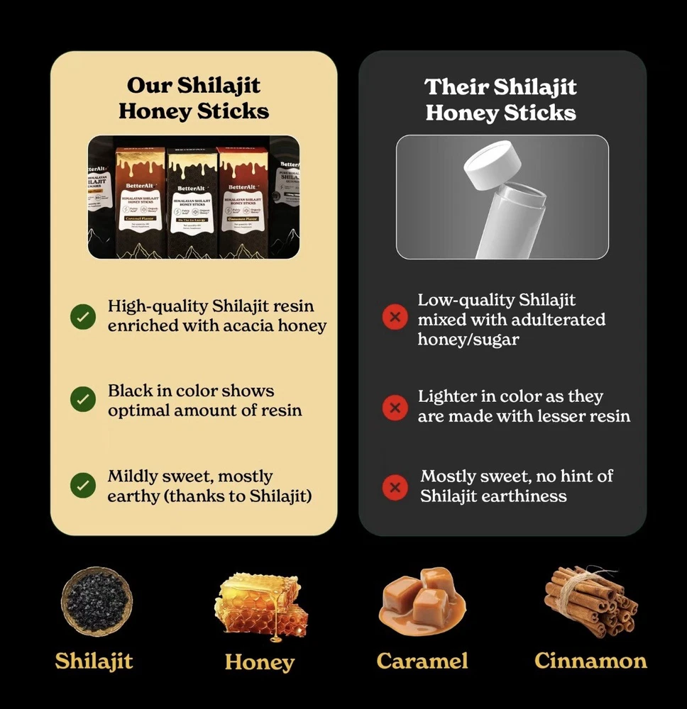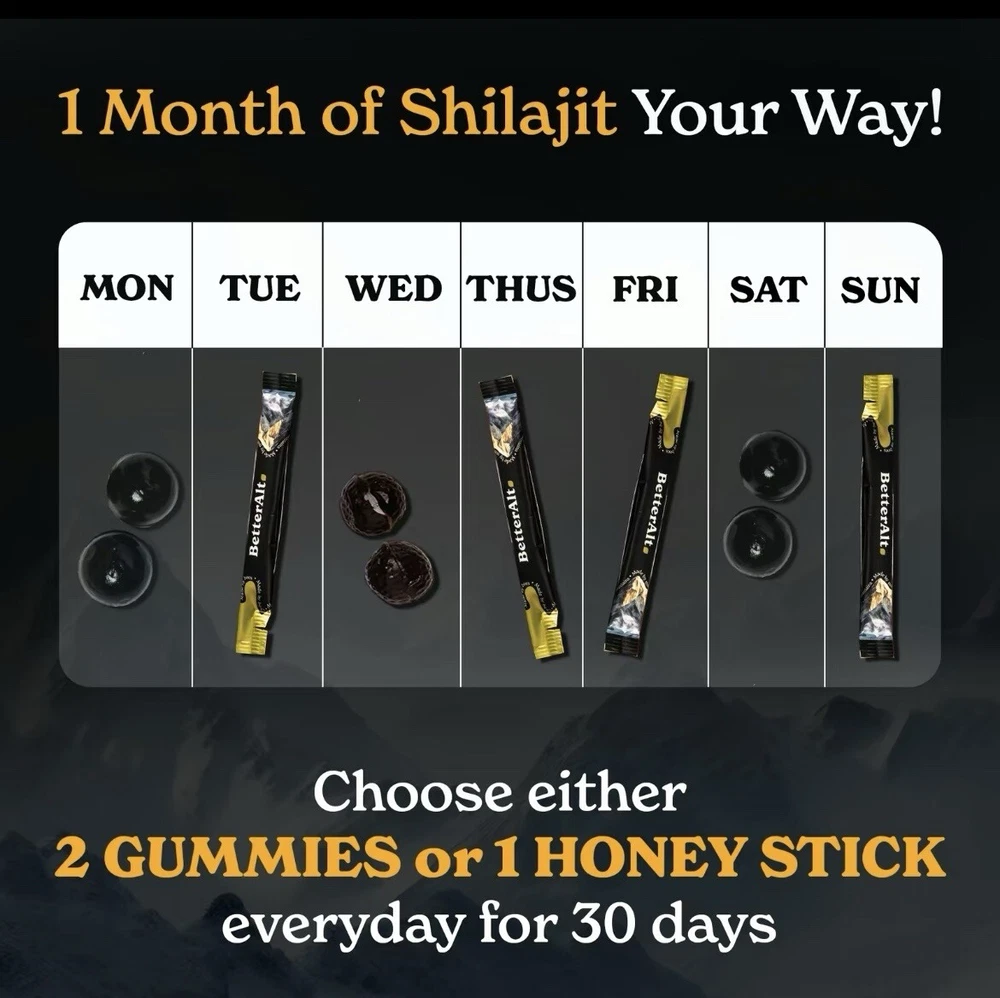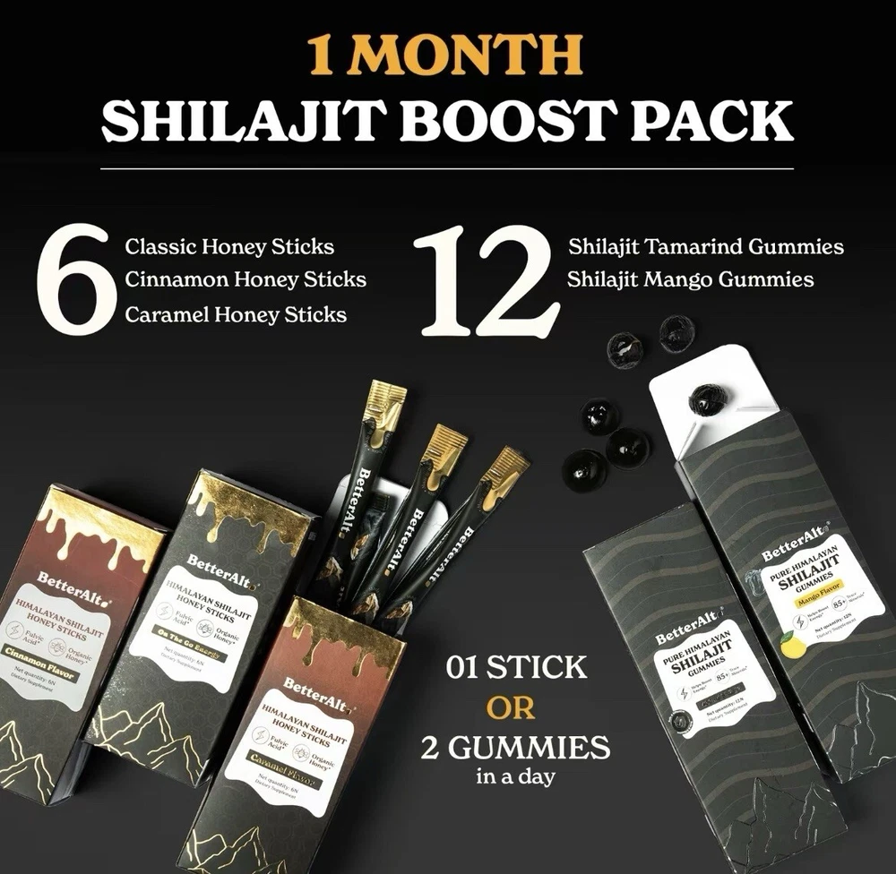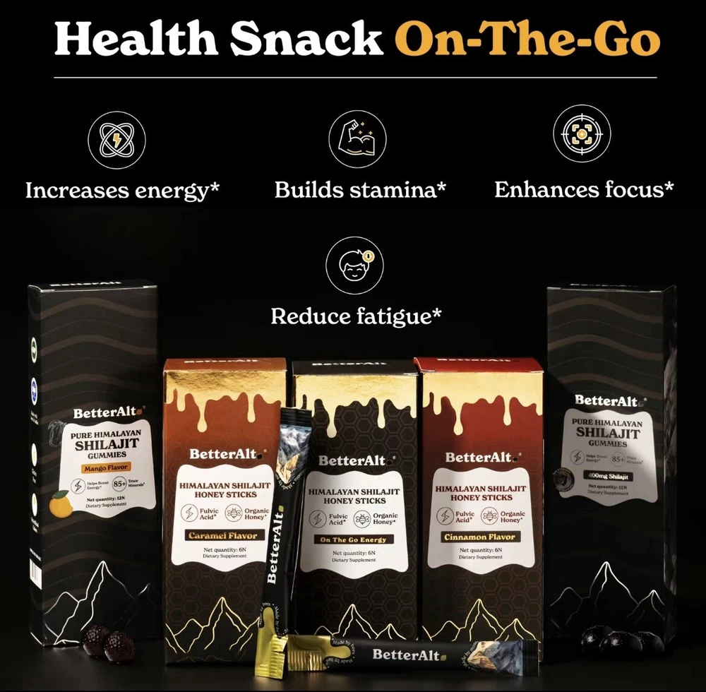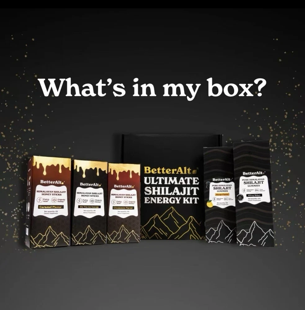 Boost Your Energy Naturally – BetterAlt Shilajit Energy Kit Power up with the BetterAlt Shilajit Energy Kit, featuring honey, cinnamon, and caramel sticks alongside two delicious gummy flavors. This one-month supply is packed with pure shilajit to enhance stamina and vitality. The beautifully designed packaging makes it a perfect gift, and with multiple flavors, you can easily find your favorite! Stay energized—try the BetterAlt Shilajit Energy Kit today!
