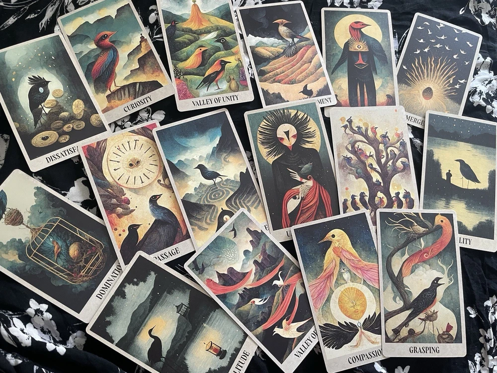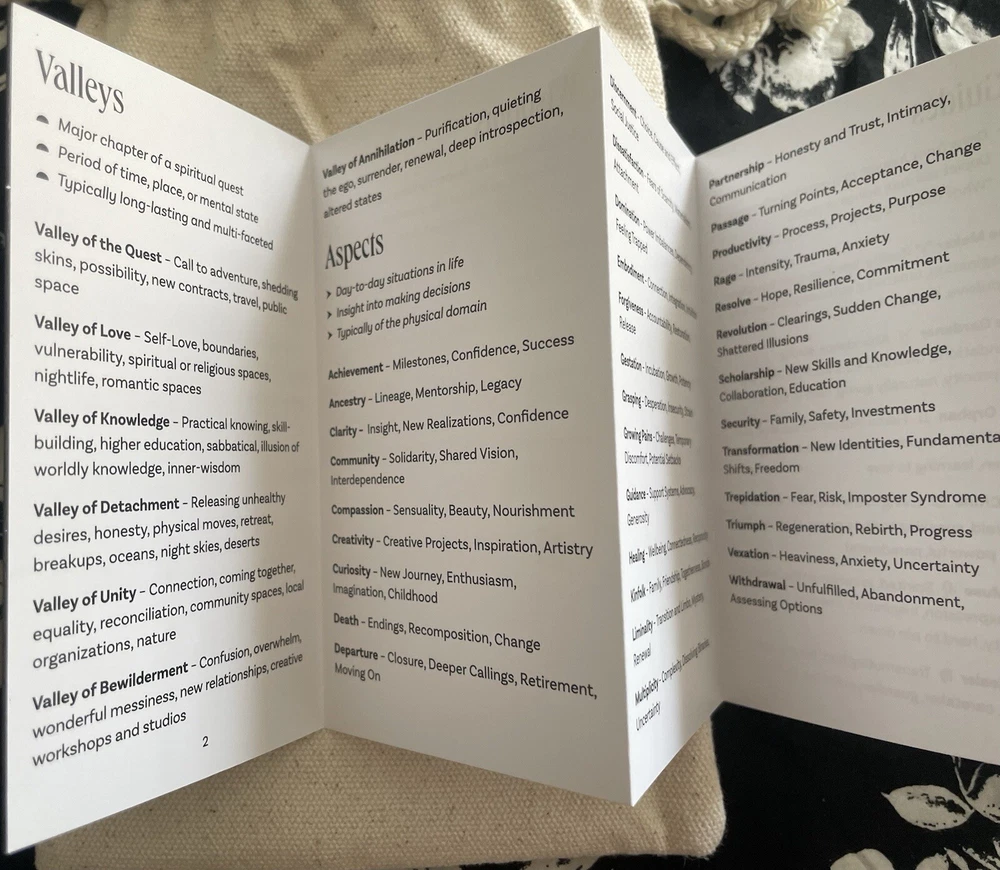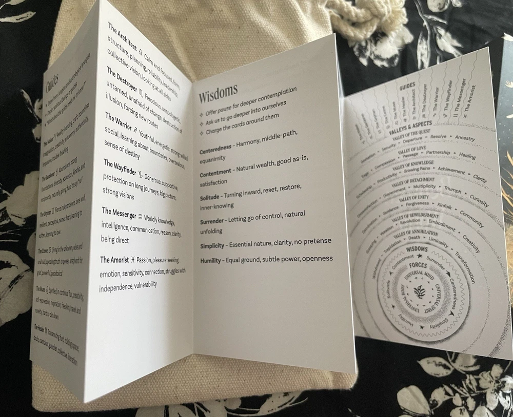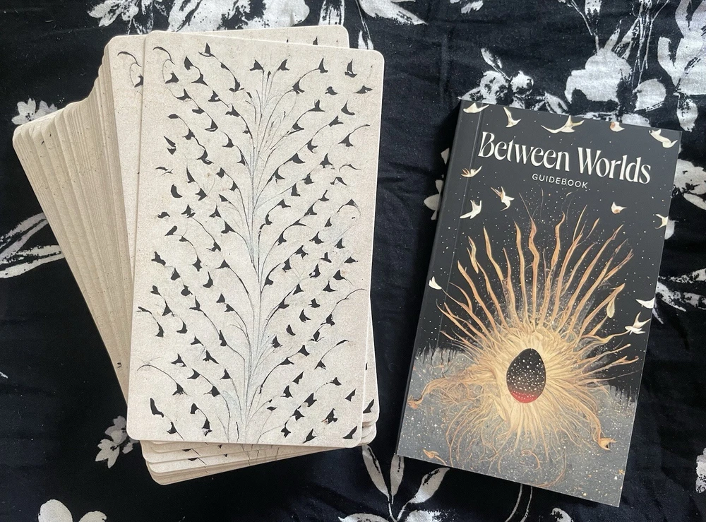 Between Worlds Oracle Deck With Pouch/OOP. This is a sold out OOP 64 card Oracle deck with quick reference guide as well as a complete guide book and storage pouch. The cards are a smooth matte finish. This is a new deck that I have only looked through to take pictures of. There are interesting facets to this deck touching on inner world, outer, physical and spiritual all depicted in a bird theme. Beautiful and unique cards. The booklet includes descriptions of the cards as well as spreads you can work with if you choose. Each card has an indicator word at the bottom. You may go by the guide book of meanings or come up with what best suits your intuition. The deck and booklet is housed in a hardcover box. Any questions feel free to ask. Thank you :)