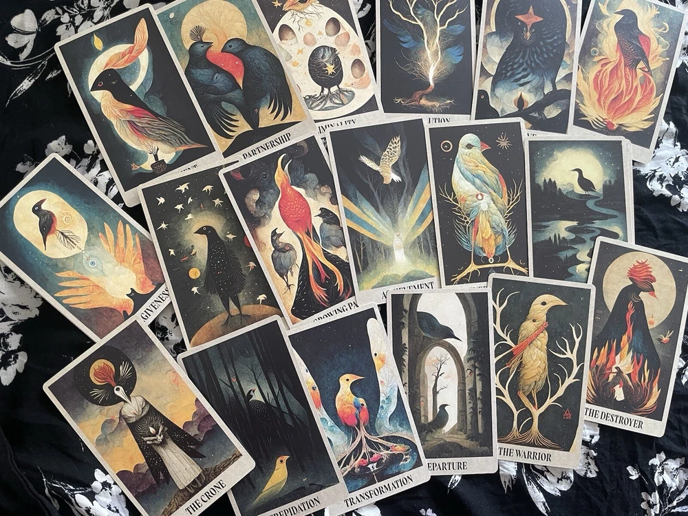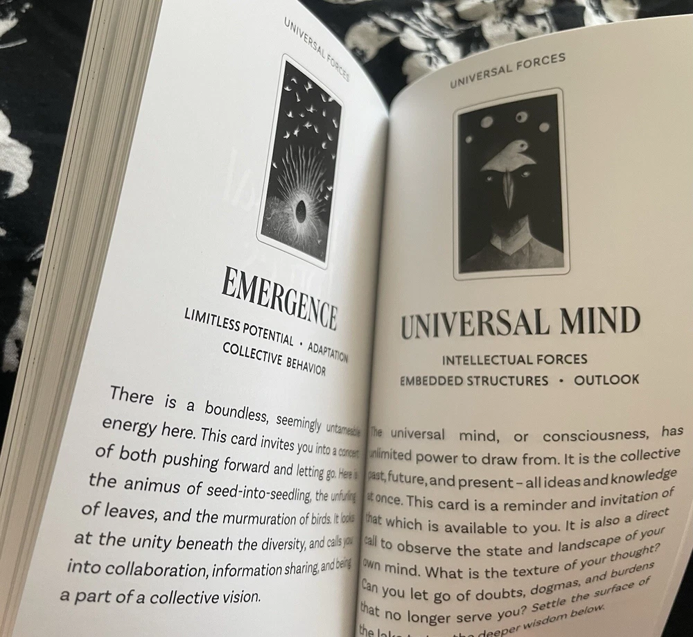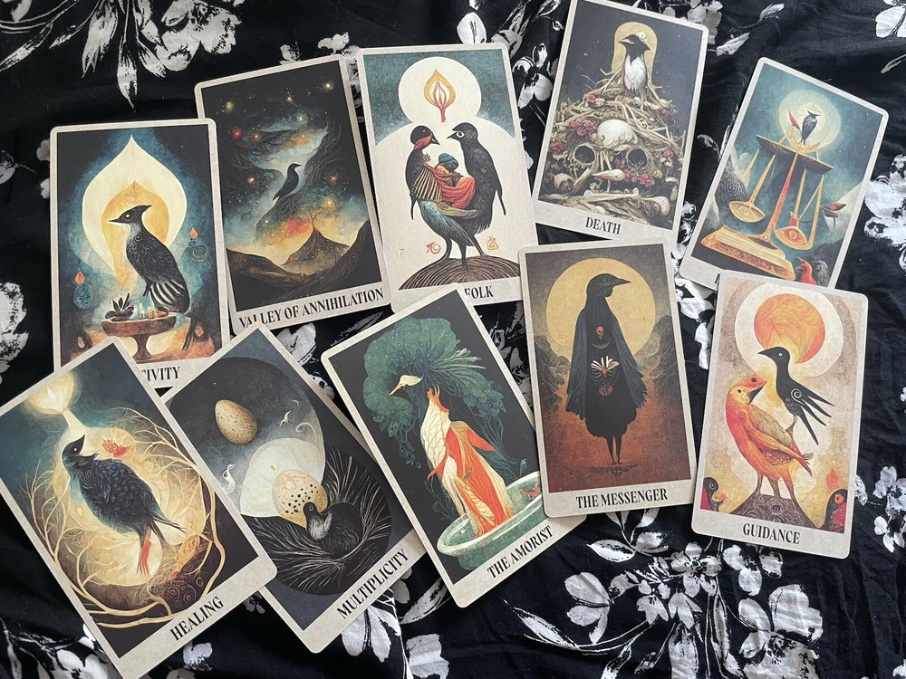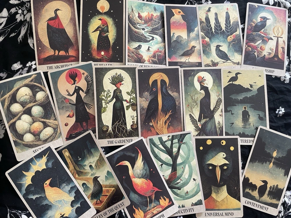 Between Worlds Oracle Deck With Pouch/OOP. This is a sold out OOP 64 card Oracle deck with quick reference guide as well as a complete guide book and storage pouch. The cards are a smooth matte finish. This is a new deck that I have only looked through to take pictures of. There are interesting facets to this deck touching on inner world, outer, physical and spiritual all depicted in a bird theme. Beautiful and unique cards. The booklet includes descriptions of the cards as well as spreads you can work with if you choose. Each card has an indicator word at the bottom. You may go by the guide book of meanings or come up with what best suits your intuition. The deck and booklet is housed in a hardcover box. Any questions feel free to ask. Thank you :)