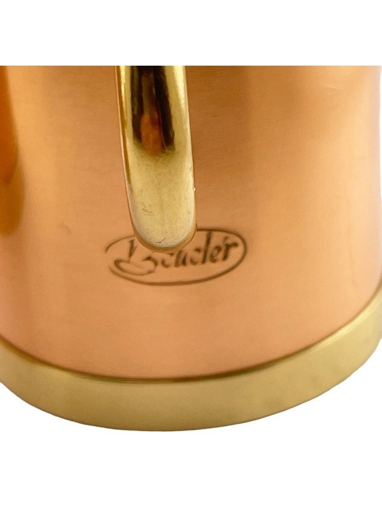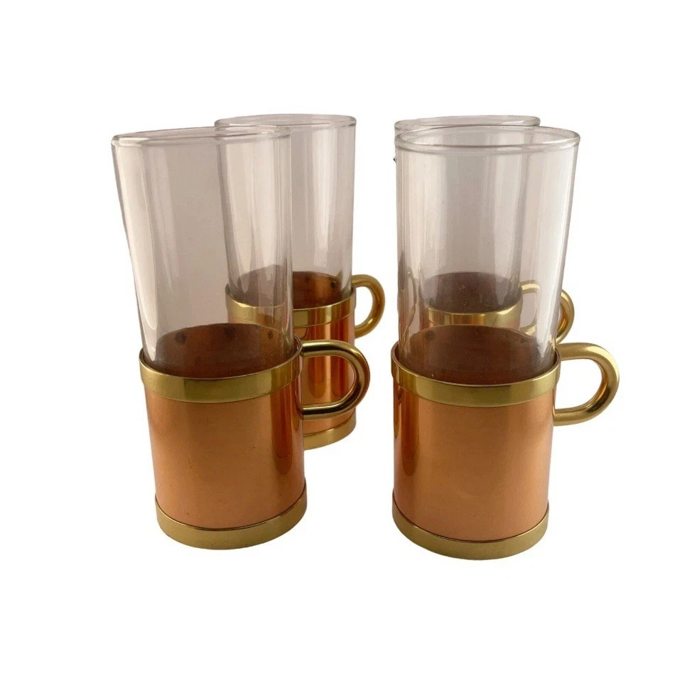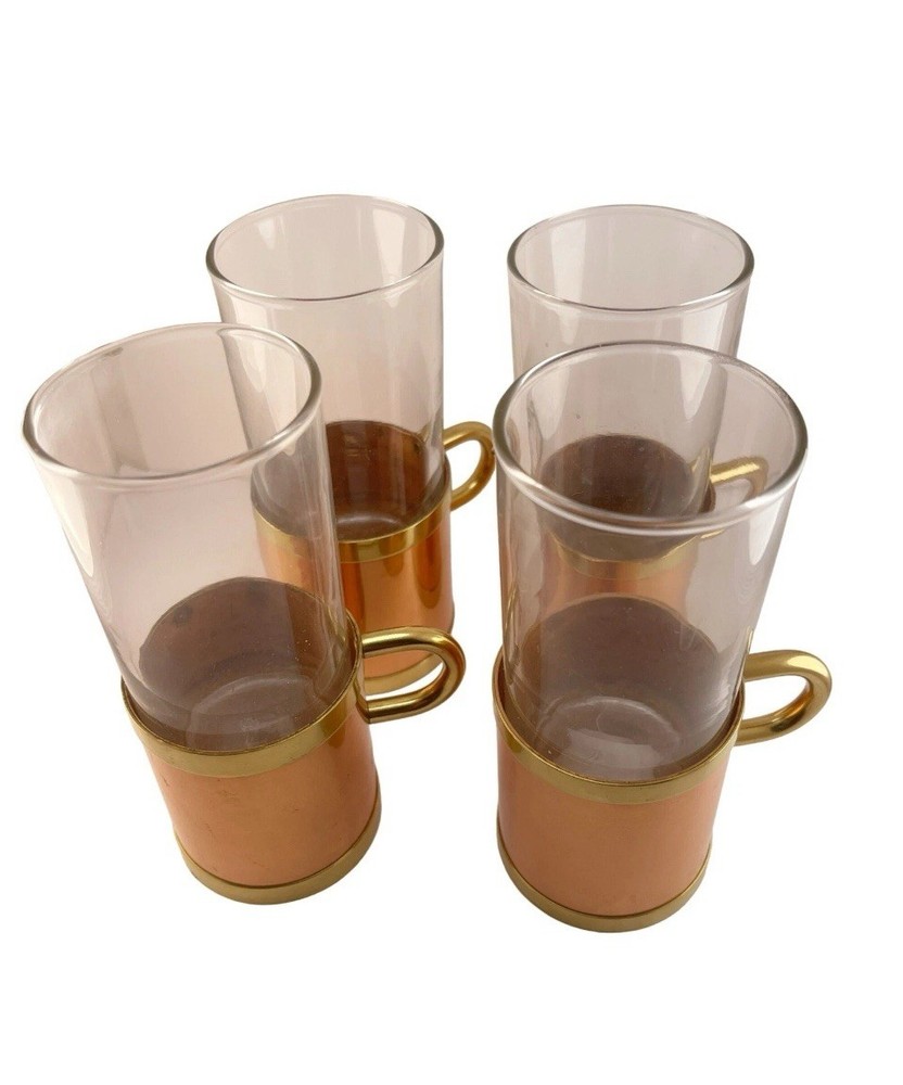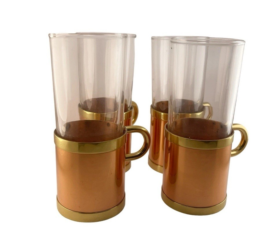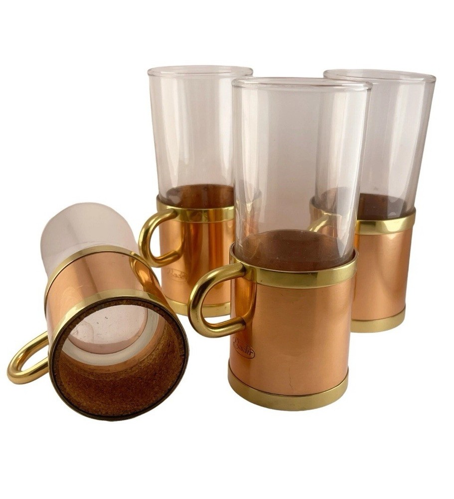 The Beucler Copper Set of Four and Brass Irish Coffee Russian Tea Glasses is a luxurious addition to any collection or kitchen. Made from brass and copper, these collectible tea glasses are not only stylish but also functional. The set includes four tea glasses, perfect for serving your favorite hot beverages in style. The gold color and intricate designs make these glasses a standout piece for any home. *The interior liner is a cork like material to keep the glass in place. One has tiny chip in cork but it is inside so it cannot be seen and has no affect on use what so ever. Otherwise they are in VERY good used condition. The two metals look gorgeous together!!!