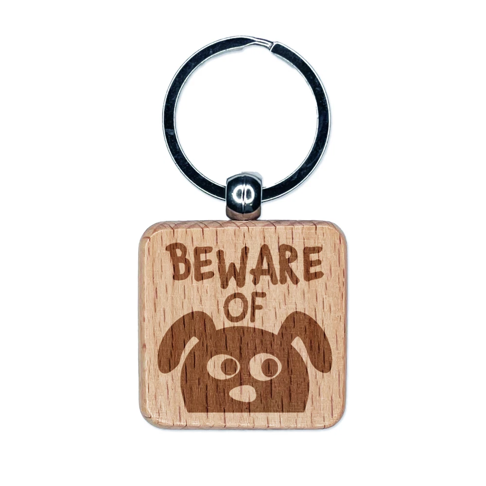 Beware of Dog Funny Doodle Engraved Wood Square Keychain Tag Charm