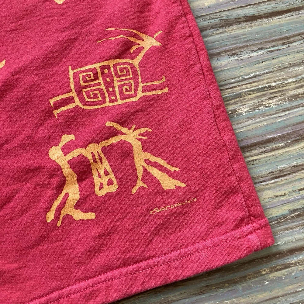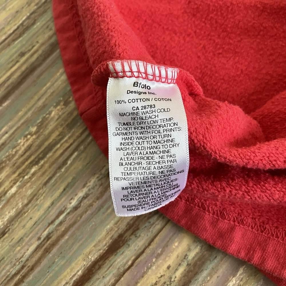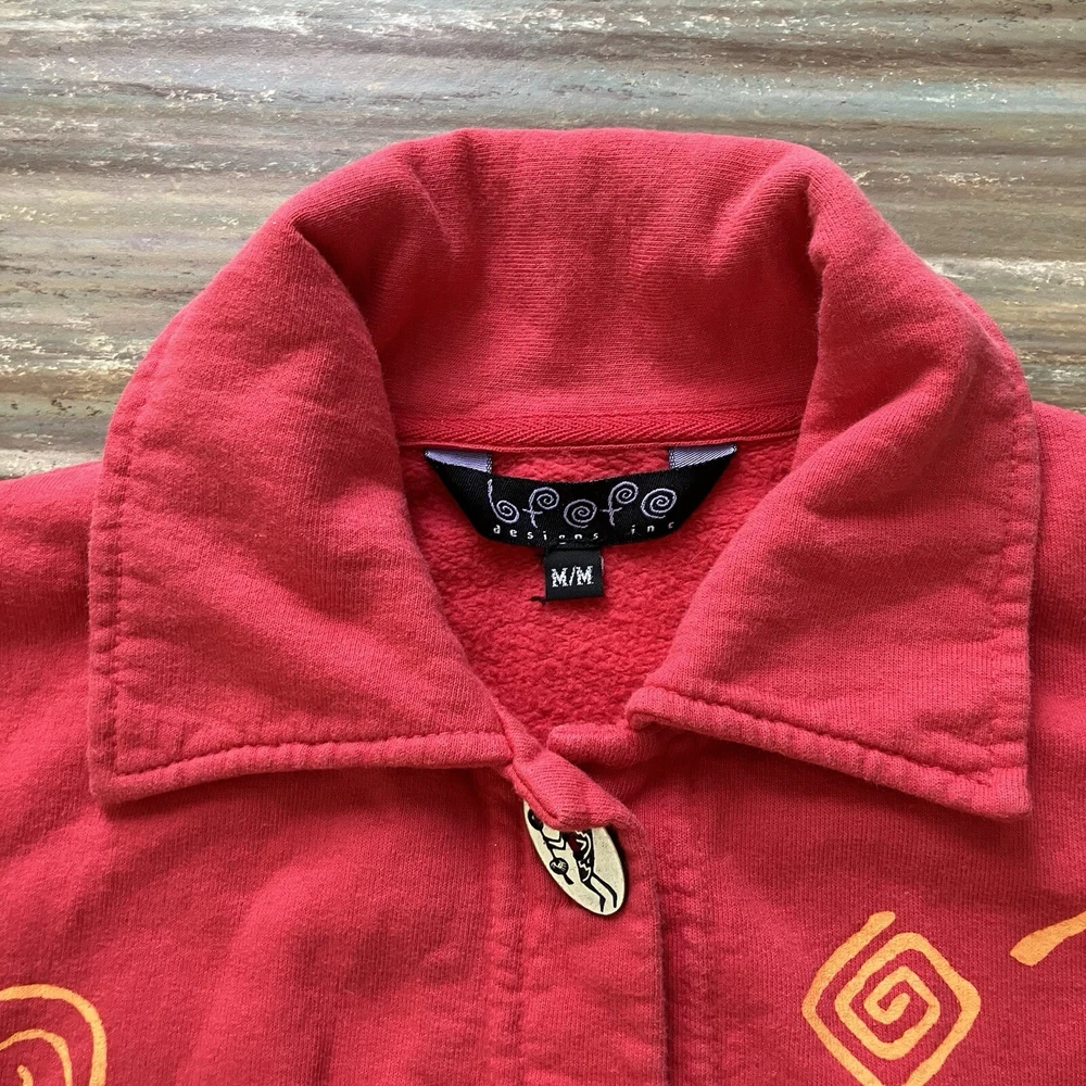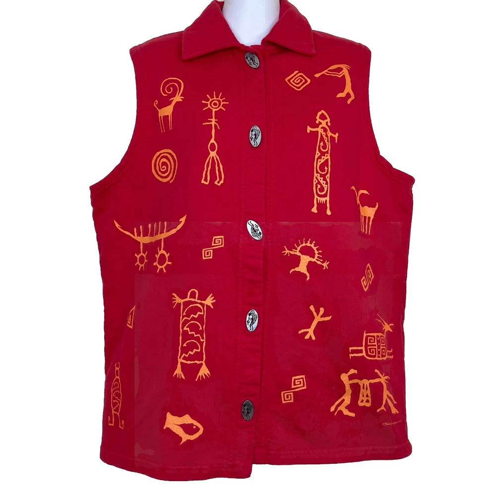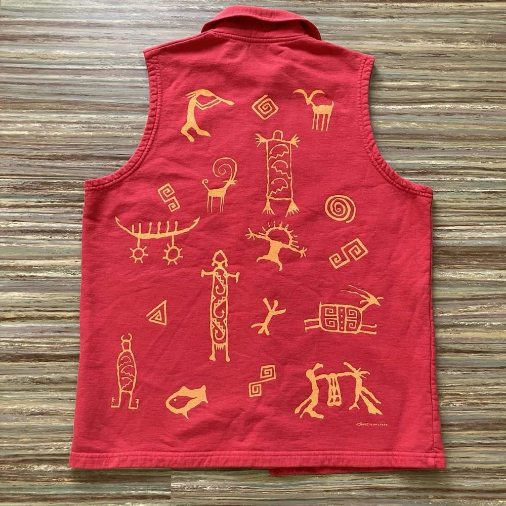 Bfofo brand red 100% cotton vest has orange pictograph designs on the front & back. Made from sweatshirt fleece-type fabric. Unique silver-tone button front closures have a Kokopelli design. Women's size "medium" - see below for garment measurements. Pre-owned condition: cotton fabric has some fading from normal wash/wear. The pictures show the actual item that you will receive. Garment size when laid flat: Bust: 22" (up to 44" bust) Waist: 21" (up to 42" waist) Hip: 22" (up to 44" hips) Length measured from shoulder to bottom of hem: 27" Ships from Alberta, Canada. Tax applies to purchases.