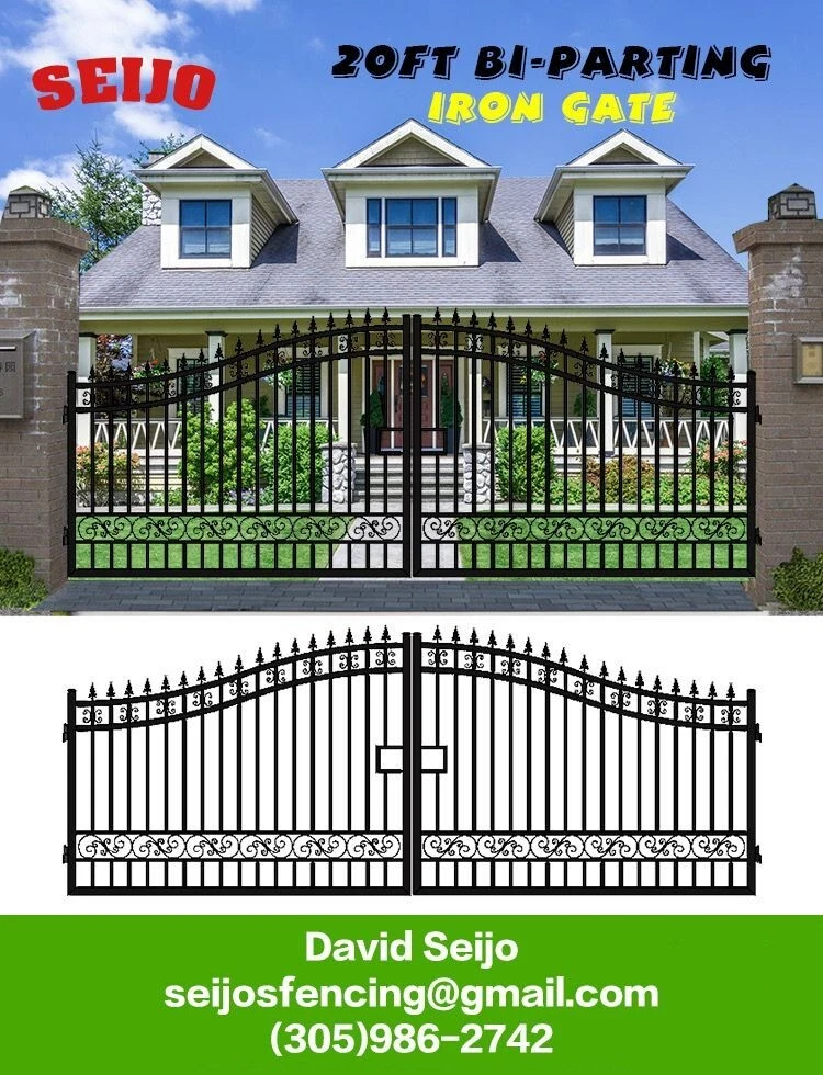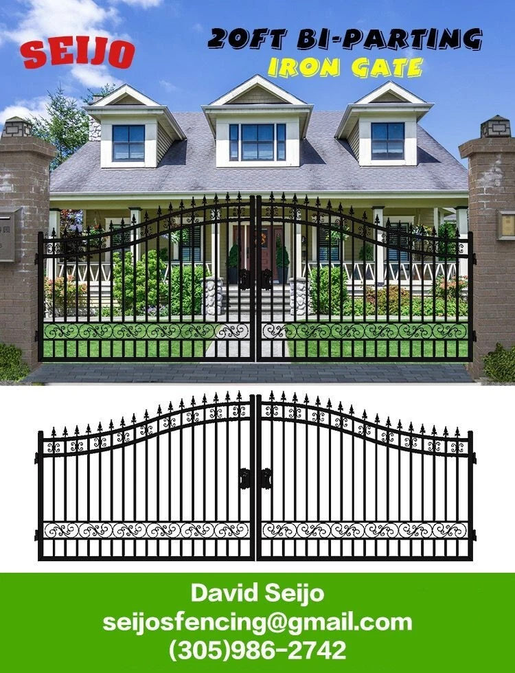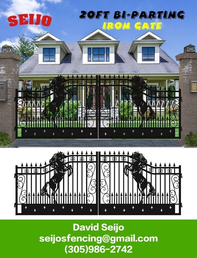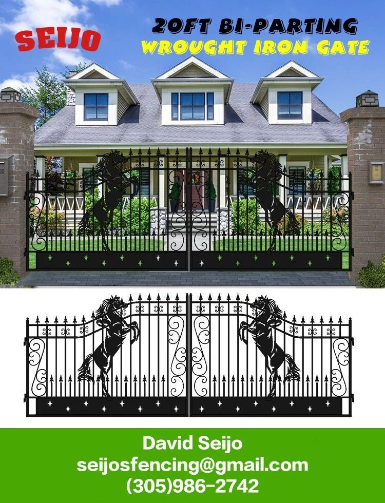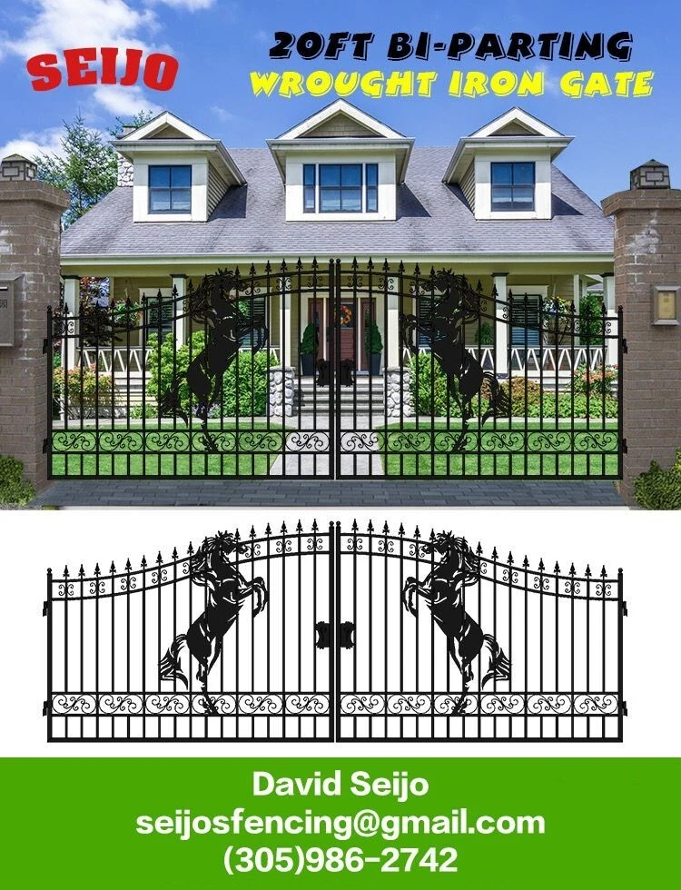⚒️⚒️⚒️⚒️ PRICE IS FIRM ⚒️⚒️⚒️⚒️ My price is way better! 💵💵💵💵💵 CASH ONLY 💵💵💵💵💵 Prices are: $1500 20' $1400 16' $1350 14' $1300 12' 🏚️ Posts are also available the set $250 🏚️ Im located passing the line of Florida/Georgia in Brunswick GA and about 40min from Jacksonville FL and an hour from Savannah GA 🚧 This Bi Dual Swing Wrought Iron Steel with double coated Gate for Driveway is affordable and high quality, and it is a good choice for homeowners, landscapers, masons, garden, and swimming pool builders. 🚧 ⛩️ A wrought iron gate is a good investment to add curb appeal and value to your private property. Adding more romantic and luxury to your favorite place, your home is more shining and artistic. ⛩️ 🏚️ Seijo's Fencing wrought iron gate has a long, durable life, and it separates your private space from outsides, and it provides a practical barrier for your home. 🏚️ 🗽 Models: are all bi-duals: 🗽 12ft two gates of 6ft 14ft two gates of 7ft 16ft two gates of 8ft 20ft two gates of 10ft Bi-Parting Wrought Iron Gate. With artwork "DEER" "OAK TREES" "HORSES" Contemporary style. Three different to chose from. Specification: Length Height Width 14' 14ft 💡 7.6 ft 0.21ft 16' 16ft 💡 7.6 ft 0.21ft 18' 18ft 💡 7.6 ft 0.21ft 20' 20ft 💡 7.6 ft 0.21ft Inner Frame: 25*25*1.2mm steel frame Outer Frame: 50*50*2mm steel tube Frame Material: metal Metal Type: Wrought Iron Pressure Treated Wood Type: Heat Treated Frame Finishing: Powder Coated Feature: Easily Assembled, Rodent Proof, Rot Proof, Waterproof, Easy, Durable Type: Fencing, Trellis & Gates Capacity: Could bear more than 80KG Color: black Feature: Strong structure with an aesthetic European classic art design Have excellent climate resistance ability, durable in hot, humid, dry climates Erosion resistance and temperature change resistance, long-lasting in every condition Tough paint coating, powerful adhesive ability. The ornamental wrought iron component is an alternative, and you can choose from our selections. They can be collocated optionally to ensure variousness of our products and the construction is flexible and convenient. ▶️ Main Gate frame: 2inch x 2inch ▶️ Horizontal pipe:1-5/8inch x 1inch ▶️ Vertical picket: 3/4inch x 3/4inch ▶️ Gate post: 4inch x 5inch x 2.5meter high ▶️ Surface treatment: galvanized and powder coated Color:black Gate size: 1.8meter high x 4meter wide, 1.8mter high x 5meter wide, 1.8meter x 6meter ⏸️⭐️ Highest point 7ft lowest point 6ft ⭐️⏸️ (1.8meter high in lowest point, 2meter high in highest point) Or 12ft wide, 14ft wide, 16ft wide, 20ft wide. David (305)986-2742 https://seijosfencing.com