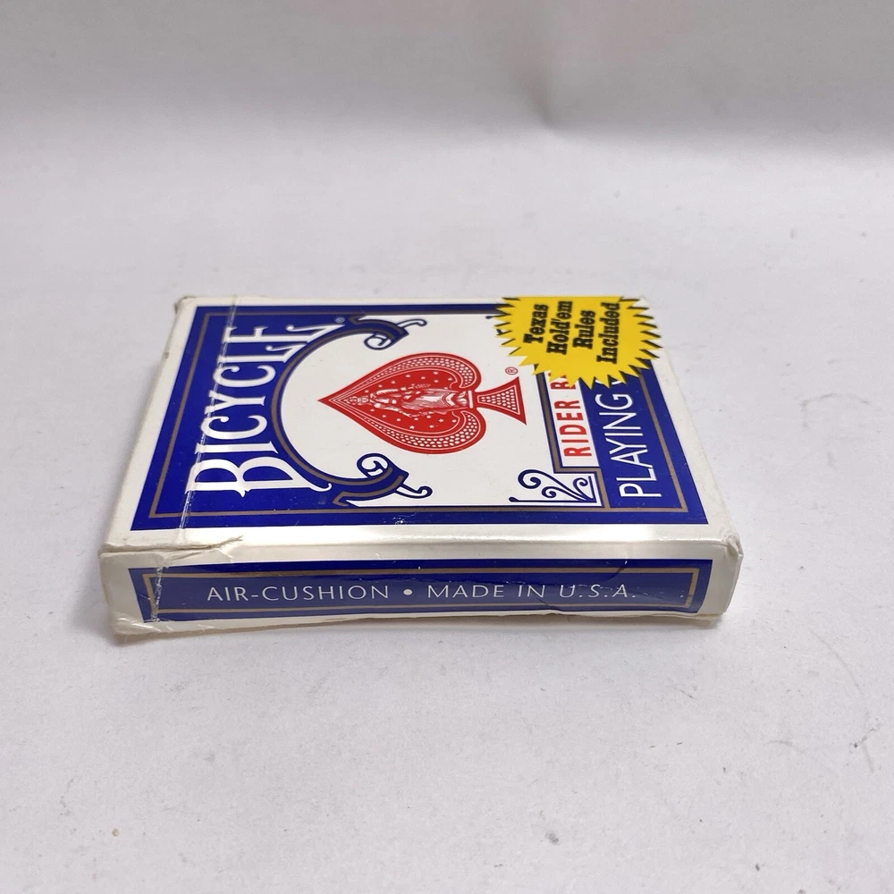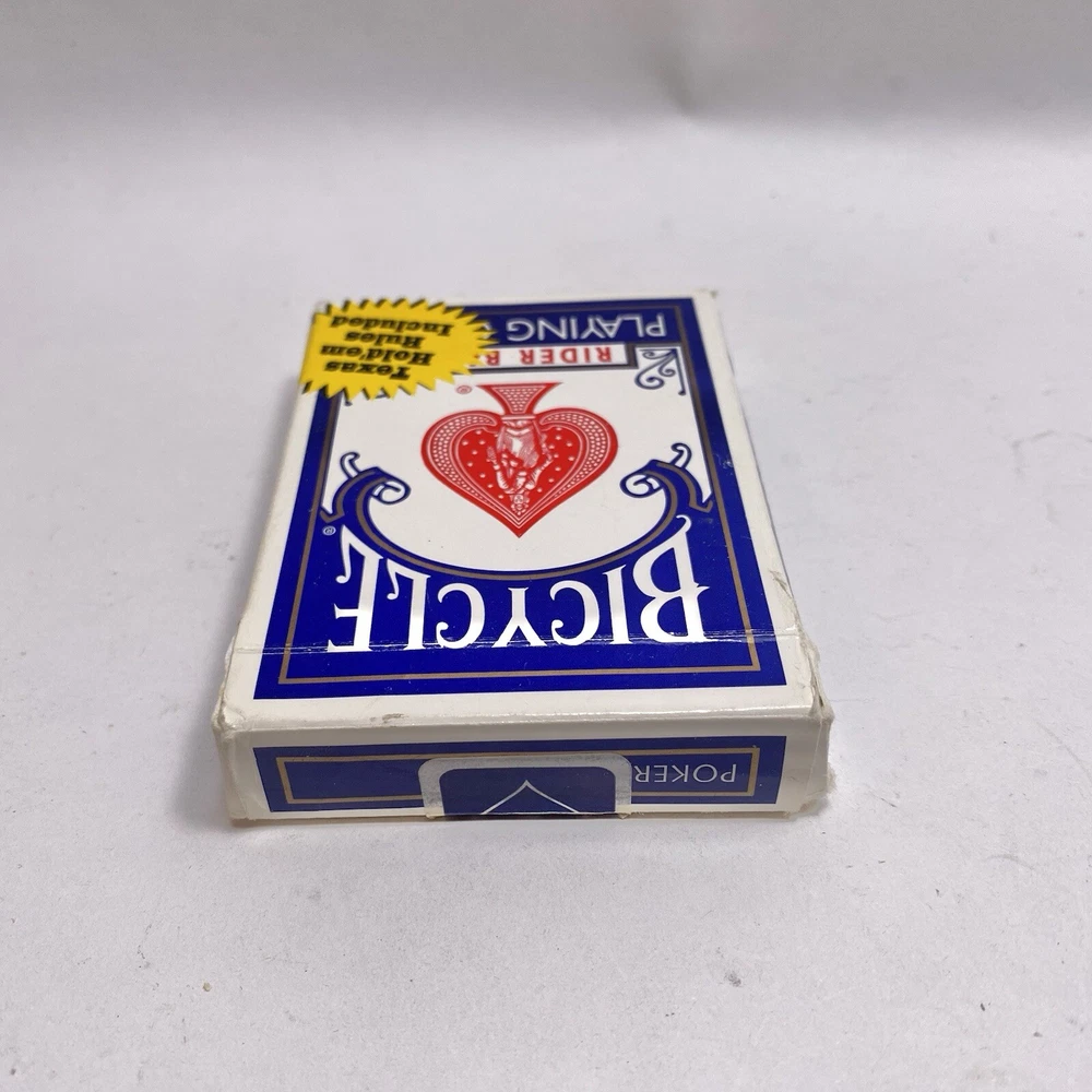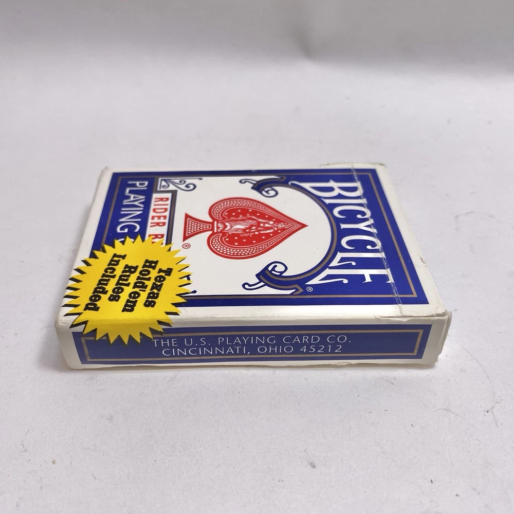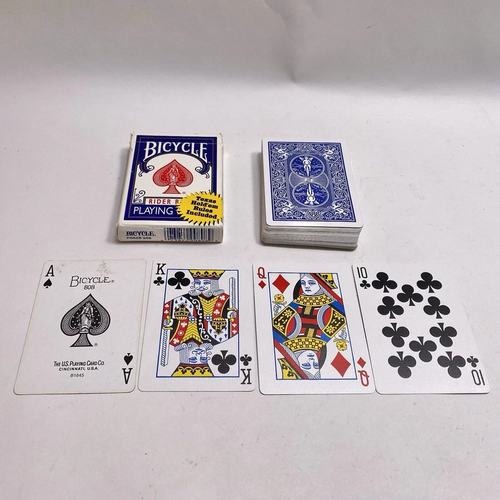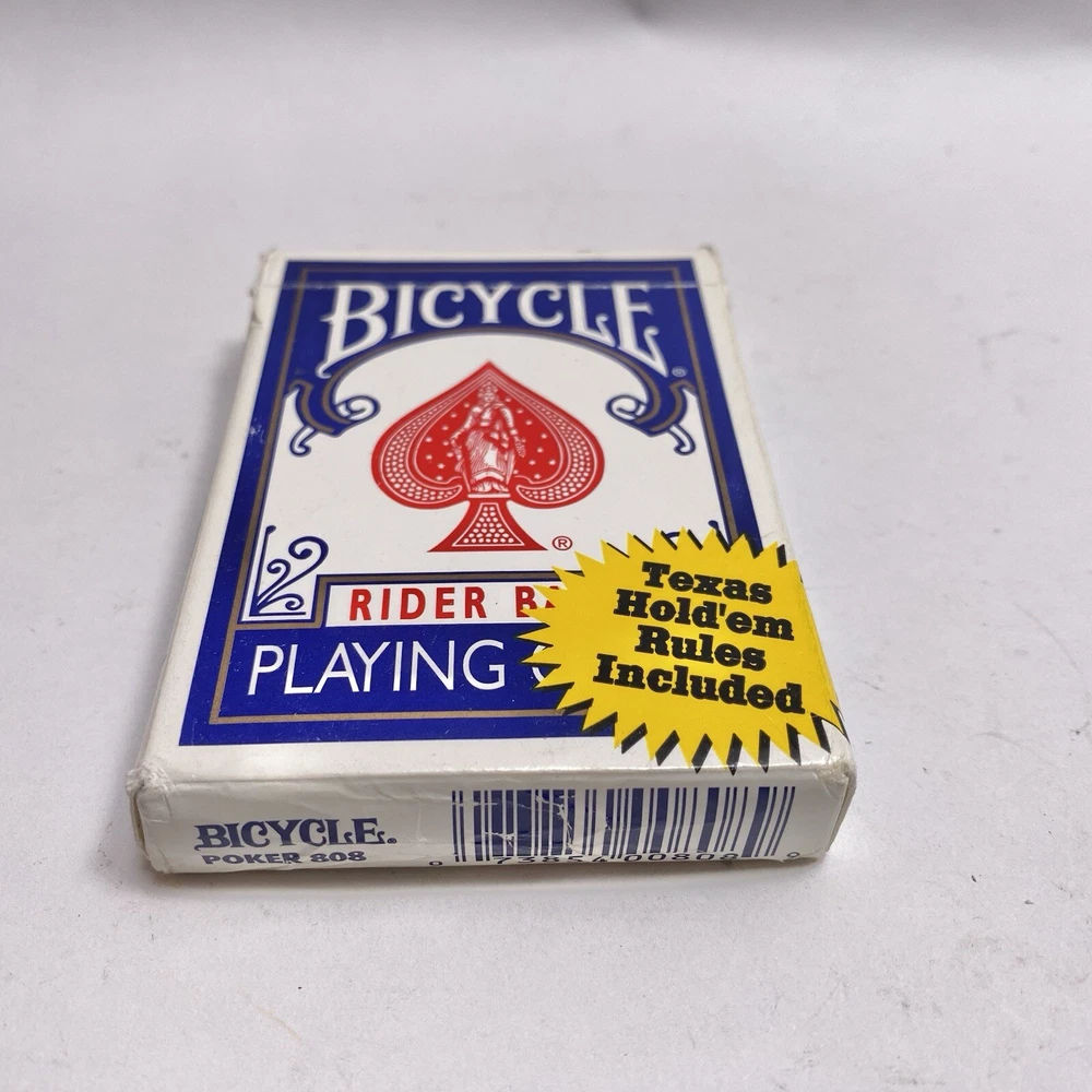 Theme:rider backUPC:073854008089Type:808 Poker Blue Packgtin13:073854008089Age:Modern (1970-Now)Brand:BicycleCountry/Region of Manufacture:United StatesSeller Notes:“Complete 52 card deck with no jokers. Photos show the actual items you will receive.”