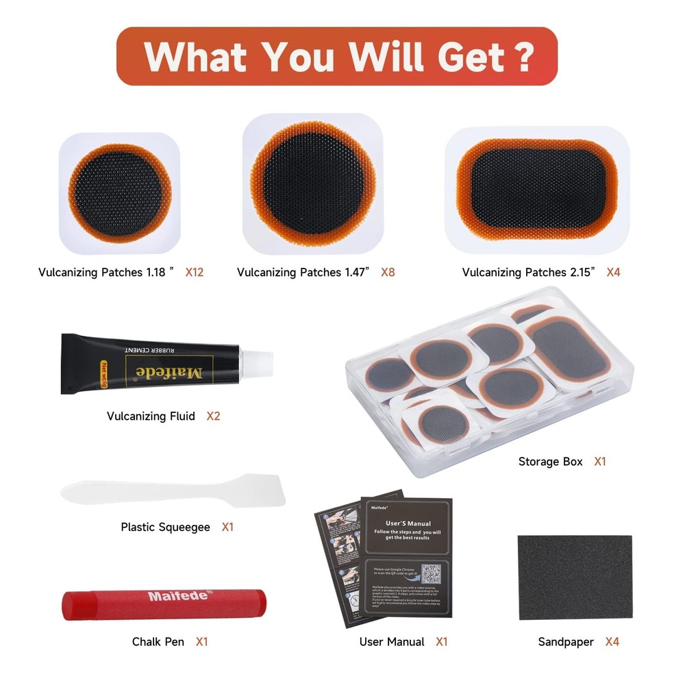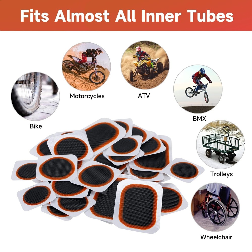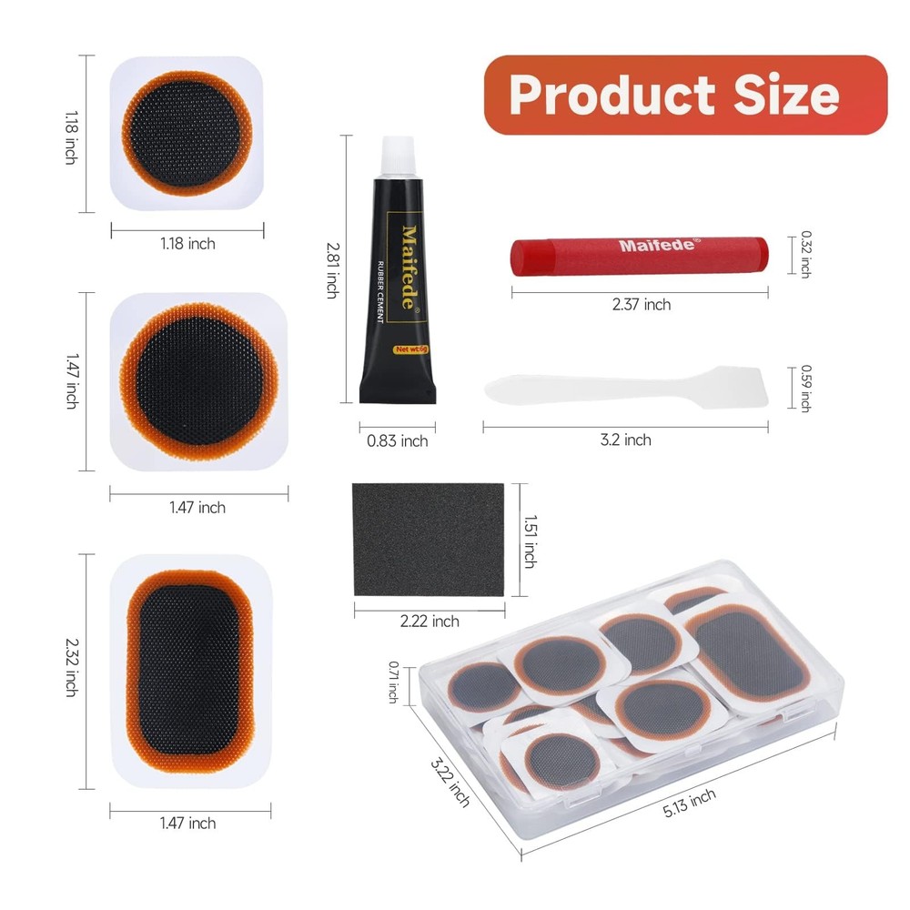 Unparalleled Patch Kit - Available in three sizes of 2.15, 1.47, 1.18 inch, easy to deal with large and small inner tube punctures.Whether it is pierced by nails or sharp glass shards, you can use it for perfect repair. Awesome Permanent Repair - Vulcanizing Patch, as a professional repair tool, can bring surprising repair effects. Using the correct method can make the Vulcanizing Patch and the inner tube fuse to form a permanent repair. How to Use it Correctly? - Use a sandpaper to polish around the puncture hole, and then cover the vulcanizing fluid, the area must be larger than the patch area. Wait 1-2 minutes, then paste the Vulcanizing Patch, use a rubber hammer or wooden stick to hit the patch to exhaust the internal air, and use it after it is fully dried. What You Will Get - 24PCS Vulcanizing Patch, 2PCS vulcanizing fluid, Includes sandpaper swatch 4PCS for cleaning, They are integrated in a beautiful box for easy use. team is committed to 100% satisfactory service. If you have any dissatisfaction, please notify us.