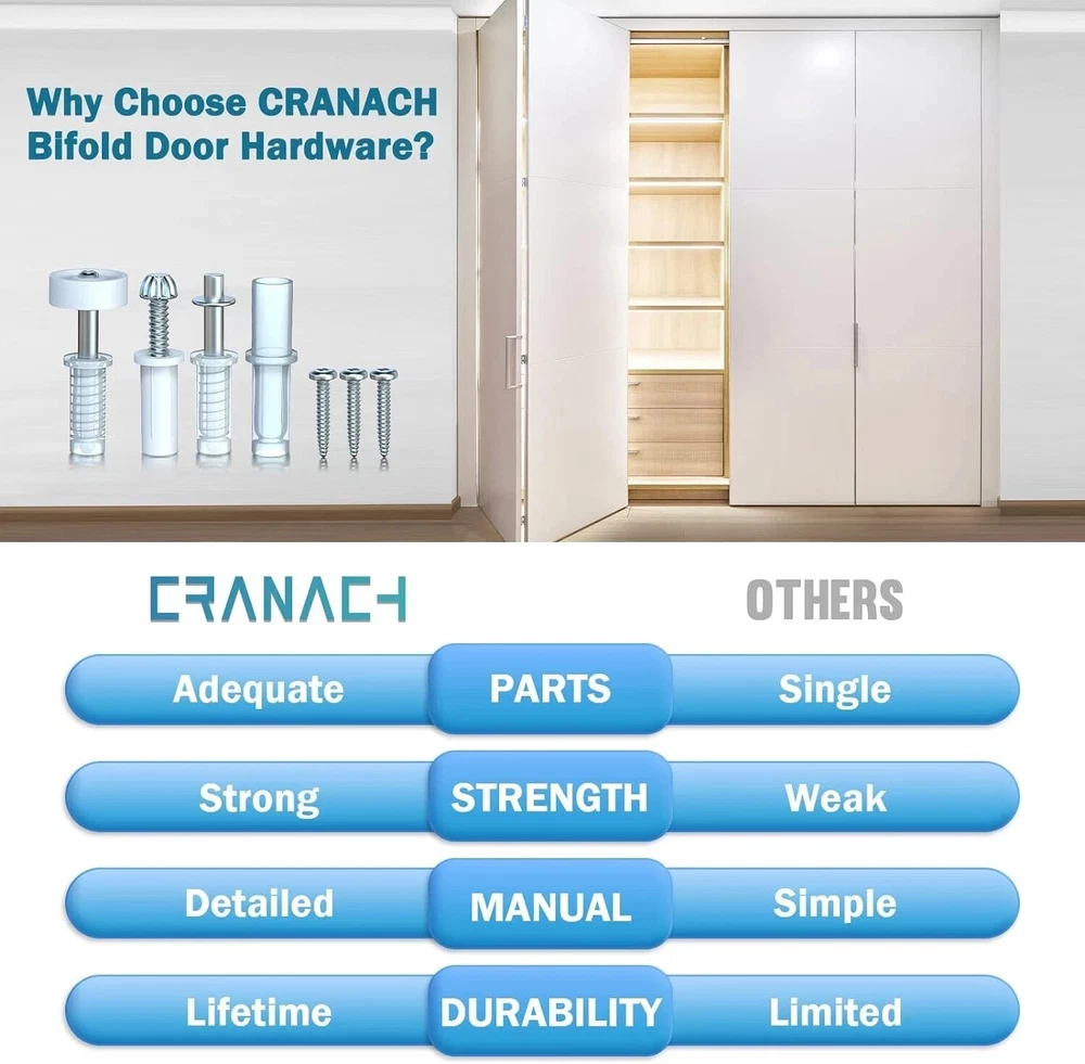100% Money Back Guarantee if you are not satisfied with your purchase! ___________________ Description: Make Repairs Easier: Stop worrying about broken folding door hardware! CRANACH bi-folding door repair parts have correctly classified the hardware problems of the entire bi-folding door, providing a variety of parts in standard sizes, safe materials, and durability. Detailed installation instructions are included with each package, which is easy to operate and replace parts. Bi-fold barn door hardware set saves money and gives you a sense of accomplishment in repairing doors or furniture. The Adequate Parts, Standard Sizes: A bifold closet door hardware kit include a 3/8" metal top pivot, 3/8" bottom pivot, 3/8" plastic top pivot, 7/8" top guide wheel, steel top, and bottom bracket, and 3 screws. Closet door hardware kit can repair bifold doors weighing up to 50 pounds and ranging from 1" to 1-3/8" thickness. The hardware repair set allows you to quickly fix a door without having to replace it, saving you both money and time while ensuring a properly working door. Easy to Install, Worked Well: When replacing the bifold closet door hardware kit, you hardly need to make any extra drilling, measuring, and other adjustments when you are changing the fittings. CRANACH pivots and guide wheels have their own springs, when they are fixed on the door hole, by pressing the built-in springs, the distance between the door and the track will be adjusted so that it can quickly enter the bracket and track, and the folding door can slide easily. Solid & Durable, Widely Used: Double folding door fittings are mainly made of steel and plastic. The high hardness of steel and the good toughness and wear resistance of nylon PA6 plastic. They will not become brittle and break over time, making them long-lasting. Suitable for repairing bi-fold doors, sliding doors, bi-fold closet doors, bedroom closet doors, garage doors, laundry room doors, pantry doors, etc. Door hardware can quickly make your doors look like new. Caring Service: Each package will provide a manual with a list of accessories, installation steps, and diagrams. CRANACH provides 24-hour professional customer service. If you have any problems during the purchase and use, please feel free to contact us. CRANACH customer service team will follow up your case until the issue is properly resolved. Use it now, and feel the convenience and fun of maintenance in your daily life. ________________________ 100% Money Back Guarantee: We offer 30 Day Money Back Guarantee from the day you purchased if you’re not satisfied with your product. If you have any questions about our products, please contact us as soon as possible. Customer satisfaction is our absolute priority. Shipping: We are always working hard to ensure your package arrives as soon as possible. Please understand that some factors like weather, high postal traffic, and the performance of shipping companies are outside of our control. We offer free shipping to the lower 48 states and ship within 3 business days of payment, usually sooner. We do not accept P.O. Boxes. Please provide a physical address. You will be notified via eBay messages as soon as your items ship. Delivery: We will ship out the item in 2-3 working day after receiving the payment. Usually the delivery takes 2-5 business days. If you don't receive the items after 10 days, please feel free to contact us. You will get a replacement or a full refund. Please DO NOT open a return request or leave negative feedback without asking for help . Returns (Get Free Return Label): We offer a 30-Day Return Policy on defective/wrong items or items which you are not completely satisfied with. You have the option for a full-refund or an exchange of the item. No need to buy eBay return label. Contact us via eBay messages and get free return label. Returned items must be in all of the original packaging and include all of the original accessories or items that came with it. The item and package should be in original condition. Contact Us: Any queries or issues incurred, please feel free to contact us via eBay message, we will get back to you within 24 hours. Please DO NOT open a return request or leave negative feedback without asking for help. Feedback: Your feedback is very important to us. After you get your package and you are satisfied with our service, please leave us positive feedback. We are highly appreciated for your POSITIVE feedback and 5 stars. Enjoy shopping.
