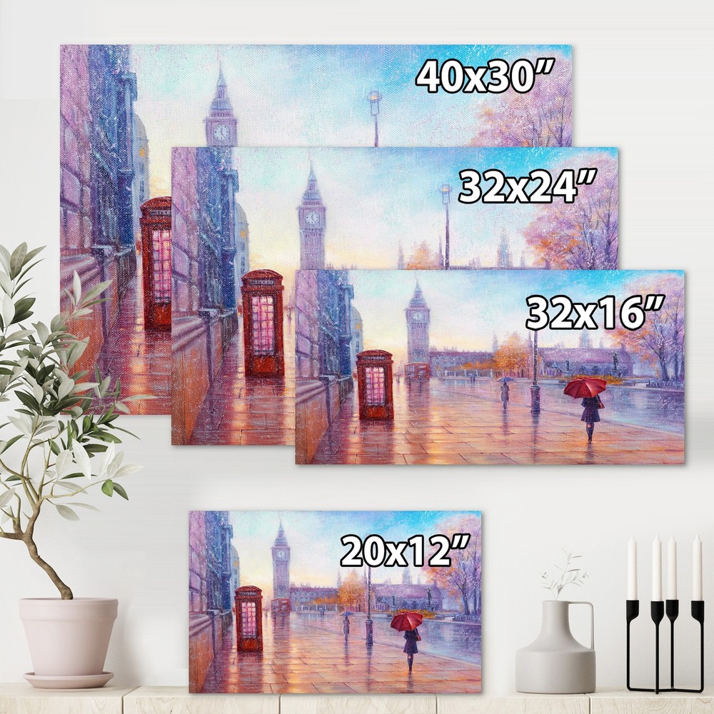 This beautiful French Country Canvas Art is printed using the highest quality fade resistant ink on canvas. Every one of our fine art giclee canvas prints is printed on premium quality cotton canvas, using the finest quality inks which will not fade over time. Each giclee print is stretched tightly over a 1 inch wood sub frame for small size prints or a 1.5 inch wood sub frame for large size prints (40x30 36x36 ...) ensuring the canvas is taught and does not buckle. This canvas art print is gallery-wrapped (the design continues on the sides) , giving it a real art gallery feel. All of our canvas prints are carefully packaged with plastic protection, fragile labeling and sturdy boxes to ensure a safe delivery. Every canvas print arrives ready to hang on the wall, with the hanging kits Free Shipping Over $49.99* Details Designart "Big Ben and Woman With Red Umbrella In London" French Country Canvas Product Description: This beautiful French Country Canvas Art is printed using the highest quality fade resistant ink on canvas. Every one of our fine art giclee canvas prints is printed on premium quality cotton canvas, using the finest quality inks which will not fade over time. Each giclee print is stretched tightly over a 1 inch wood sub frame for small size prints or a 1.5 inch wood sub frame for large size prints (40x30 36x36 ...) ensuring the canvas is taught and does not buckle. This canvas art print is gallery-wrapped (the design continues on the sides) , giving it a real art gallery feel. All of our canvas prints are carefully packaged with plastic protection, fragile labeling and sturdy boxes to ensure a safe delivery. Every canvas print arrives ready to hang on the wall, with the hanging kits included. - Style French Country,Traditional - Subject Landscapes, Romantic - Color Pink,Blue - This canvas giclee print is gallery-wrapped (the design continues on the sides) , giving it a real art gallery feel. - Premium quality cotton canvas. - Arrives ready to hang on the wall - Easy to Hang