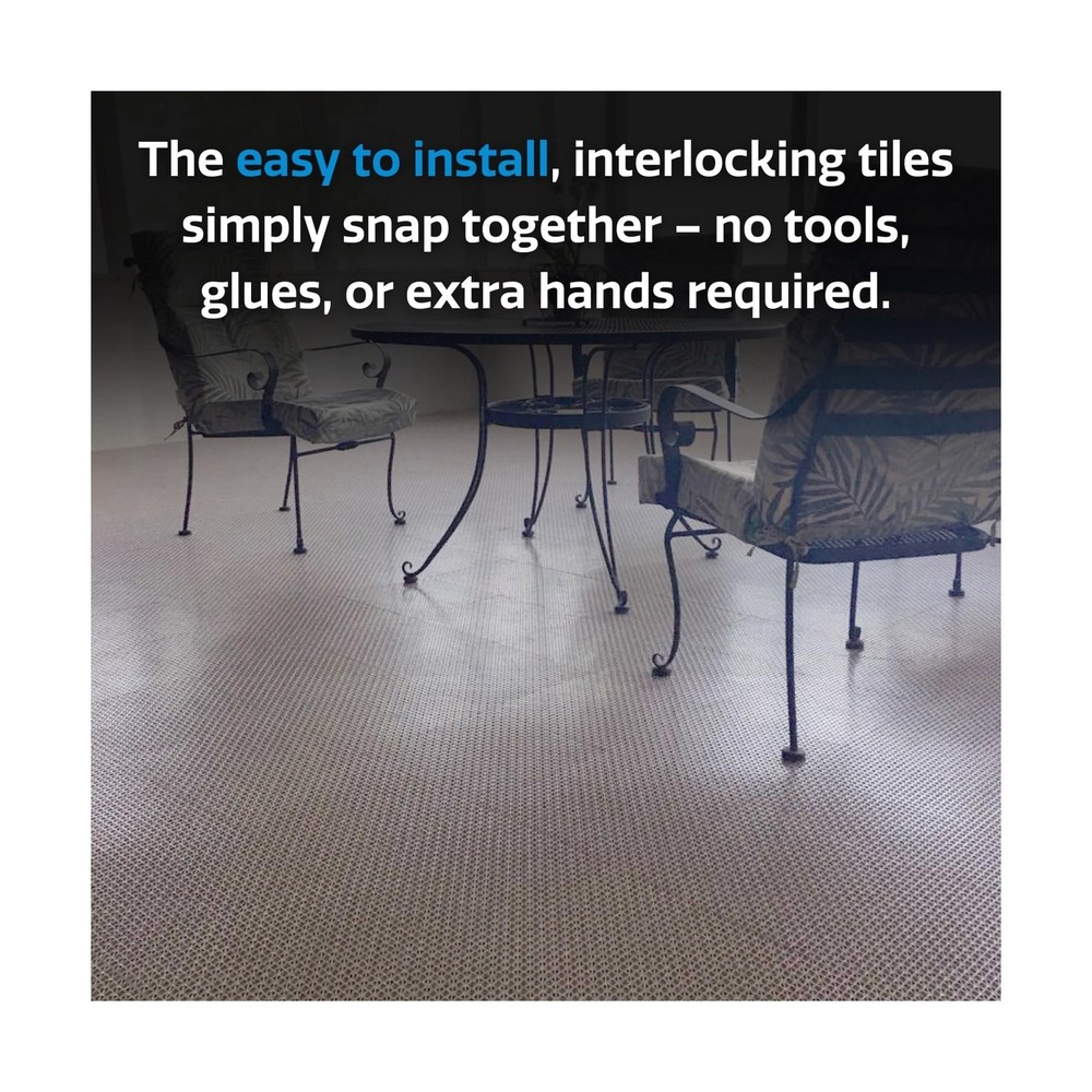 Big Floors DuraGrid Outdoor Modular Deck Tiles, Interlocking, Slip-Resistant, Self-Draining, Durable Plastic Flooring, Easy Install, UV & Water Resistant, Made in USA, 40 Pack, Gray Description Features: Perfect Resurfacing Solution Cost-effective way to upgrade worn-out decks, patios, pools, gardens, basements, and mudrooms without repainting or staining. Durable & Weather-Resistant Designed to withstand UV exposure, heavy foot traffic, and water exposure, ensuring long-lasting performance. Quick & Easy Installation Interlocking tiles snap together effortlessly without tools or glue, providing a high-end look and exceptional floor protection. Self-Draining & Slip-Resistant Patented free-draining design prevents water buildup, promotes airflow, and enhances traction for a safer surface. Low Maintenance & Easy to Clean Simply spray down with a hosethe self-draining feature eliminates standing water, keeping surfaces dry and safe. Product Details: Brand: Big Floors Material: Plastic Size: 40 Pack Color: Gray Finish Type: Textured Style: Modern Installation Type: Interlocking Product Dimensions: 12"L x 12"W Pattern: Geometric Item Weight: 32 Pounds Brand: Big Floors Material: Plastic Size: 40 Pack Color: Gray Finish Type: Textured Style: Modern Installation Type: Interlocking Product Dimensions: 12"L x 12"W Pattern: Geometric Item Weight: 32 Pounds Shape: Square Item Thickness: 0.05 Inches Edge Style: Square Edge Unit Count: 40.0 Square Feet Item Display Dimensions: 0.63 inches Recommended Uses For Product: Outdoor surfaces, mud rooms, basements Form Factor: Square, 12x12 inches, 0.05 inches thick Water Resistance Level: Water Resistant Special Feature: Resurfacing Suitability UPC: 810202032965 810202032118 Global Trade Identification Number: 18 Manufacturer: SnapLock Industries Part Number: DT48GRAY Item Weight: 32 pounds Item model number: DT40GRAY Finish: Textured Item Package Quantity: 1 Coverage: 40 Square Feet Special Features: Resurfacing Suitability Included Components: DuraGrid Tiles (40) Batteries Included?: No Batteries Required?: No Date First Available: October 30, 2017 Delivery We Do Not Ship Outside of the Continental US. Return Policy All items qualify for returns within 30 days of receipt. Seller is responsible for return shipping on any item that is not damaged. Feedback We take our reputation seriously, we buy and sell online, so we understand the value of trust. If you are unsatisfied with your order, please contact us and we will work with you to resolve it to your satisfaction.