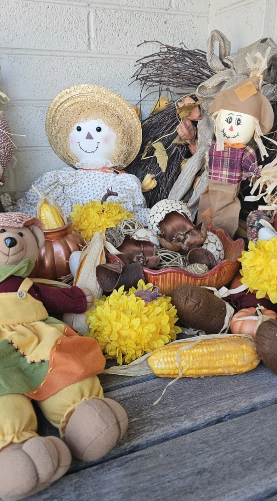 Lot of plushes, wreath, wall hangers, flowers, fake corn cobs, & so much more! Selling only as a lot. The box is crammed full but no worries...nothing in there is breakable. Glass items are not included.