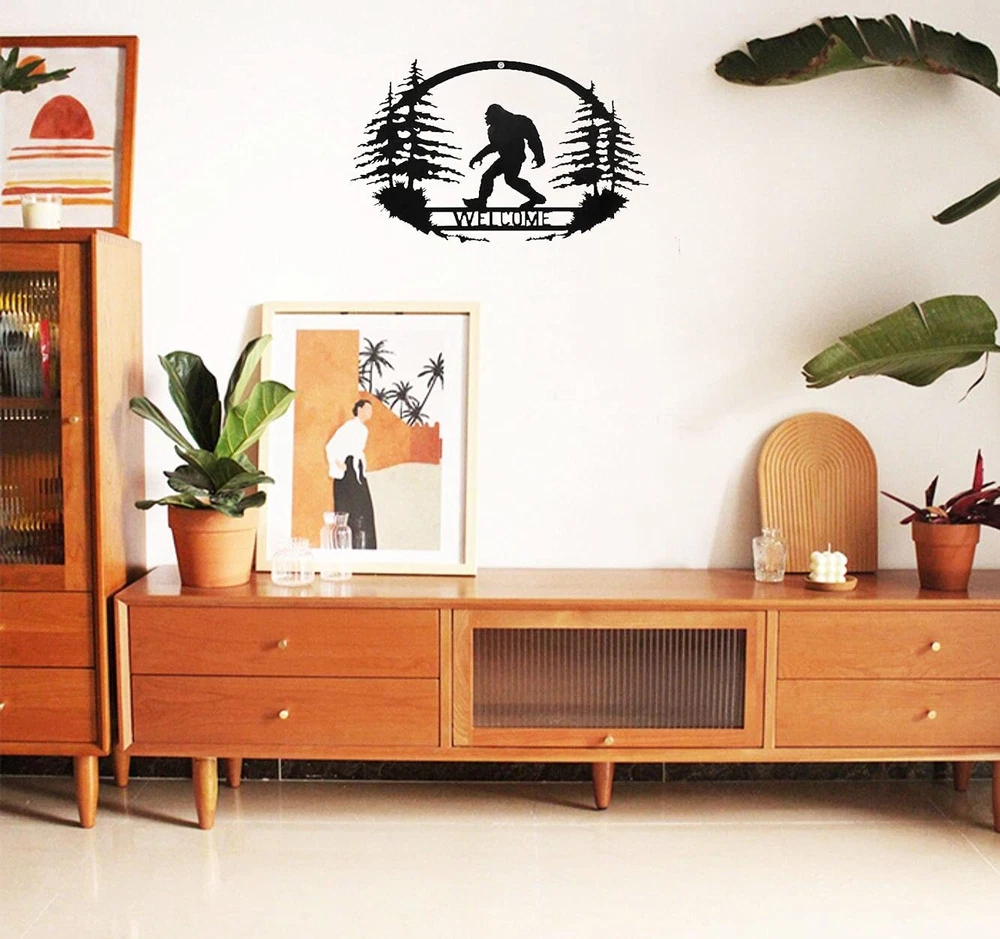 Welcome Bigfoot metal wall hanging ornament make home wall & door decoration rustic and farmhouse. Excellent gift for housewarming, weddings, anniversaries, Christmas, birthday. The wall hanging Bigfoot can be indoor and outdoor decoration, perfect for Living Room, Bedroom, Kitchen, , or Decorate It on Front Doors, Patio, Porch , Eaves, Pool Areas, Barns/workshops, Gates, and More Made of metal with black paint. Dimension: 13.8 x 8.7 inches WELCOME BIGFOOT SIGN - A sasquatch walking in the forest with pine trees and a WELCOME bridge, this special heteromorphic bigfoot wall art is very awesome for farmhouse decor and a great addition to your Christmas decoration Wide APPLICATION - You can hang the bigfoot wall art indoor and outdoor. It is perfect as a front door welcome sign, and also perfect decoration for Living Room, Yard, , or Patio, Porch, Eaves, Pool Areas, Barns/workshops, Gates, and More EASY TO INSTALL - There is a small hole on the top of the bigfoot art decor, you can hang it on the wall and door with nails or ribbon. The wall decor is not heavy, you can also stick it to the wall with thick double-sided tape METAL WALL ART - This bigfoot hanging ornament is made of heavy-duty iron, which is very reliable and hard. Be Careful with Sharp Parts Finished with blac paint that rust-resistant, suitable for the outdoor decoration DIMEASIONS - The size of the art decor is 13.8 x 8.7 inches, and the thickness is 0.04 inch. Large bigfoot art decor is great for porch welcome sign and patio or yard decoration