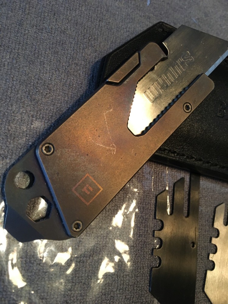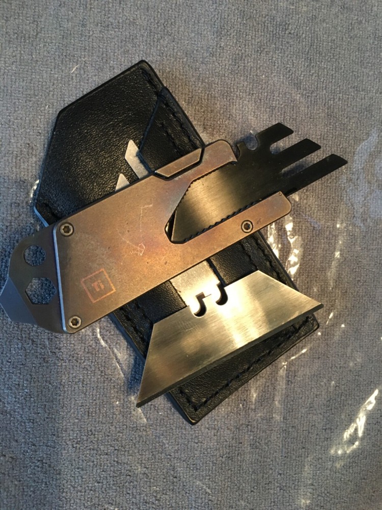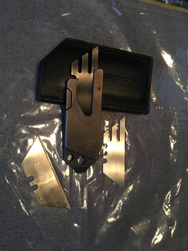 Bigidesign titanium razor knife multi tool flame ano bottle opener camping fork blade 1/4 inch bit holder prybar lanyard hole snail trail on front