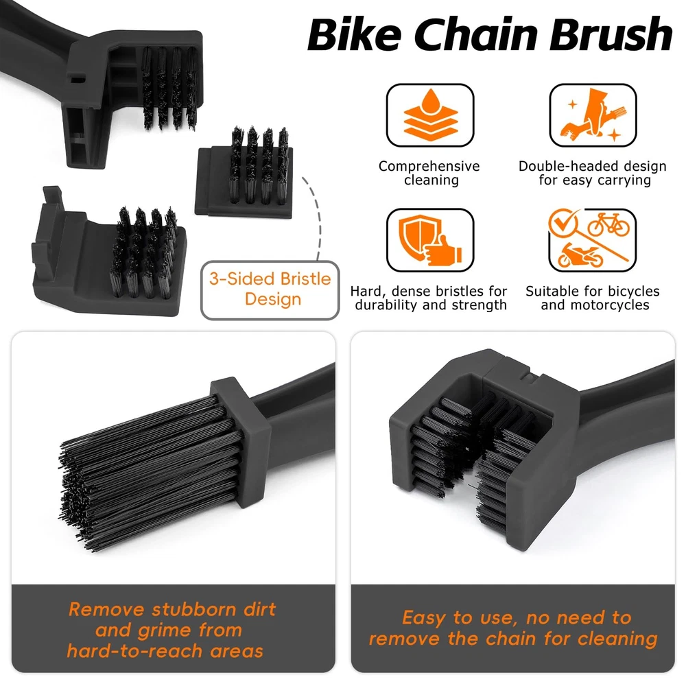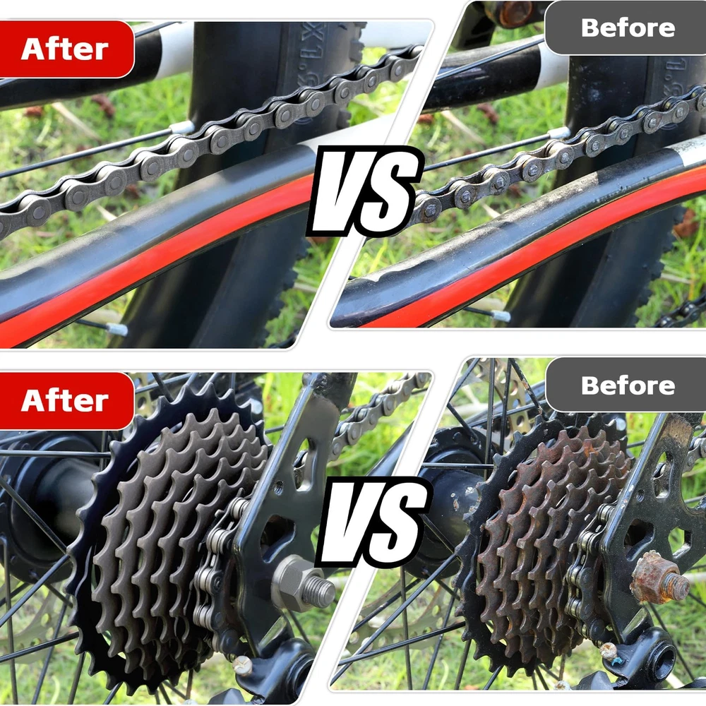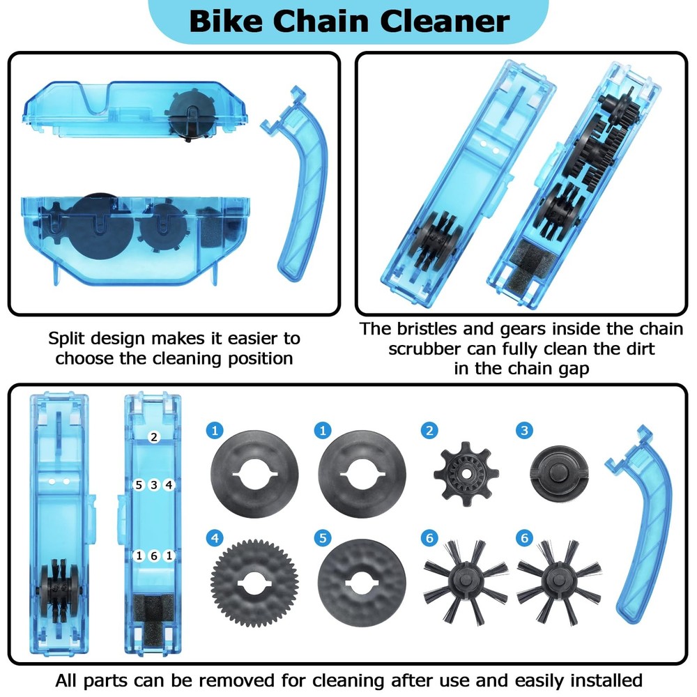 Bike Cleaning kit for Cleaning Bike Chains 【Bike Cleaning Kit】:Bicycle cleaner kit includes chain lubricant, degreaser, chain scrubber, gear brush, wheel brush and chain cleaner brush to effectively clean and maintain your bike. 【Easy to clean】:Just mount the chain scrubber under the bike chain, and then put some degreaser into the scrubber, hold the chain scrubber with left hand and turn the pedal with right hand in the counterclockwise direction for cleaning. 【perfect for All Types】:Bike chain oil lube and cleaner set is perfect for All Types of Bike like mountain,mtb,road,/-bike/ebike and cyclocross trail bikes. 【Safely and Efficiently】:Complete cleaning for cleaning bike chains, rear cogs, and chainrings,Biodegradable bicycle degreaser is made non-corrosive formula and will not harm alloy,plastic,or carbon fiber. 【Premium Quality】:High quality bicycle chain oil lubricant provides optimal rust prevention and lubrication in all temperatures and conditions, which can make the bicycle chain smoother and easier to pedal, reducing wear and extending the life of the chain.