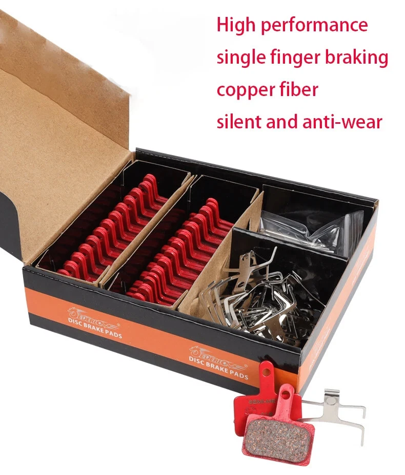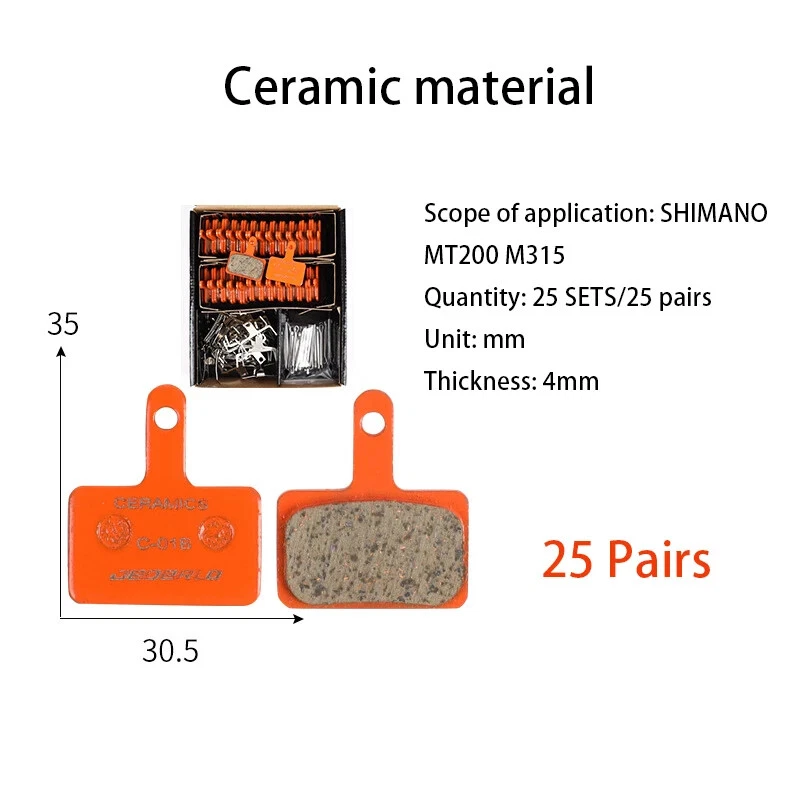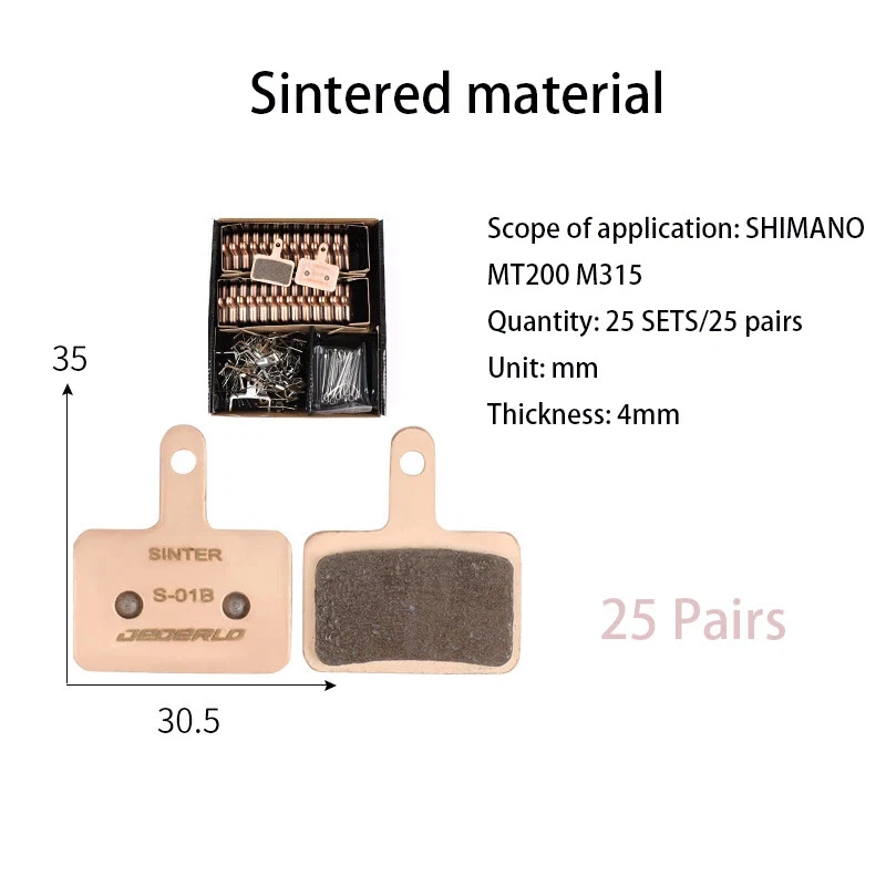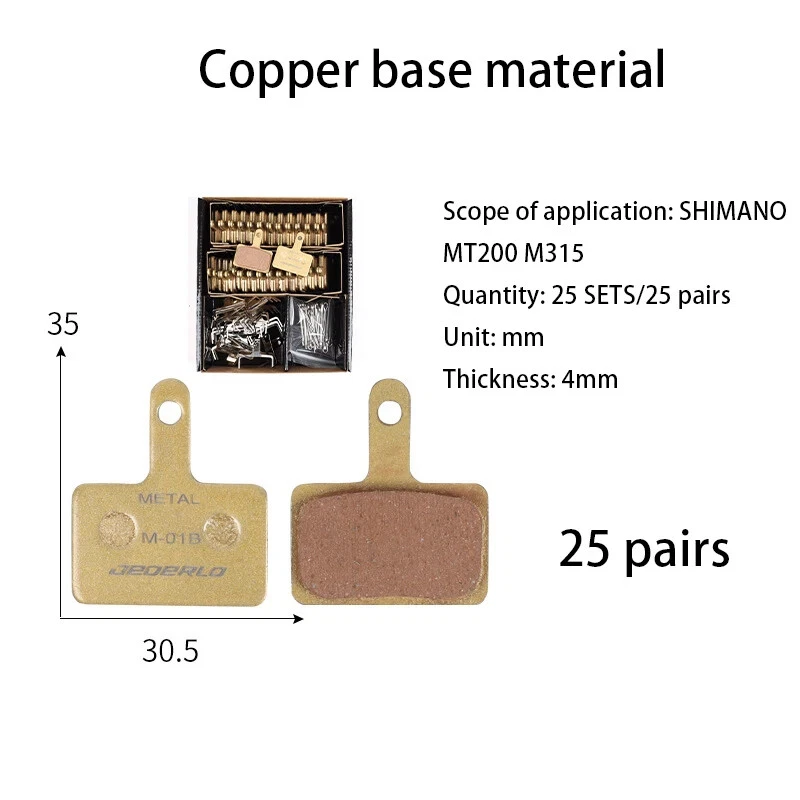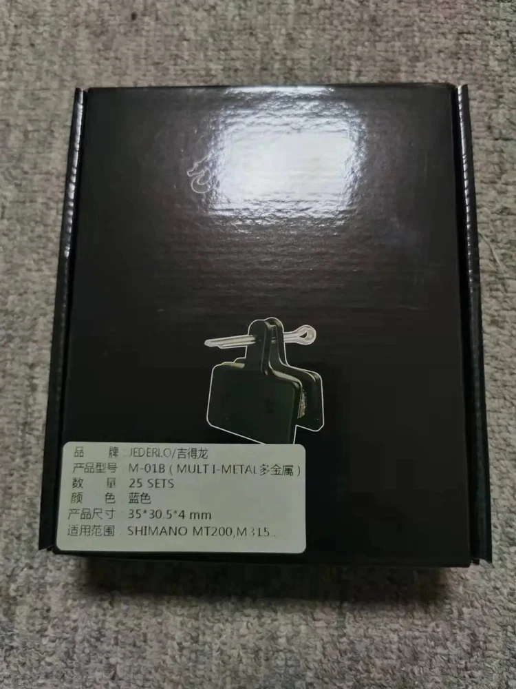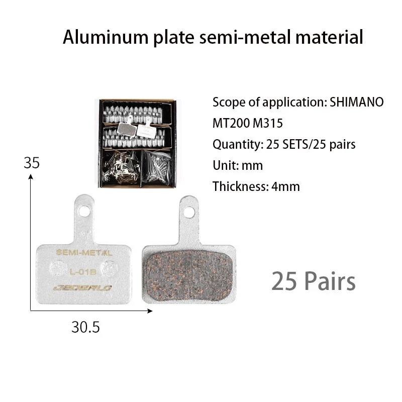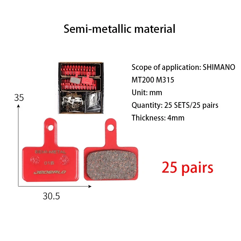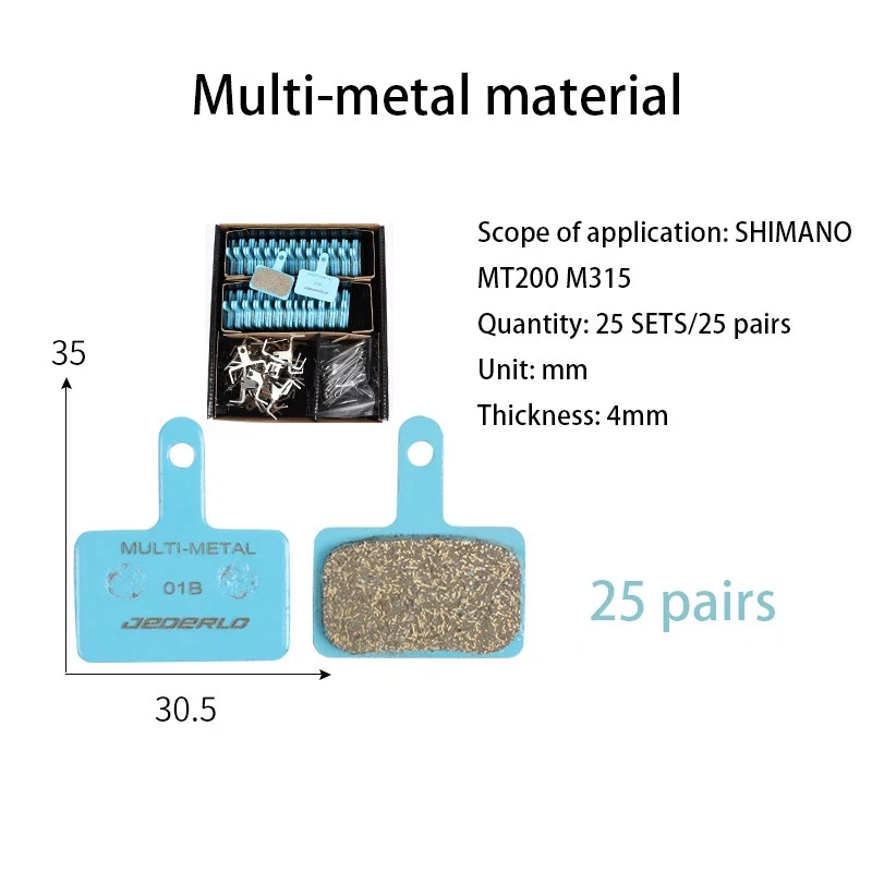 Model: M-01B Material: A:Semi-metal sheet material B:Ceramic sheet material C:Copper substrate material D:Sintered sheet material E:Aluminum plate semi-metal sheet material F:Polymetallic Scope of application: SHIMANO MT200 M315 Quantity: 25 SETS/25 pairs Thickness: 4mm