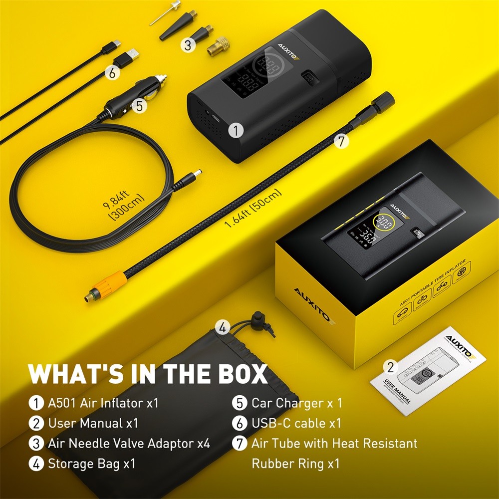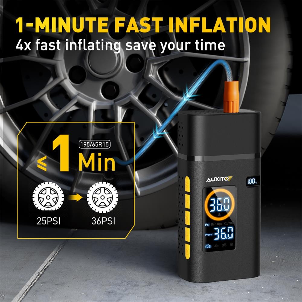 AUXITO A501 Tire Inflator 150PSI and 7800mAh portable air pump With LCD display, accurate pressure indication With ambient light, percentage power display 3 times faster inflation for car, bicycle and motorcycle tires, balls Specification: Brand:AUXITO Voltage:11.1 Volts Recommended Uses For Product: Tire Inflation Power Source: Battery Powered/DC Powered Noise Level: ≤75 dB Features: Bike Motorcycle Electric Air Pump Tire Inflator Portable Auto Car Air Compressor AUXITO A501 Tire Inflator 150PSI and 7800mAh portable air pump With LCD display, accurate pressure indication With ambient light, percentage power display 3 times faster inflation for car, bicycle and motorcycle tires, balls Specification: Brand:AUXITO Voltage:11.1 Volts Recommended Uses For Product: Tire Inflation Power Source: Battery Powered/DC Powered Noise Level: ≤75 dB Features: 4+1 Inflation Mode The air compressor has four types of pressure units: PSI, KPA, BAR, and KG/CM ². There are four preset inflation modes: bicycle, motorcycle, car, and ball. The fifth custom mode can also set pressure values based on the inflation object to meet various inflation needs. It is an essential product for daily life and travel. 3 modes LED light The tire inflator portable air compressor with pressure gauge comes which super bright LED light with 3 lighting modes (SOS, Normal and Strobe), ensuring you can easily inflate and change tires at night or deal with emergencies even in low light conditions.Perfect for inflating cars, motorcycles,bicycles,balls so on.And it also has a warning light function that can send a warning signal to alert other vehicles and pedestrians in case of vehicle breakdown or emergency. Advanced Screen Display The portable air pump built in high-performance chip, it can quickly inflate tires and provide high-speed airflow. Inflate small car tires in less than 1 minute. The large-sized LED display screen displays real-time pressure values and preset values, making it easy to monitor tire pressure status. The automatic shutdown design can also prevent excessive inflation, making it safe to use. Persistent Power Tire Inflator This tire inflator comes with a built-in 20000mA rechargeable battery for power supply, eliminating the need to connect to an external power source during use. The inflation speed is three times faster than other ordinary cordless inflators on the market, with a 35% increase in power. It can inflate 12 car tires or 30 Racing bicycle tires, away from the problem of low power. Preset values for different modes and adjustable pressure ranges Car: 36PSI(26-50PSI) 2.5Bar(1.8-3.5Bar) 250Kpa (180-350Kpa) 2.5Kg/cm2(1.8-3.5Kg/cm2) Bicycle: 45PSI(30-120PSI) 3.1Bar(2.1-8.3Bar) 310Kpa (210-835Kpa) 3.1Kg/cm2(2.1-8.3Kg/cm2) Motorcycle: 32PSI(26-45PSI) 2.2Bar(1.8-3.1Bar) 220Kpa (180-315Kpa) 2.2Kg/cm2(1.8-3.1Kg/cm2) Ball: 9PSI(4-16PSI) 0.6Bar(0.3-1.1Bar) 60Kpa (30-110Kpa) 2.5Kg/0.6cm2(0.2-1.1Kg/cm2) User-defined: 30PSI(3-150PSI) 2.1Bar(0.2-10.3Bar) 210Kpa (10-995Kpa) 2.1Kg/cm2(0.2-10.3Kg/cm2) Packaging include: portable tire inflator*1 ABOUT US Bike Motorcycle Electric Air Pump Tire Inflator Portable Auto Car Air Compressor AUXITO A501 Tire Inflator 150PSI and 7800mAh portable air pump With LCD display, accurate pressure indication With ambient light, percentage power display 3 times faster inflation for car, bicycle and motorcycle tires, balls Specification: Brand:AUXITO Voltage:11.1 Volts Recommended Uses For Product: Tire Inflation Power Source: Battery Powered/DC Powered Noise Level: ≤75 dB Features: 4+1 Inflation Mode The air compressor has four types of pressure units: PSI, KPA, BAR, and KG/CM ². There are four preset inflation modes: bicycle, motorcycle, car, and ball. The fifth custom mode can also set pressure values based on the inflation object to meet various inflation needs. It is an essential product for daily life and travel. 3 modes LED light The tire inflator portable air compressor with pressure gauge comes which super bright LED light with 3 lighting modes (SOS, Normal and Strobe), ensuring you can easily inflate and change tires at night or deal with emergencies even in low light conditions.Perfect for inflating cars, motorcycles,bicycles,balls so on.And it also has a warning light function that can send a warning signal to alert other vehicles and pedestrians in case of vehicle breakdown or emergency. Advanced Screen Display The portable air pump built in high-performance chip, it can quickly inflate tires and provide high-speed airflow. Inflate small car tires in less than 1 minute. The large-sized LED display screen displays real-time pressure values and preset values, making it easy to monitor tire pressure status. The automatic shutdown design can also prevent excessive inflation, making it safe to use. Persistent Power Tire Inflator This tire inflator comes with a built-in 20000mA rechargeable battery for power supply, eliminating the need to connect to an external power source during use. The inflation speed is three times faster than other ordinary cordless inflators on the market, with a 35% increase in power. It can inflate 12 car tires or 30 Racing bicycle tires, away from the problem of low power. Preset values for different modes and adjustable pressure ranges Car: 36PSI(26-50PSI) 2.5Bar(1.8-3.5Bar) 250Kpa (180-350Kpa) 2.5Kg/cm2(1.8-3.5Kg/cm2) Bicycle: 45PSI(30-120PSI) 3.1Bar(2.1-8.3Bar) 310Kpa (210-835Kpa) 3.1Kg/cm2(2.1-8.3Kg/cm2) Motorcycle: 32PSI(26-45PSI) 2.2Bar(1.8-3.1Bar) 220Kpa (180-315Kpa) 2.2Kg/cm2(1.8-3.1Kg/cm2) Ball: 9PSI(4-16PSI) 0.6Bar(0.3-1.1Bar) 60Kpa (30-110Kpa) 2.5Kg/0.6cm2(0.2-1.1Kg/cm2) User-defined: 30PSI(3-150PSI) 2.1Bar(0.2-10.3Bar) 210Kpa (10-995Kpa) 2.1Kg/cm2(0.2-10.3Kg/cm2) Packaging include: portable tire inflator*1 FAQ Shipping Returns Contact Us Payment Why swith to LED? LEDs not only give your vehicle a clean, modern look but, with proper use, will outlast any halogen bulb and HID bulb! Low energy draw, high lumen output, and instant on/off