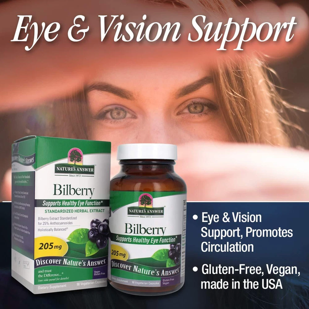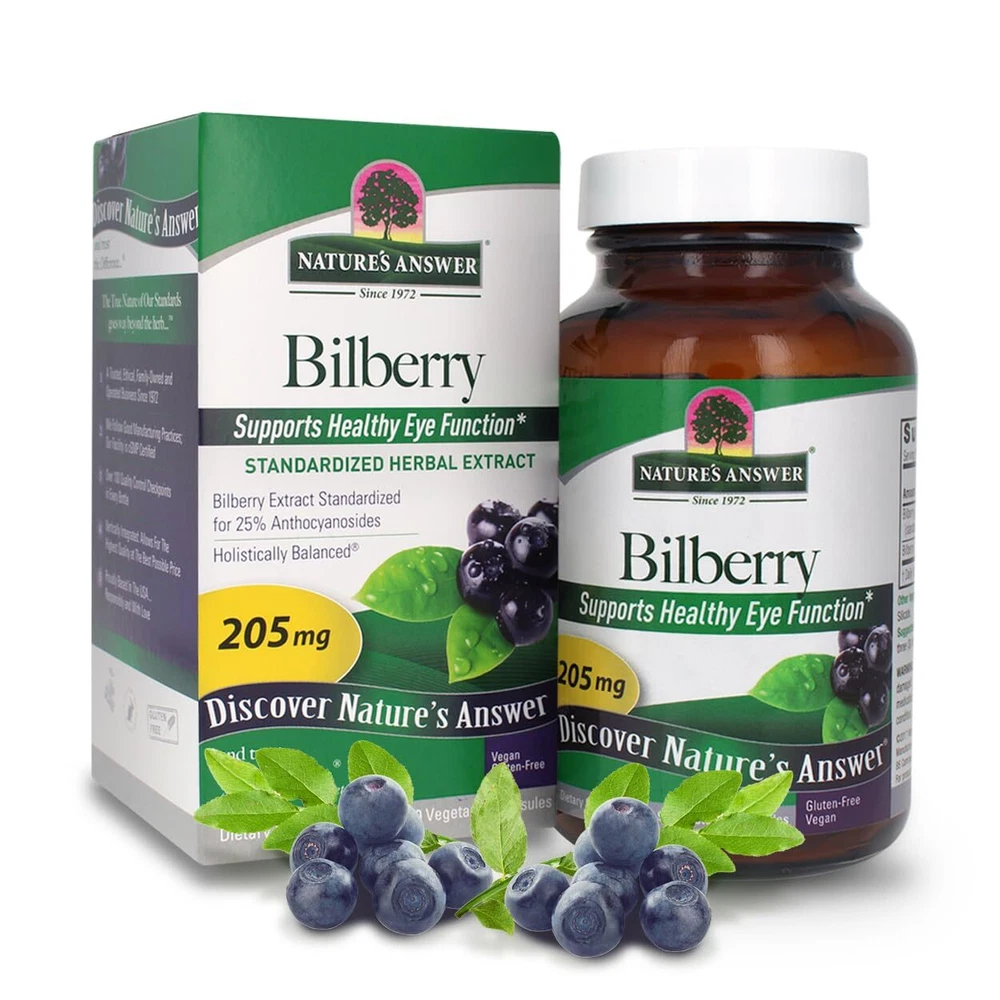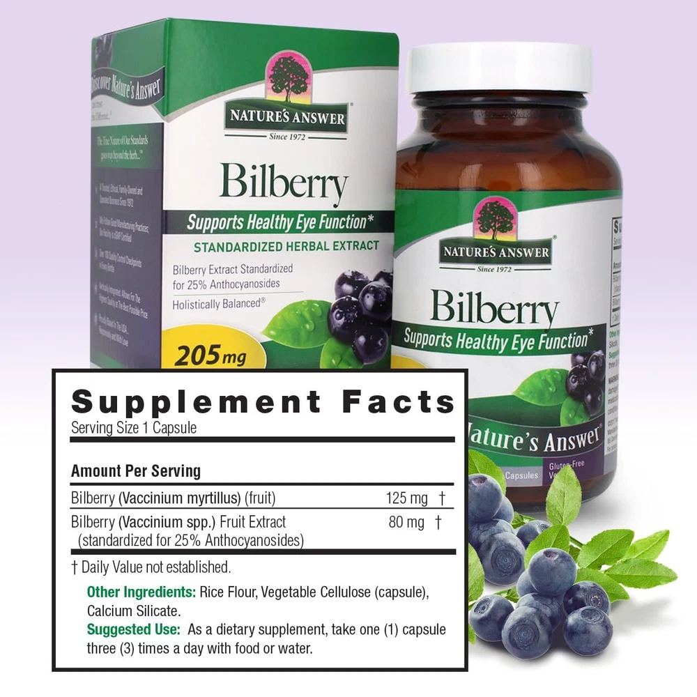 Natures Answer Bilberry Vegan offer Bilberry ( Vaccinium Spp .) Fruit Extract(standardized for 25% Anthocyanosides) along with full Bilberry ( Vaccinium myrtillus ) fruit. Bilberry is a natural source of anthocyanosides, a specific kind of flavanol believed to be responsible for the herb’s beneficial properties in promoting healthy eye function* The bilberry, a close relative of the blueberry, cranberry and huckleberry, is a member of the Vaccinium plant family. In World War II, British pilots in the Royal Air Force began consuming bilberry jam for several weeks prior to night missions in order to promote healthy eye function*. It was the success of this peculiar dietary ritual which prompted researchers to explore the phytochemistry of bilberries and isolate the active components of this delicious food. Eventually they discovered that the natural pigments and colors were responsible for the special, visual support* properties of bilberry. They named the compound anthocyanidin and classified it as a member of the bioflavonoid family. Natures Answer Bilberry Vegan offer Bilberry (Vaccinium Spp.) Fruit Extract(standardized for 25% Anthocyanosides) along with full Bilberry (Vaccinium myrtillus) fruit. Bilberry is a natural source of anthocyanosides, a specific kind of flavanol believed to be responsible for the herb’s beneficial properties in promoting healthy eye function* The bilberry, a close relative of the blueberry, cranberry and huckleberry, is a member of the Vaccinium plant family. In World War II, British pilots in the Royal Air Force began consuming bilberry jam for several weeks prior to night missions in order to promote healthy eye function*. It was the success of this peculiar dietary ritual which prompted researchers to explore the phytochemistry of bilberries and isolate the active components of this delicious food. Eventually they discovered that the natural pigments and colors were responsible for the special, visual support* properties of bilberry. They named the compoundanthocyanidin and classified it as a member of the bioflavonoid family. Natures Answer Bilberry Vegan is made and packaged in the USA. We do this to ensure that our consumers receive the most PREMIUM and SAFE product on the market. Using carefully controlled extraction techniques, we capture the holistic balance of each herb and the value is passed on to you, our customer. From plant to shelf, you can be assured that we know exactly what’s in the product in your hand, and we it is authentic, safe, effective, holistically balanced, and of course….Nature’s Answer.