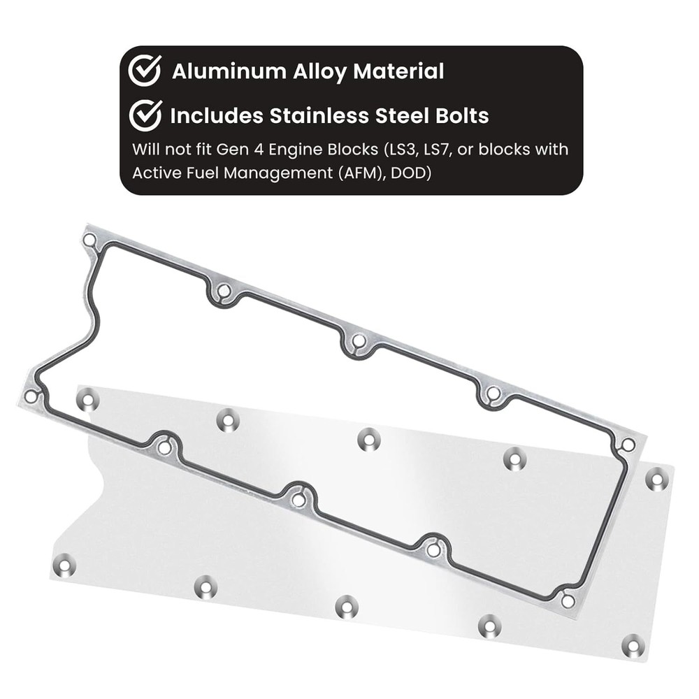 LS Gen 3 Valley Cover Plate Kit w/ Gasket For GM LS-Series 4.8L 5.3L 5.7L 6.0L Features 【FITMENT】 The EZ-EFI Cable Mount Kit is designed to work with automatic transmission TV cables and specifically marked for the unique TV cable setup of GM 700R4 transmissions. 【HIGH QUALITY】 The kit is all powder coated steel with stainless hardware. High quality with oxidation resistance provides a better appearance and long-lasting use. 【ADJUSTABLE GEOMETRY】 The adjustable geometry of the linkage kit is specifically designed to ensure proper wide open throttle actuation. 【FEATURE】 All necessary hardware included for installation and adjustment. The selection of cable mounting brackets is able to cover all major cables and applications. 【SERVICE】 If you have any troubles about the cable mount kit, please feel free to contact us. We will reply within 24 hours. Thanks for your support. Specifications Condition:100% Brand New Warranty: 90 Day Free Return:30 Day Color: Silver Material: Aluminum Fitment For LS1/LS6/LS Gen 3 Valley Pan Cover Plate Fit all Gen 3 Engine Blocks OE Number: 551629, 551629G Please Double-Check that this is compatible with your vehicle. Package Included 1x Valley Pan Cover Plate 1x Gasket Plate 10x Bolts As pictures show FAQ: I purchased by mistake, how do I cancel the order? Please contact us ASAP. If the item has not been shipped out we can cancel the order for you. If the item was shipped out you can refuse the package and wait for the item to return to us. I received your item but it does not fit or is defective Please contact us so we can assist you on the matter. Buy with confidence Our quality is based on meeting the requirements of the manufacturer and improvement them in design problems manufacture. NOTE: (1)It would be highly appreciated if you might contact us first once you have any problems concerning the items. And you can expect all the issues would be resolved ASAP! (2)Please let us know before you send us the neutral/negative feedback that wont help to finish the issues. And I will definitely try my best to provide the best solutions which would meet our satisfactory! (3)According to the distance of the receipt address items would be sent from CA or NJ