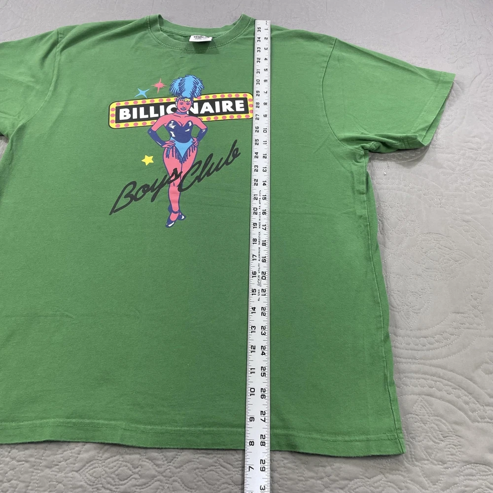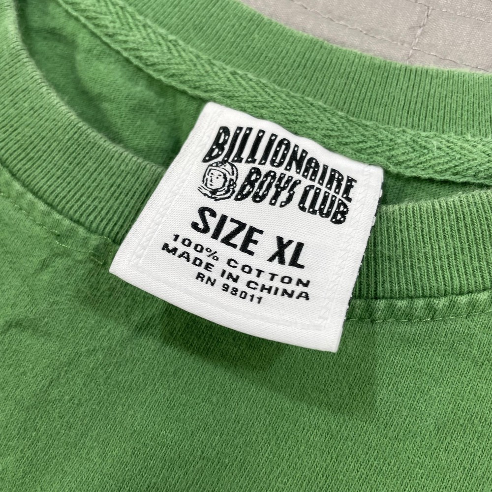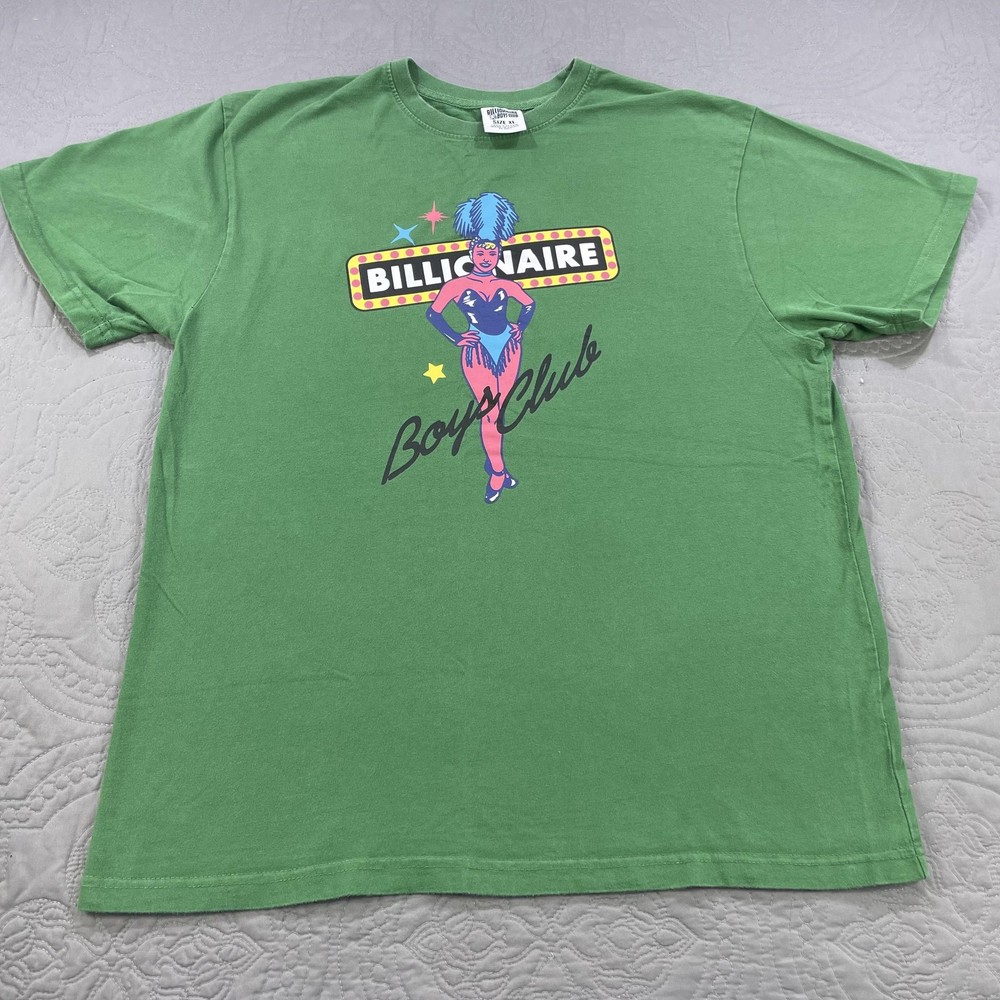 Brand: Billionaire Boys Club (BBC) Item: Men's short sleeve crewneck shirt Tag size: XL Color: Green Front graphic: Showgirl with marquee sign reading "BILLIONAIRE" and "Boys Club" script with stars Back detail: Astronaut logo print at back neck Material: 100% Cotton Care tag notes: HAND WASH COLD; WASH SEPARATELY; WASH INSIDE OUT; DO NOT BLEACH; LOW IRON ON REVERSE; DO NOT IRON ON DECORATION; DO NOT APPLY HEAT DIRECTLY ON PRINT OR EMBROIDERY AREA Made in China RN: 98011 Style notes: Streetwear graphic tee with iconic BBC astronaut branding Notes: Colors may vary slightly due to lighting and screens.