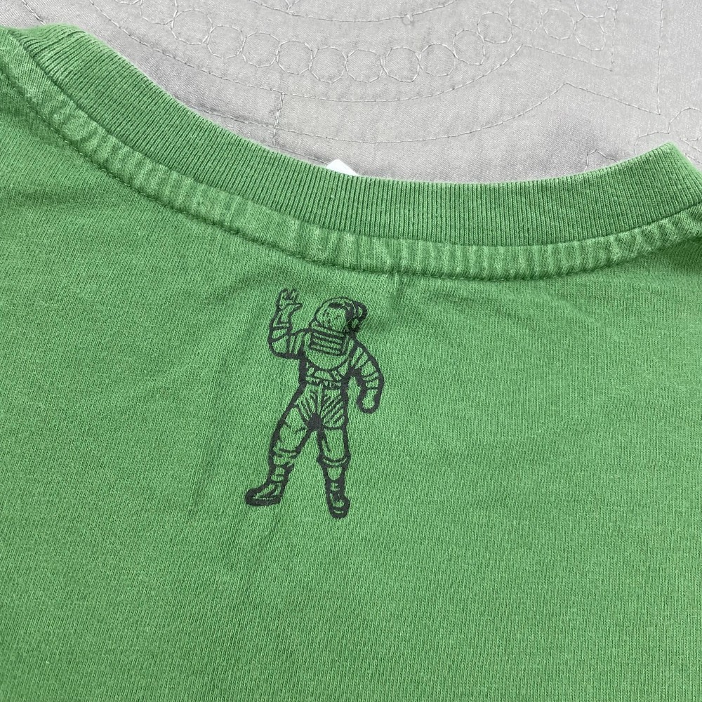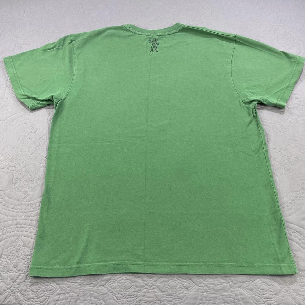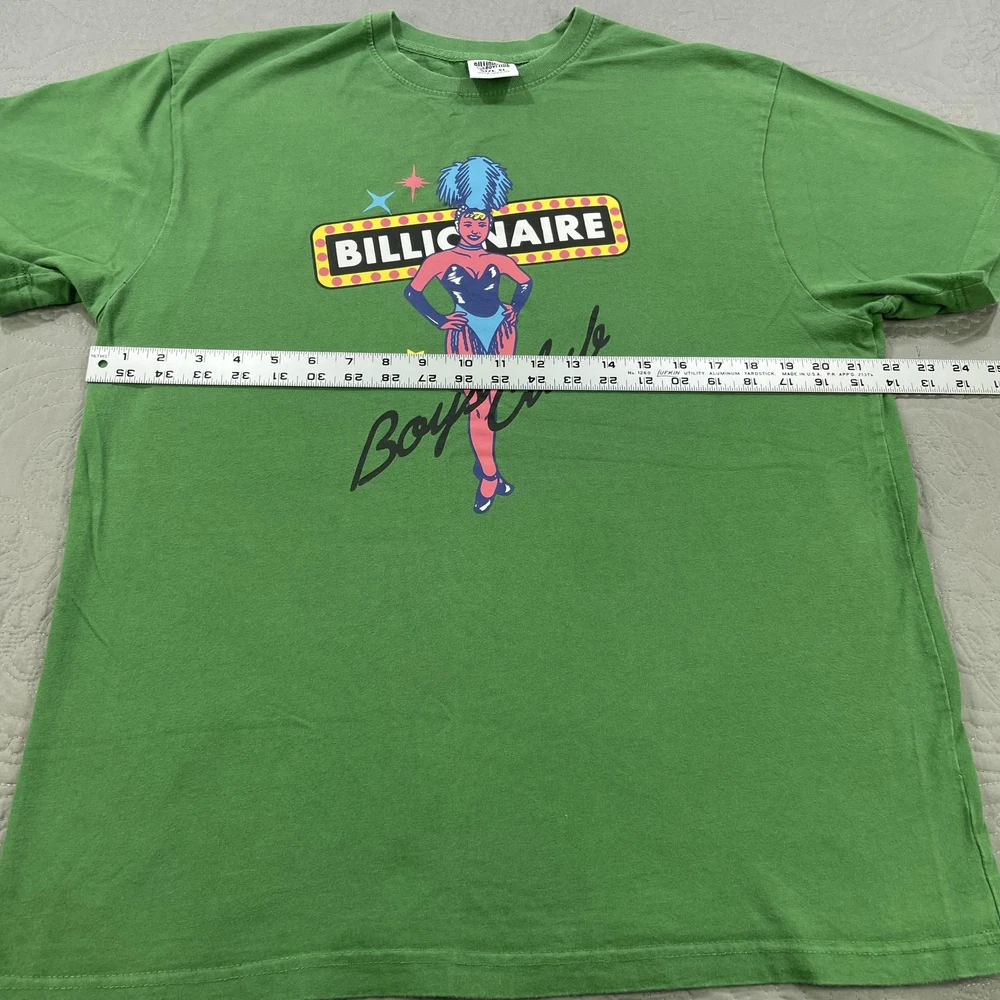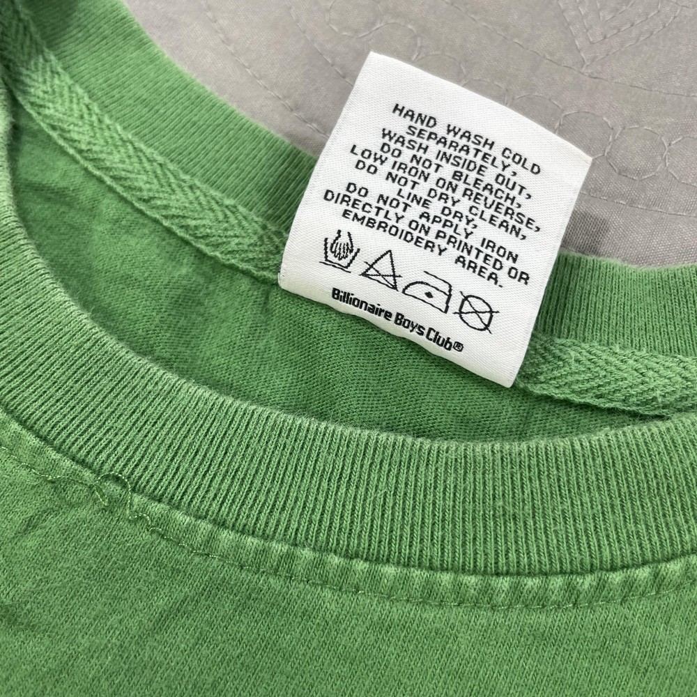 Brand: Billionaire Boys Club (BBC) Item: Men's short sleeve crewneck shirt Tag size: XL Color: Green Front graphic: Showgirl with marquee sign reading "BILLIONAIRE" and "Boys Club" script with stars Back detail: Astronaut logo print at back neck Material: 100% Cotton Care tag notes: HAND WASH COLD; WASH SEPARATELY; WASH INSIDE OUT; DO NOT BLEACH; LOW IRON ON REVERSE; DO NOT IRON ON DECORATION; DO NOT APPLY HEAT DIRECTLY ON PRINT OR EMBROIDERY AREA Made in China RN: 98011 Style notes: Streetwear graphic tee with iconic BBC astronaut branding Notes: Colors may vary slightly due to lighting and screens.