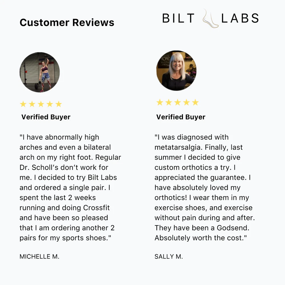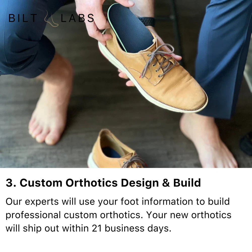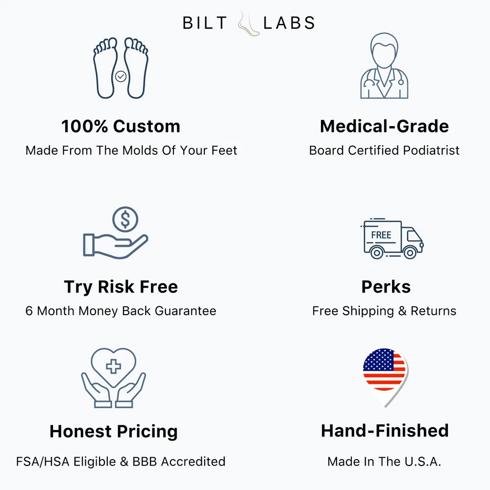 Custom Orthotics For For Flat Feet Bilt Labs | U.S.A made custom orthotic insoles. Made From Molds Of Your Feet. You receive the same medical grade process and materials Bilt Labs gives doctors nationwide that order from them for their patients. 100% Custom Made For Your Specific Needs. What Makes Bilt Labs Different: Custom Made From Molds Of Your Feet 6 Month Money Back Guarantee Free Shipping & Returns Board Certified Podiatrist FSA/HSA Eligible & BBB Accredited Made In The U.S.A Custom made to address flat feet as well as associated conditions such as plantar fasciitis, overpronation & more. These everyday flat feet custom orthotics are designed for normal day to day activities, work and non high impact activities. Made from the molds of your feet, they are designed to provide optimal arch support to bring your foot back to its natural position. This reduces and eliminates over pronation by correcting foot alignment. By correcting the flat feet with the custom arch support we also help eliminate associated condition such as overpronation and plantar fasciitis, helping to improve your foot health and relieve common foot pains.