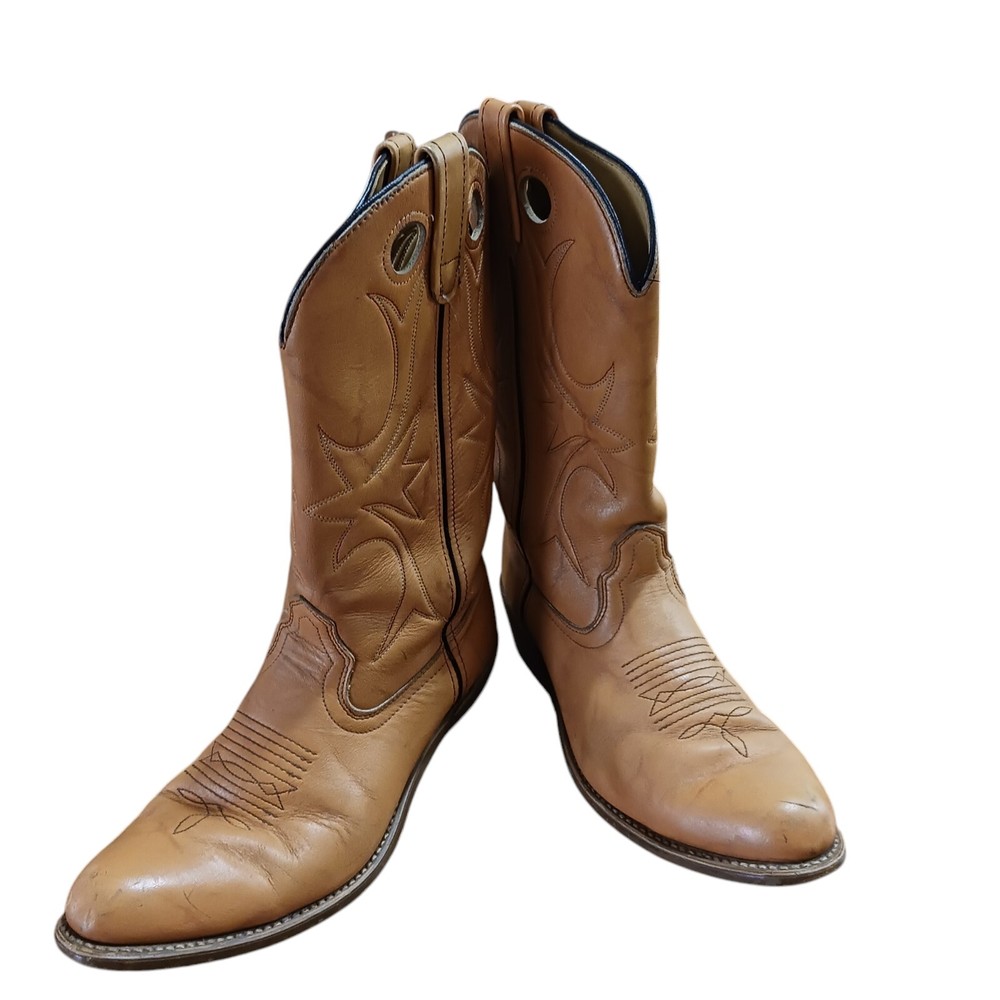 Smokefree petfree Almond toe shape Scuffing throughout Low heel Pull on Tabs on one boot faded