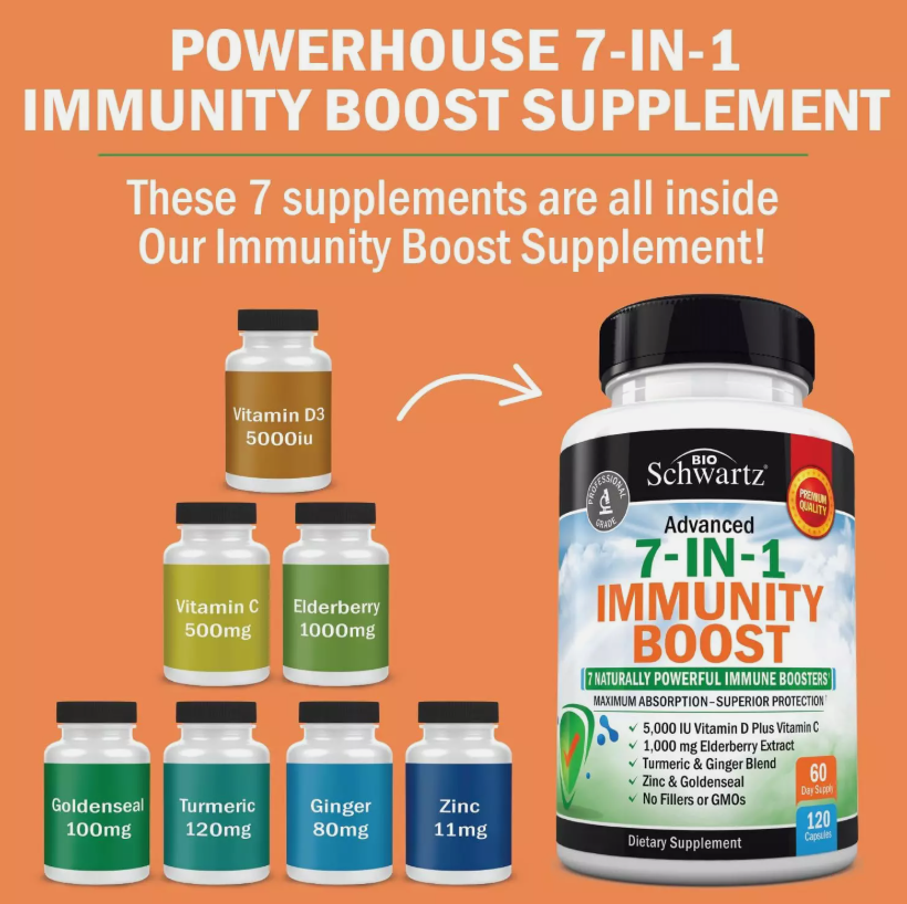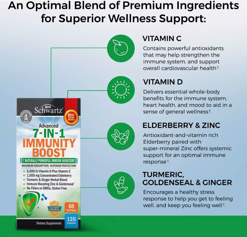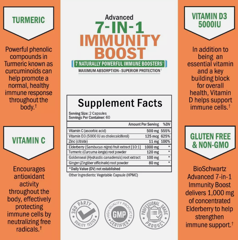 Natural immune boost: BioSchwartz Advanced 7-in-1 Immunity Boost is powered by proven immune boosting ingredients including Vitamin D, Vitamin C, Elderberry, Goldenseal, and Zinc for lasting protection towards your immune health Multi-system immune defense: BioSchwartz Advanced 7-in-1 Immunity Boost features Goldenseal and Turmeric, both potent antioxidants to support immune health, respiratory health, and a healthy inflammatory response throughout the body Promotes antioxidant activity: BioSchwartz clean and ultra-pure immunity boost has powerhouse antioxidant ingredients including Elderberry, zinc, and Vitamin C to help fight off free radicals that can damage cells and impact immune health Purity tested and allergen free: Each and every batch of BioSchwartz 7-in-1 immunity boost formula is third party tested to guarantee a high purity, potency, and premium quality. This formula has been manufactured without gmos, soy, gluten, milk, egg, wheat, peanuts, or shellfish. They also don't include preservatives, artificial ingredients, fillers, chemicals or color additives Formulated by professionals: Each one of our professional grade supplements is created by a team of highly experienced healthcare professionals in the USA to ensure the greatest benefits are achieved