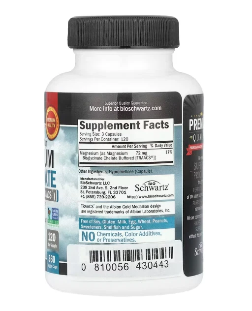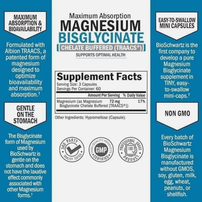 Easy-to-swallow mini-capsules: BioSchwartz has developed a pure magnesium bisglycinate supplement in tiny, easy-to-swallow mini-caps! This formula is free of binders, fillers, and other chemical additives Easy on the stomach with no laxative effect: This vegan and vegetarian formula comes in easy-to-swallow tiny capsules for optimal absorption and bioavailability while being well-tolerated without the laxative effect. Potent with countless benefits: May help protect against muscle soreness and support the absorption of other minerals like calcium and potassium. Magnesium Bisglycinate may also encourage increased energy levels while supporting cardiovascular and digestive health High Bioavailability: BioSchwartz Maximum Absorption Magnesium Bisglycinate capsules are formulated with Albion TRAACS, a patented form of bioavailable magnesium for maximum absorption Formulated by professionals: Each one of BioSchwartz’s professional grade supplements is created by a team of highly experienced healthcare professionals in the USA following strict GMP guidelines to ensure the greatest benefits are achieved