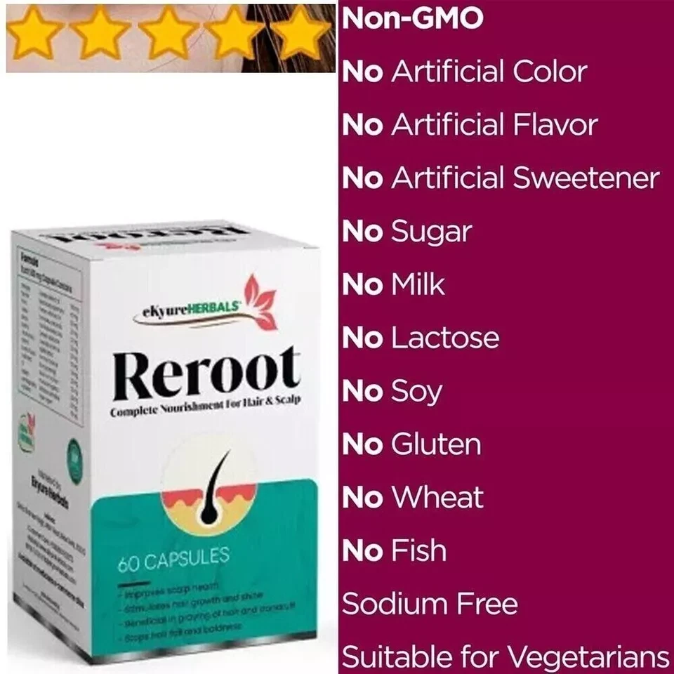 Hair Growth Supplement for Thicker Fuller Hair | Approved* by the Indian Dermatologist | Hair Loss Association | Revitalize Thinning Hair, Backed by 20 Years of Experience in Hair Loss Treatment Clinics GET FULLER THICKER HAIR with TRUSTED HAIR GROWTH SUPPLEMENT for Women and Men. Support optimal thyroid function, liver health, stress, vitamin D, and iron levels. Uses patented hair growth ingredients: Opti MSM and clinically developed cellular support with 5000mcg of Biotin, Saw Palmetto, Hyaluronic Acid, and Vitamin D3, along with 28 herbs and vitamins GLUTEN FREE VEGETARIAN EXTRA STRENGTH HAIR LOSS SUPPLEMENT: Reroot dual action formula targets underlying nutritional deficiencies providing therapeutic amounts of key hair growth herbs, minerals, and vitamins. Supports hair, skin, and nails SCIENTIFICALLY RESEARCHED, 3RD PARTY TESTED: Made in a India with Global Ingredients, GMP-Certified Facility. Gluten Free, Soy Free, Wheat Free, and Vegetarian Hair Growth Pills. 100% MONEYBACK GUARANTEE and CERTIFIED. Exceptional Results for Women and Men with Multiple Hair Loss Reasons Supports healthy levels of keratin in the hair Lessens breakage by targeting hair dryness Lowers the risk of hair loss due to sebum buildup Enhances collagen levels in the hair Targets male and female pattern baldness Heightens stem cell activity for continuous hair growth Encourages the growth of inactive follicles Heightens the flow of oxygen and nutrients to hair follicles Targets hair loss by blocking DHT activity Heightens blood circulation and nutrient transfer DIRECTIONS: Take (1) one capsule in the morning and (2) two capsules at night with food to experience the results. FOR BEST RESULTS: Use together with DHT Blocker and EFA Complete Supplements. Note: This Product is designed to deliver optimal results, offering high-quality performance and satisfaction. Please note that individual experiences and outcomes may vary based on personal use, preferences, and unique circumstances. For best results, we recommend following the provided guidelines and ensuring the product is used as intended. Product result may vary for every individual.