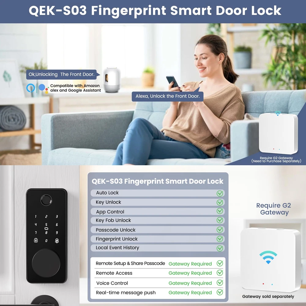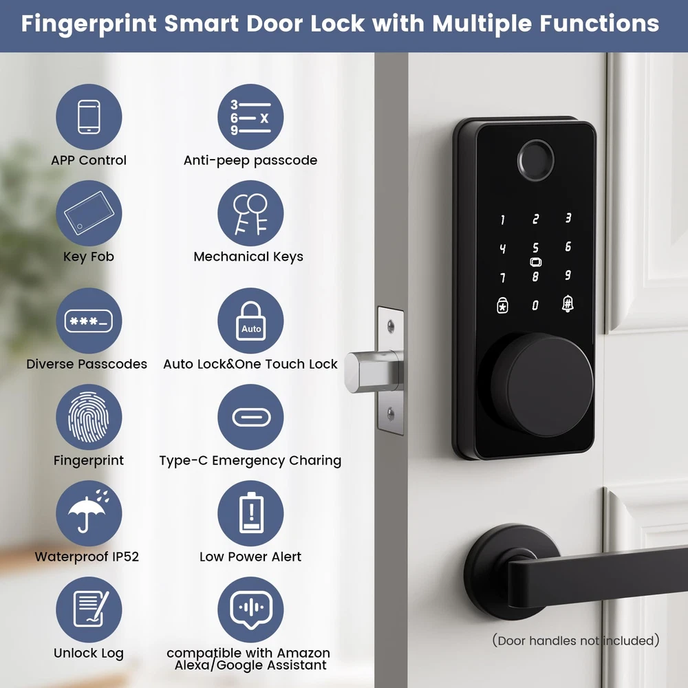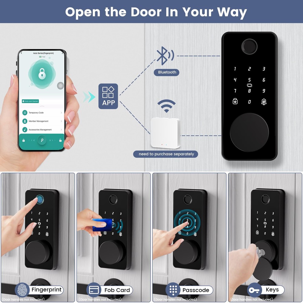 Fingerprint Smart Deadbolt: Biquole Smart Door Lock can recognize your fingerprint in just 0.3 seconds, and unlock your door in 0.5 second, faster than fumbling for your keys 5in1 smart door lock: 5 ways to unlock your door - APP, Keypad, Fingerprint, IC Fob and Mechanical Keys. Paring with WIFI gateway, device user could remotely control your smart wifi door lock anywhere anytime, set up codes remotely and check real-time access log Customized management: Sign in APP of Bluetooth Deadbolt Door Locks for Front Door, you could check the records about unlocking and wrong passcode in real time. Door Lock with Code allow setting to generate Timed, Permanent, One-time or Customized passcode for guests, friends, housekeepers or employees Secure and Durable: Intuitive touchscreen digital keypad, Alloy body, Long Battery Life, 4pcs AA batteries can provide 10,000 openings (approx. 12 months), For security reason, Smart Deadbolt will automatically lock for 5 minutes when enter the password incorrectly more than 5 times. A great solution for home hotel Airbnb etc Easy to Install: With only a screwdriver and 10 minutes of your time, you can easily install our electronic door lock yourself, saving you contractor fees
