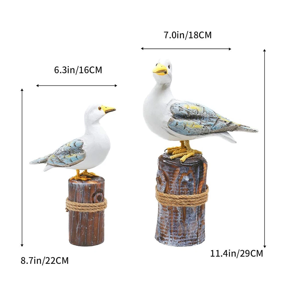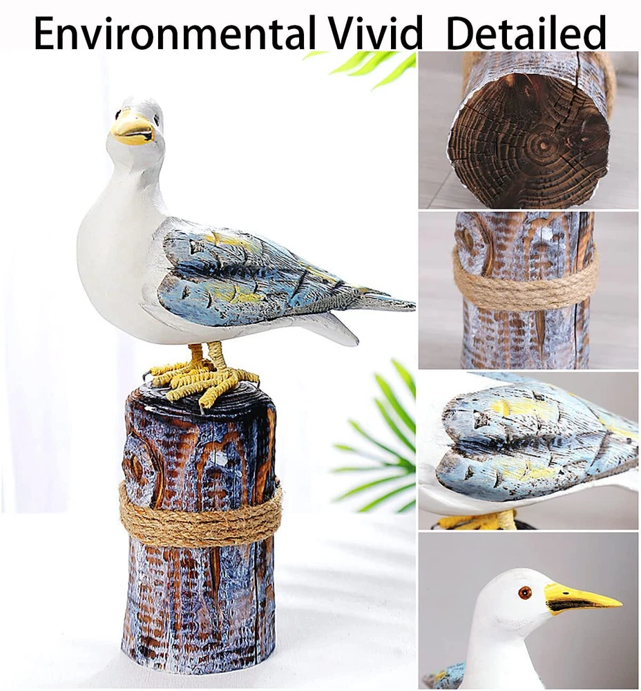 "Bird Beach Decor Statue 1.How many seabirds are there in it? This home decoration includes a pair of seabirds, one large and one small, to create a more complete look and add fun and liveliness to your living space. 2.What style does it match? Although inspired by marine birds, it can actually match any style. We put it in traditional style, modern style, coastal style, and Mediterranean style, and it can be well matched. 3.Is it suitable as a gift? Of course, it is. Each one is handmade, giving each product its own personality. With high-quality wood and superb carving and painting skills, this product looks very upscale. Putting it at home can make us feel relaxed, and who can resist such cute seabirds? 4.How big are the two birds? The bigger one is 11.6x7x3 inches, and the smaller one is 8.6x5.3x2.5 inches. 5.What materials is it made of? Most of it is made of wood, and only the legs are made of iron and brown rope, which looks very vivid." 【Coastal Beach Decor gift】-This home decoration uses a coastal beach style to fill your home or hotel with oceanic vibes, creating a comfortable and relaxing atmosphere. 【Nautical Birds Statue】-This pair of seabirds is hand-carved and hand-painted by well-known local craftsmen, making them incredibly vivid and rich in detail, showcasing the charm of handicrafts. 【Wood Art Gift】This home decoration is crafted from high-quality wood, painted with eco-friendly paint, and paired with brown rope and iron, ensuring a safe and eco-friendly usage.Its a perfect gift for everyone, especially for those who love the ocean, sailors, navy officers, fishermen, residents living by the sea, marine workers etc. 【Size of Home Ornament】This home decoration includes a pair of seabirds, one large and one small, to create a more complete look and add fun and liveliness to your living space.The bigger one is 11.6x7x3inches ,The smaller one is 8.6x5.3x2.5inches. 【Customer Service】If you have any questions during the purchase or use of our product, please feel free to contact us at any time. Our online customer service team will provide you with fast and professional assistance.