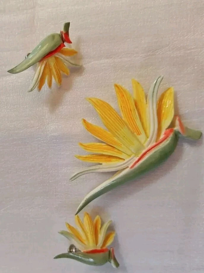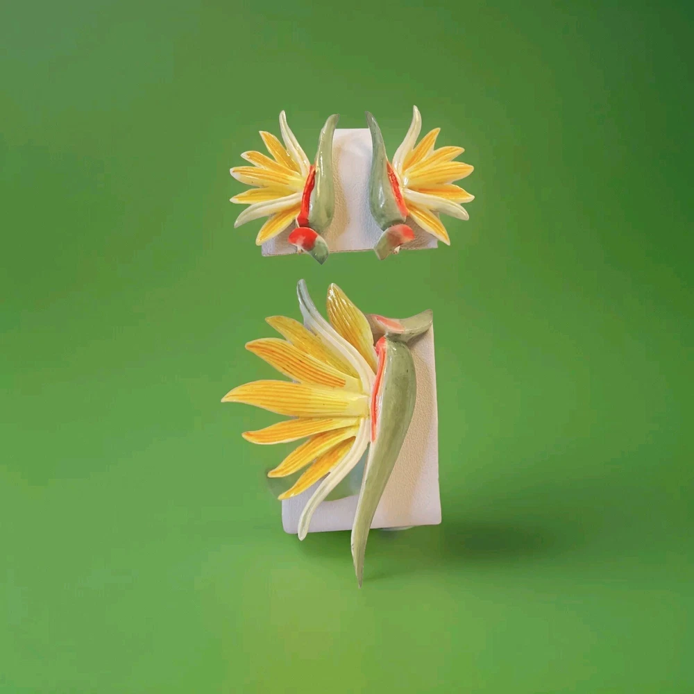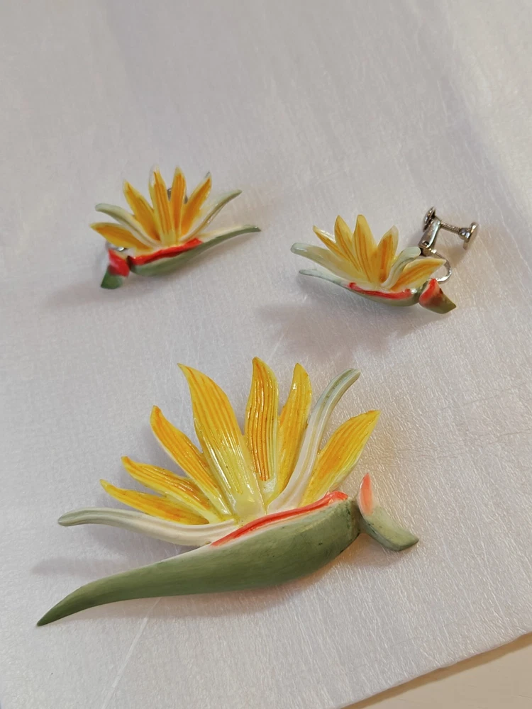 Add a touch of the tropics to your jewelry collection with this beautiful bird of paradise enamel painted acrylic or plastic brooch and screw clip back earrings set. The vibrant colors of yellow, orange, and green make this set a perfect choice for a sunny day out or a beach vacation. The set includes earrings that feature the same enchanting bird of paradise design as the brooch. The intricate details of the enamel work make this set a true work of art and a unique addition to any collection. The vintage feel of the set adds a touch of nostalgia and makes it perfect for those who love fairytales and fantasy. This set is a must-have for women who love to add a pop of color to their outfits and stand out from the crowd. Pre-owned in very good condition.