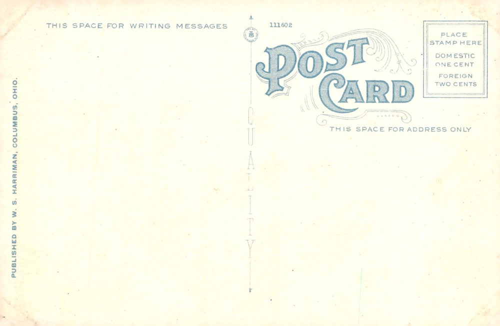 This postcard features a bird's-eye view of the State Capitol in Columbus, Ohio. Published by W. S. Harriman, it offers a space for writing messages and address. Domestic postage is one cent, while foreign is two cents.