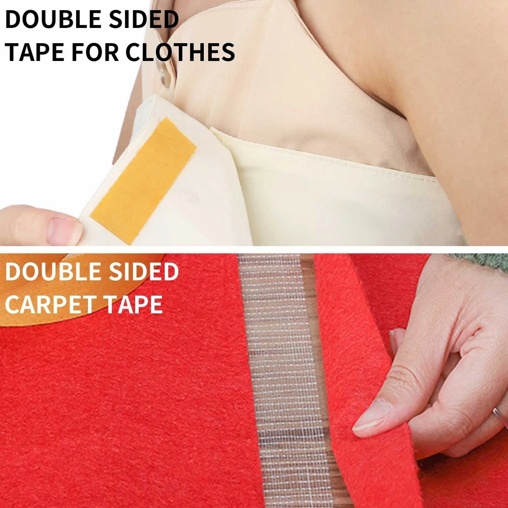 MULTIFUNCTION DOUBLE SIDED TAPE:Our fabric tape double sided sticks strongly to surfaces such as carpets,rugs,runners,fridge,photo frames,nameplates,home accessories,can works on sofa cushions,doormats,car mats,clothes,and suitable for different surfaces like hardwood,tile,plastic,concrete etc HIGH STICKY DOUBLE SIDED TAPE:The double sided mounting tape is made of PE and extra strength fabric cloth mesh, coated with super sticky clear glue under industrial standard, providing premium grade quality and easy usage for carpet seam tape DOULE SIDED TAPE FOR CLOTHES:Easy to cut in any size as you need,take control of your clothes with our premium fabric tape double sided; designed to help you with all your fashion emergencies and clothing adjustments. Hold your clothing securely against your skin or undergarments, all while ensuring maximum comfort and discreteness DOUBLE SIDED CARPET TAPE:The double adhesive holds the rug or carpet to floor tightly, hence rugs or carpets will not peel back up and cause danger of people getting tripping over Designed to help you with all your fashion emergencies and clothing adjustments. Hold your clothing securely against your skin or undergarments, all while ensuring maximum comfort and discreteness