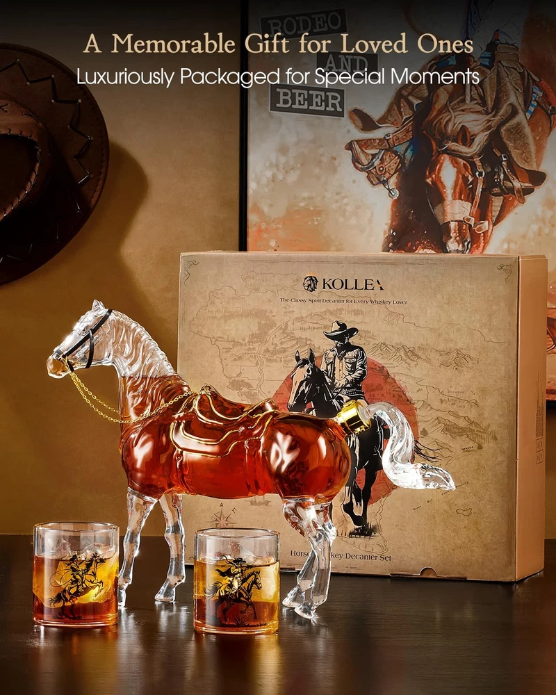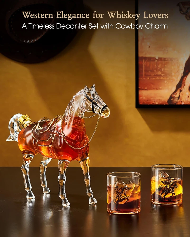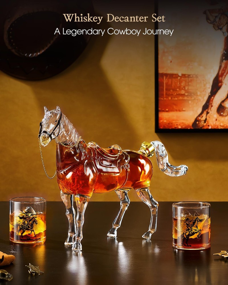 Horse Whiskey Decanter Set – Wild West Elegance Key Features: 64.3oz Horse Decanter + 2 Glasses – Perfect for whiskey, bourbon, or tequila. Western Cowboy Design – Gold-trimmed saddle for a rugged, luxurious look. Lead-Free Crystal Glass – Handcrafted for purity & smooth taste preservation. Elegant Gift Box Included – Ready for birthdays, holidays, or personal use. Fidget Spinner Stopper – Adds fun to every pour. Premium Craftsmanship Handmade from high-quality, lead-free glass, this decanter set balances durability and elegance. The 64.3oz (1.9L) capacity is ideal for entertaining, while the cowboy-themed glasses enhance your home bar’s style. The Ultimate Whiskey Gift Presented in a Western-themed gift box, this set makes a memorable gift for bosses, fathers, husbands, or whiskey lovers. The unique horse design pays tribute to Wild West heritage. Quality Guarantee We stand by our products with 24/7 customer support. Enjoy a seamless experience from purchase to pour. Saddle Up for Adventure—Order Today! Legendary Western Cowboy Inspiration: Inspired by the legendary steeds of 19th-century Western cowboys, the Horse Whiskey Decanter embodies the pioneering spirit of the Gold Rush era. With the saddle outlined in gold, it brings cowboy culture to your collection. Ideal for whiskey lovers, this liquor decanter takes you on a Wild West adventure with every pour Premium Artisan Glassware: Handcrafted from high-quality, lead-free glass, the Whiskey Decanter Set blends durability with elegance. Meticulously assembled by skilled artisans, each decanter ensures impeccable craftsmanship. Carefully shaped to preserve the authentic flavor of whiskey, bourbon, or tequila, delivering a rich, smooth taste with every pour Generous Capacity for Any Occasion: With a 37.2oz decanter and two 9.8oz glasses, this Whiskey Decanter Set is ideal for serving whiskey at gatherings. The large capacity is great for entertaining, while the Western cowboy motifs on the glasses add a unique touch. Whether hosting a social event or intimate gathering, this set is a conversation starter and standout piece for your home bar Ultimate Whiskey Decanter Gift Set: This whiskey decanter set arrives in a beautifully designed, Western cowboys-themed gift box with pearl cotton protection.The decanter for alcohol includes a stylish fidget spinner for extra fun. Whether gifting to a boss, husband, father, brother, or friend, or treating yourself to a luxurious experience, this set is the ideal choice for any special occasion Timeless Collectible for Whiskey Lovers: This whiskey decanter is a tribute to the rugged, bold spirit of the Wild West. Every pour captures cowboy culture, with a design that blends history and craftsmanship. Whether for collectors of Western-themed items or those who appreciate the ritual of fine whiskey, this decanter enhances your home bar with its classic appeal and modern elegance