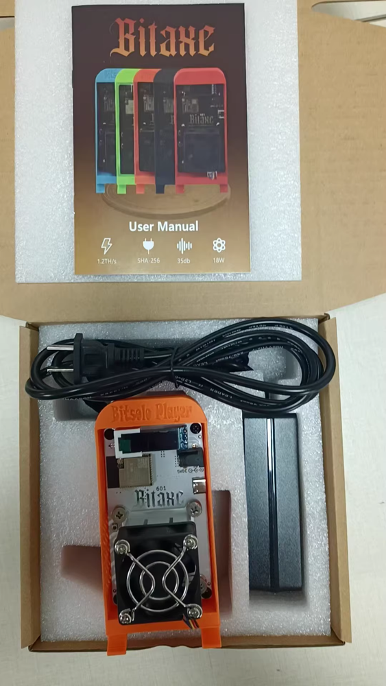 🔹 Product Overview The Bitaxe 601 Gamma is the most powerful open-source single-chip Bitcoin miner available. Powered by the BM1370 ASIC chip —the same chip used in the Bitmain Antminer S21 Pro—this compact miner delivers impressive hash power and energy efficiency, making it perfect for desktop and home mining setups. 🔧 Key Specifications Model : Bitaxe 601 Gamma ASIC Chip : BM1370 (same as Antminer S21 Pro) Hashrate : ~1.2 TH/s Power Efficiency : ~15W/TH (approx. 18W total) Controller : ESP32-S3-WROOM-1 with built-in WiFi Cooling : 40×40mm aluminum heatsink + 5V silent fan Display : 0.91" OLED screen (SSD1306 I2C) ✅ Product Features ⚡ High Efficiency : Powerful hashing with low power consumption 📡 Built-In WiFi : No Ethernet cable needed—connect and monitor wirelessly 🖥️ Real-Time OLED Display : Monitor hashrate, uptime, temperature, and more 🌍 Global Voltage Support : Works worldwide with 5V USB-C input 🔇 Quiet Operation : Ideal for home, office, or lab use 🛠️ Open-Source Design : Fully hackable and developer-friendly 📦 What’s Included 1× Bitaxe Gamma unit 1× 5V cooling fan (pre-installed) 1× 0.91" OLED display (pre-installed) 1× Quick Start Guide 📌 Notes Product appearance, color, or printed text may vary slightly by batch. These do not affect performance or usage. Perfect for developers, hobbyists, or anyone interested in learning about ASIC mining in a small, manageable form factor. 🚚 Shipping Info Ships from : China Warehouse Worldwide Shipping : Tracking provided Handling Time : 3–5 business days