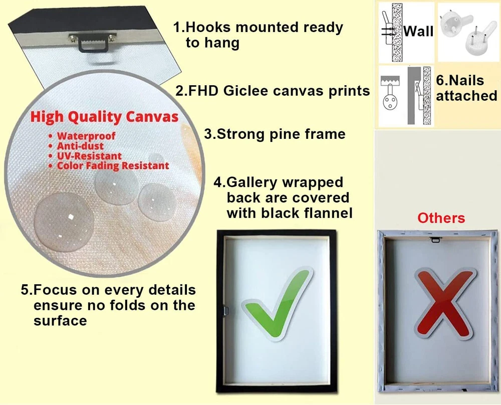 Small Size Wall Decor: 12"Width X 12"Height X 4 Piece a set (Inch) Staples Not Exposed: Neat flannel covered the staples protect the wall from damage FHD Giclee Canvas Prints: More colors and details you can see than usual with Eleven-Color Eco Ink tech, non-fading, no smell for kids compare with hand painted oil painting Easy to Hang: Each wall pictures with a hook mounted and accessory kit included, strong stretcher bars ensure no damage in transit Perfect Gift for Home Decoration: Artworks are perfectly for your bedroom, living room, kitchen, dining room, bathroom, office, laundry, hallway, corridor
