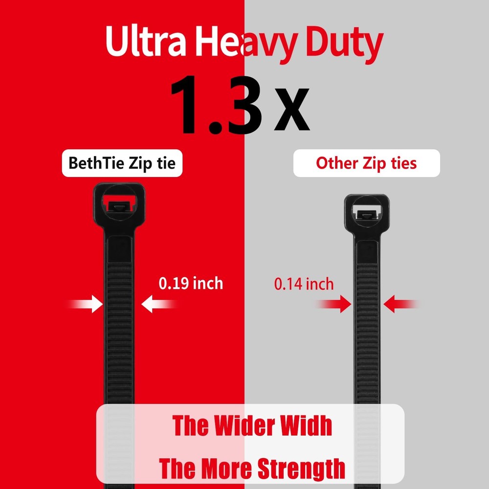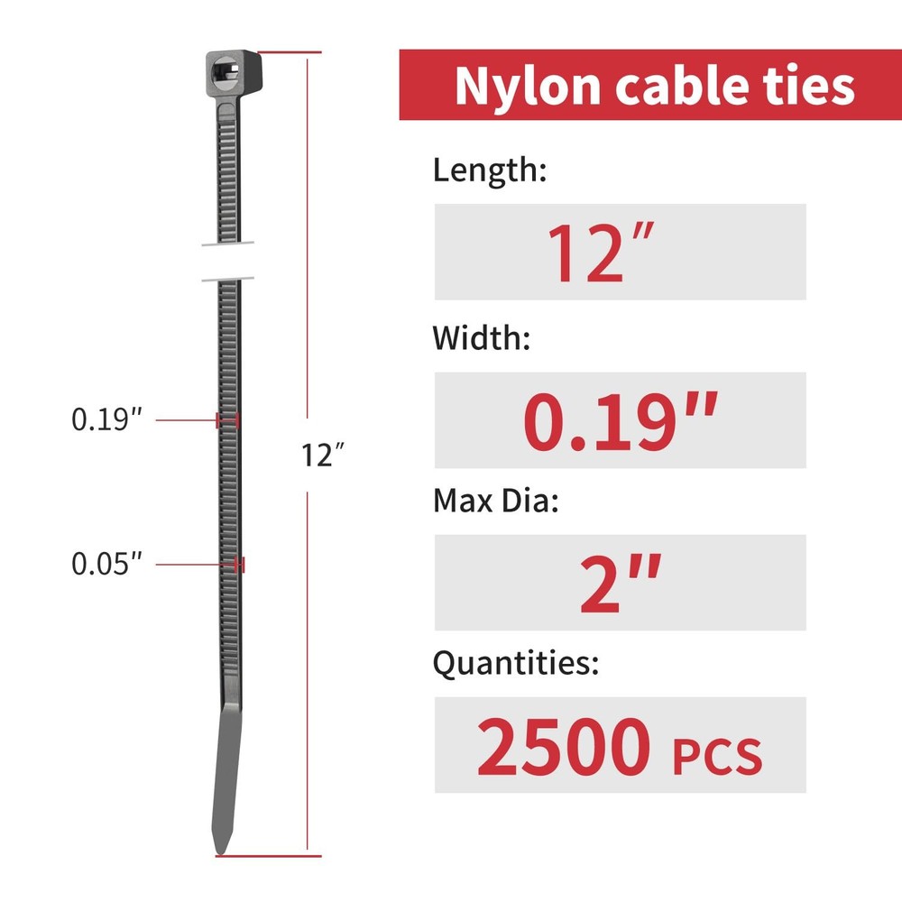 8 Inch Black Zip Ties (2500 Pack), 65 LBS Tensile Strength, Self-Locking Nylon PA66 UV Resistant Cable Ties for Indoor and Outdoor Use 【Details】 Dimensions: Quantity: 2500 PCS | Length: 12" | Width : 0.14" | Max Dia: 3.25" |Tensile Strength: 65lbs | With zip ties, you don't have to worry about The quality of the zip ties. 【High-quality material】Industrial-strength nylon 66 fireproof material is used, which can be used in the environment of -35℃ to 85℃, Features strong load ability, anti-aging, anti-acid, anti-corrosion and durability. 【Easy-using】You only arrange the things to be bundled, and then bend one side of the small saw blade inward, pass the arrow through the other part of the button, and easily pull it. 【Wide Application】Zip Ties is perfect for tying cables, plants, packages, etc.It is a good helper for family, office, garden, workshop and other places. 【After Sales】If You have any dissatisfaction with the product, We offer a 30-day refund/return policy. What Eletoo provide is not only good products, but also quality services. Try it, completely risk-free! Hurry up and click to add to the shopping cart!