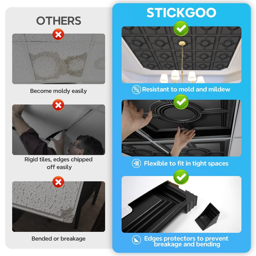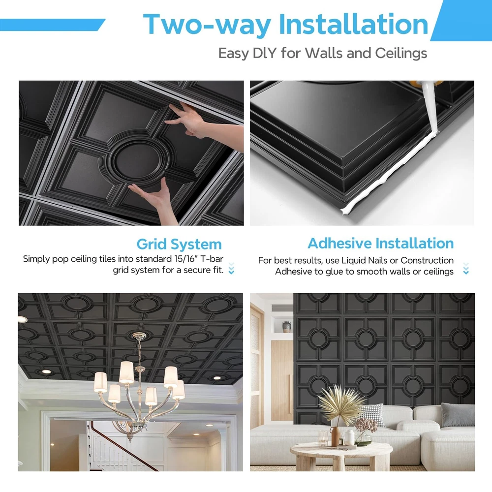 These ceiling tiles are a game-changer! The matte black finish adds a sleek, modern touch to any room, and the lightweight PVC material makes them super easy to install—just glue or drop into a grid. They’re durable, waterproof, and won’t warp or fade, so they’ll look great for years. Perfect for upgrading a drab ceiling into something stylish without the hassle. Highly recommend for a quick, affordable refresh!