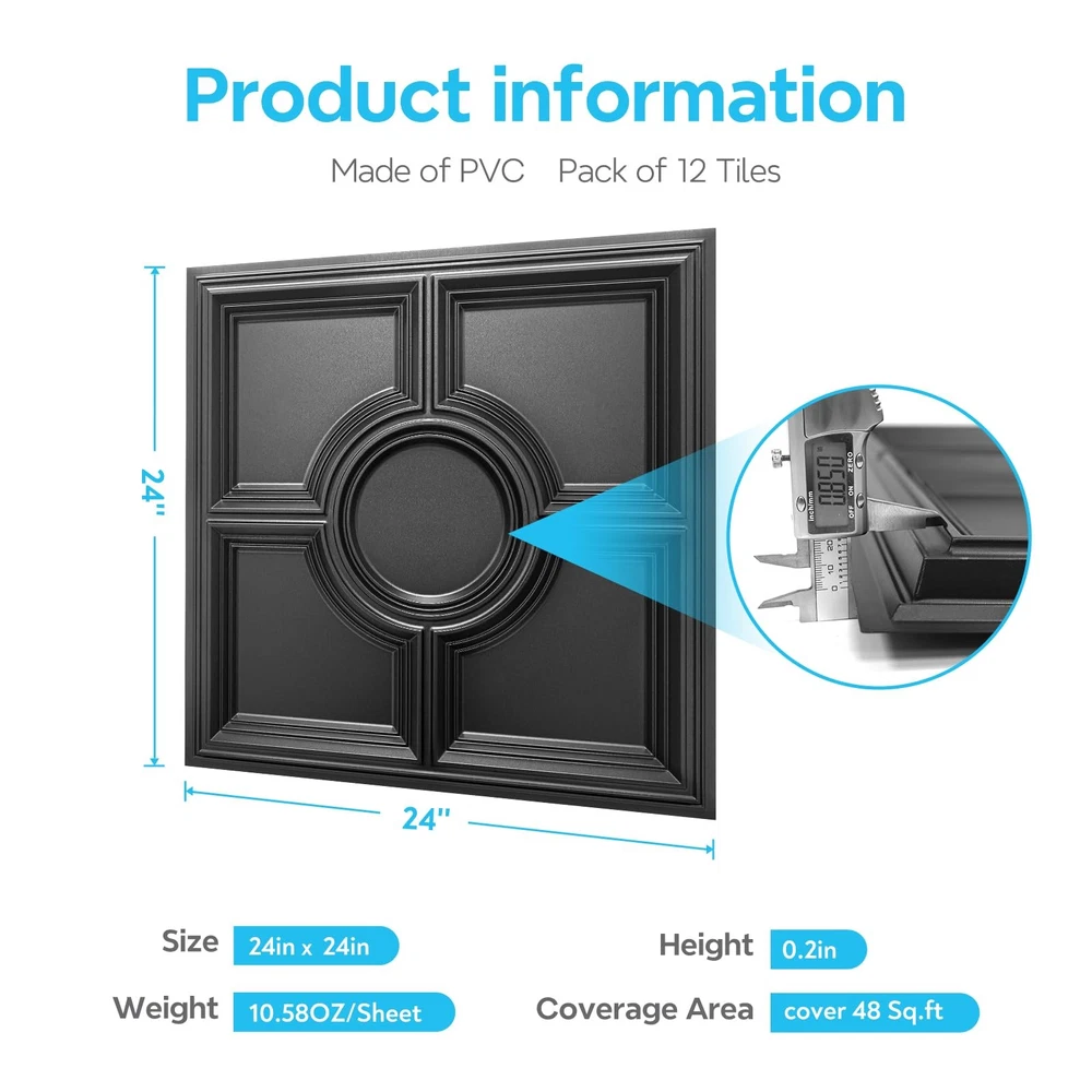 With a little creativity, you can dress up your drop ceilings and turn them into a beautiful focal point. Premium Material: Crafted from high-quality, recycable PVC material, features lightweight and flexibility, waterproofing, fire-resistant, allowing for convenient maintenance. Resistant to cracking, fading, or warping over time, ensuring a long-lasting ceiling panels. Easy Installation: Drop Ceiling Tiles are compatible with 15/16" T-bar grid system or glued over any flat substrates; easy to cut with utility knife or scissors for light fixture or any less than full-size grid spaces Multipurpose: These elegant stylish 3D designs are excellent no matter for remodeling or new construction to ceiling or wall decoration. Also a great choice to accent featured wall design. Versatile Application: Drop ceiling tiles can be used in commercial settings such as offices, retail stores, and restaurants, fitting room enhancing the overall aesthetic; As well as in residential renovations, like apartments, basements, home theaters, and bedrooms Package Specification: A single package contains 12 ceiling tiles, each measures 24x24 inches, total covering 48 sq.ft. Carefully packed with 4 edges protectors to prevent breakage and bending, ensuring flawless condition upon arrival