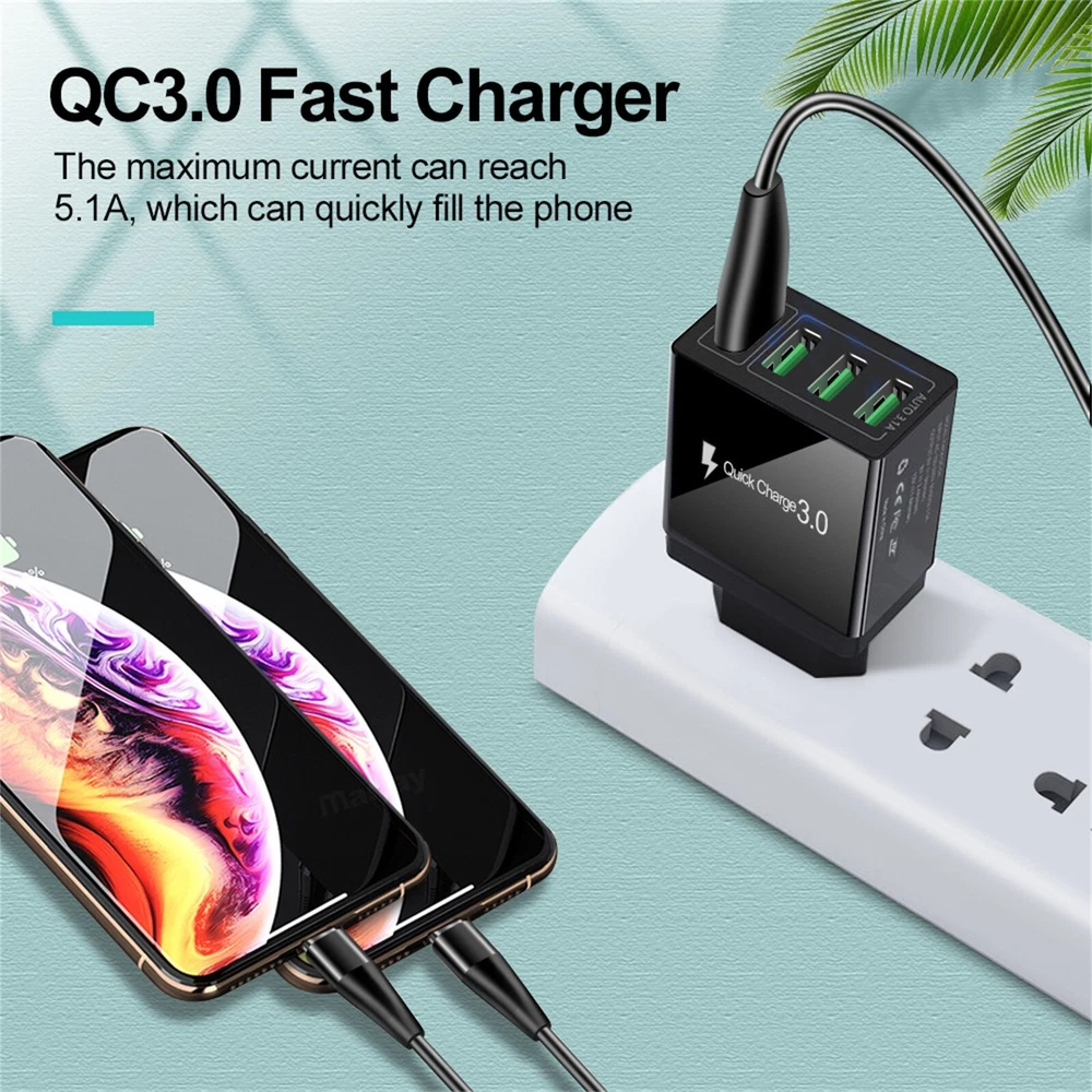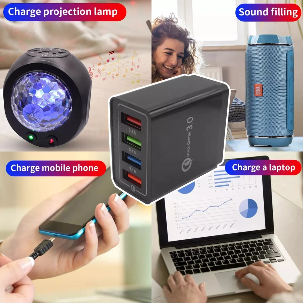 Black US 4 Port Fast Quick Charge QC 3.0 USB Hub Wall Charger Power Adapter Plug Description 1. Portable charger for home, office, travel and other indoor uses. 2. 4 USB ports (fast charge 3.0 and 4 USB ports 5 V/ 3A max.), Load 4 devices at the same time. 3. The protections keep you and your devices more secure. 4. Compatible with all smartphones for iPhone iPad Samsung Xiaomi, Huawei, OPPO, OnePlus, Sony, Google and PC Camera Tablet MP3, MP4 player, PSP with USB port. 5. Intelligent matching stream. Integrated smart chip, according to different devices, compatible with the required output, fast charging and does not damage the battery. Specifications: 1.Input voltage: 100-240 V 50-60Hz 2.Output: 5 V / 3 A (max.) 3.Standard plug: American plug 4.Color: Black Package Included: 1 x QC 3.0 Quick Charger
