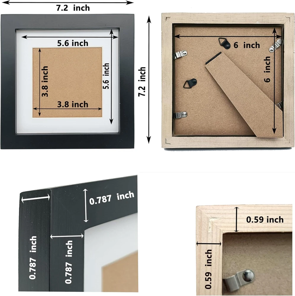 Tip, 1, The protective film on the plexiglass panel needs to be removed. The recycling mark is on the protective film and will not affect the use. Easy way, Use tape and pull it down. Tip,2,Environmentally friendly packaging, Simplified packaging due to reduced logistics costs. Tip,3, If there is any damage in the logistics, If you are not satisfied, you can tell us, and we will reply. Do not wastes your times. Use 1,With mat, Front opening 4x4 in with mat,Suitable for photos 4x4 in. Use 2, Without mat,Rear opening 5.5x5.5 in without mat. front opening 5.98x5.98 in, Suitable for photos 6x6 in. Frame size overall, 7.2x7.2 in. Solid wood frame, cardboard backing; plexiglass panel (not glass), highly transparent, not easily broken, can protect photos for a long time, and can save transportation costs.Multi-purpose, there are brackets, which can be placed on the table and bookcase; there are hanging buckles, which can be hung on the wall; Product Description ZXT-parts---Solid Wood Pictrue FrameS We focus on showcasing the beauty of life Add an elegant feeling to your happy life; Provide exquisite products for your high-quality life; Provide suitable displays for your beautiful works; Tear off the protective film 1. Acrylic panel (plastic panel); high transparency material. Panel will not be broken, easy to transport; 2.Avoid breakage and scratches, suitable for children's rooms. 3. The panel there is a protective film on the panel; (both sides) 4. The protective film must be torn off; (there is a recyclable mark on the film) Material: wood frame (no knot wood) 1. The frame is cut from high-quality wood; 2. The backboard is made of high-quality compressed thick cardboard; Exquisite production 1. The frame is polished and polished by hand; 2. There is no deviation in machine assembly, seams; 3. Automatic painting, uniform and tidy;