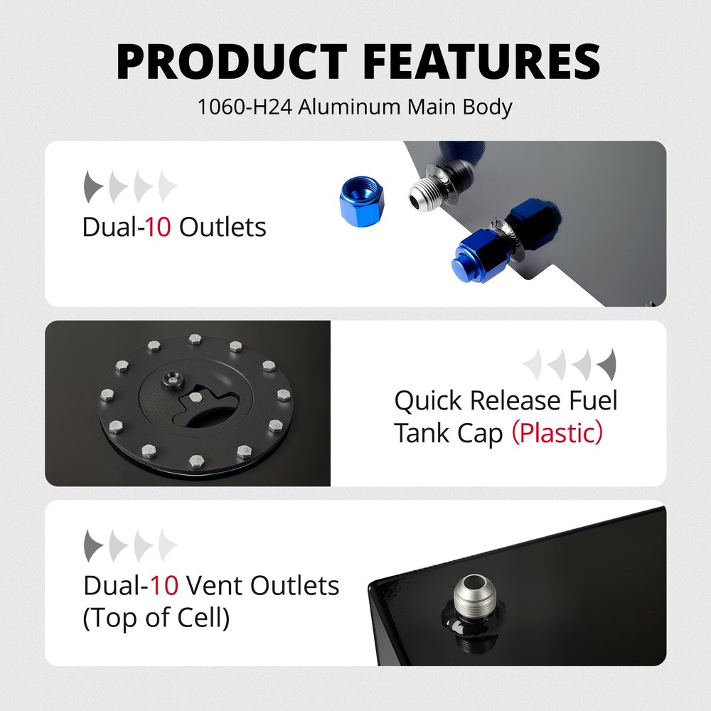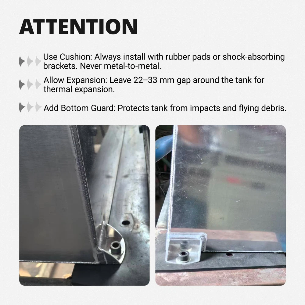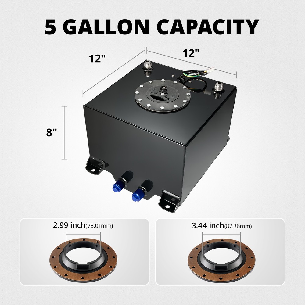 Fitment Attributes Brand:TEMBOR Condition:New Surface Finish:Polished UPC:Does not apply. Cap Material:Plastic Color:Black Dimensions:12" (L) x 12" (W) x 8" (H) Manufacturer Warranty:1 Year Material:Aluminum Placement on Vehicle:Front, rear Type:Fuel Tank Fuel Type:Gasoline Volume:5 Gallon Key Benefits Made from durable aluminum material for long-lasting performance. Polished surface finish adds a sleek look while providing rust resistance. Offers a 5-gallon capacity, ideal for extended driving without frequent refueling. Lightweight design facilitates easier installation and reduced weight on the vehicle. Comes with a 1-year manufacturer warranty for peace of mind. Installation Guide Ensure the vehicle is parked on a flat surface and the ignition is off before starting the installation. Carefully remove the old fuel tank if applicable, and dispose of it according to local regulations. Position the new 5-gallon fuel tank in the intended placement area (front or rear of the vehicle). Secure the tank using the appropriate mounting brackets and hardware. Connect the fuel lines, ensuring a snug fit to prevent leaks, and secure all connections. Test for leaks by adding a small amount of gasoline and monitoring for any signs of leakage before using the vehicle. Important Notes This fuel tank is designed for use with gasoline only. Always consult your vehicle's service manual for compatibility and installation recommendations. Regularly inspect the tank and fittings for wear and tear to maintain safe operation. Do not exceed the recommended volume of the tank for optimal performance and safety. Check local regulations regarding fuel tank installation and usage to ensure compliance.