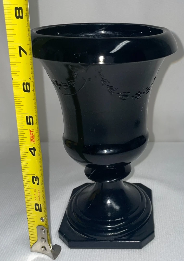 Black Amethyst Glass Pedestal Urn Vase Garland Pattern 7 Inches High. Pre-owned, no chips or cracks, A beautiful garland pattern. The urn measures 7 inches high with a 5 inch opening across top. The base measures 4 inches square. The purple shows through under flash light. Hand wash only. ATTENTION REGARDING SHIPPING !! Shipping costs are expensive. Here is an offer that is hard to refuse. If you buy 2 or more items totaling $50 or more , I will handle the shipping cost (ground) anywhere in the continental United States. The items cannot be listed as having to be shipped alone due to SPECIAL PACKING NEEDS . eBay does not adjust the shipping cost removal from the invoice automatically. I can do it on the final invoice after you have the items in your shopping basket, before you pay. If eBay forces payment before that is done, you will receive a refund of shipping cost made before your package is shipped within the first business day following the transaction. The free shipping offer does not apply to Priority or Expedited shipping, although we can discuss a fair reduction in shipping cost should you desire the shipping upgrade. LOOKING FOR LESS EXPENSIVE SHIPPING? Click on "See details" next to Expedited Shipping Fee above to see other shipping options. eBay calculates the shipping fee based on package size, weight and type of shipping you select. SOME ITEMS CANNOT BE COMBINED WITH OTHER ITEMS DUE TO UNIQUE PACKAGING CHARACTERISTICS. THERE WILL BE A NOTE (here) IN THE LISTING WHEN COMBINED SHIPPING CANNOT BE USED. SAVE SHIPPING COSTS! – USE COMBINED SHIPPING Shipping costs are high. The best way to save money on shipping costs is through combined shipping,… purchasing more than 1 item and having them shipped together. The cost per item drops substantially. To do this you MUST NOT pay for items until after the combined shipping cost has been calculated on the invoice. If you pay before this has been done you will end up paying the individual shipping cost for each item, and I am unable to issue refunds for shipping overpayments when this occurs because eBay does not refund the fees they charge me on the refunded amount.